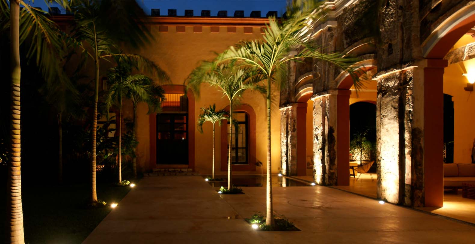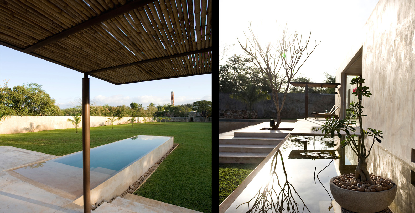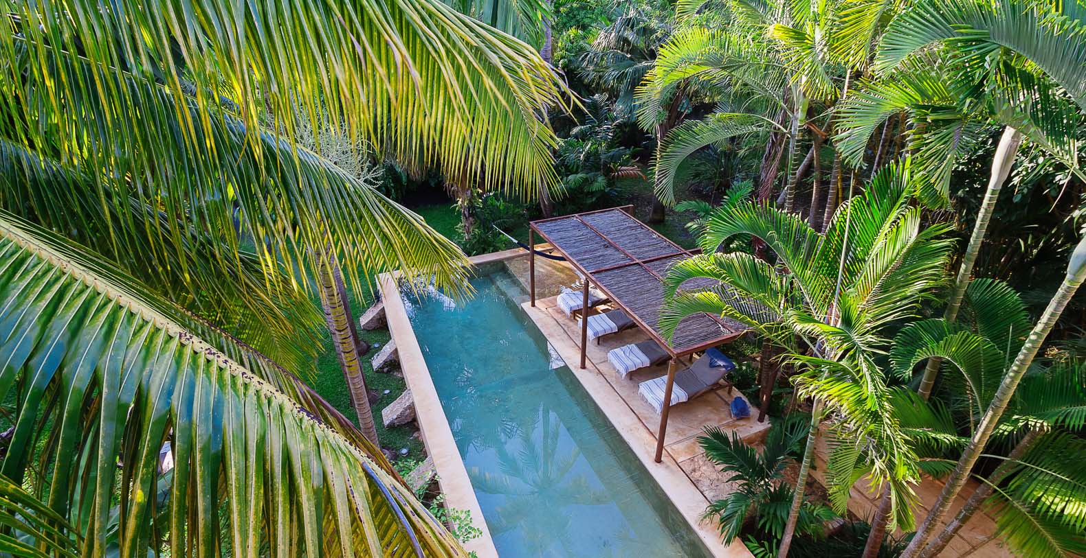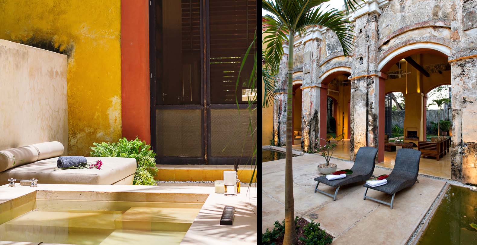 Throughout the hacienda there is evidence of its previous utilitarian life. Iron wheels and massive beams are remnants of its past. Once the water tank for the hacienda, the pool is now a shimmering refuge from the heat of the Yucatan. A steel and bamboo pergola and a playita of shallow water with a hammock suspended above provide areas for rest and shade. We have six chaise lounges for your relaxation. The open-air living room and dining pavilion, the Loggia is surrounded by lily and fish filled reflecting water ponds and dramatic lighting. From the loggia climb an enclosed spiral staircase to the roof top lounge area and a star gazing platform. Here you can watch the moon, stars, sunset, an approaching storm or enjoy the night breeze. Framing the entire hacienda are dry stacked stone walls, tall hedges of Fica and walls creatively designed with metal cages filled with local limestone. The grounds are filled with exotic rare palms, bamboos, gingers, tropical plants and fruit trees.