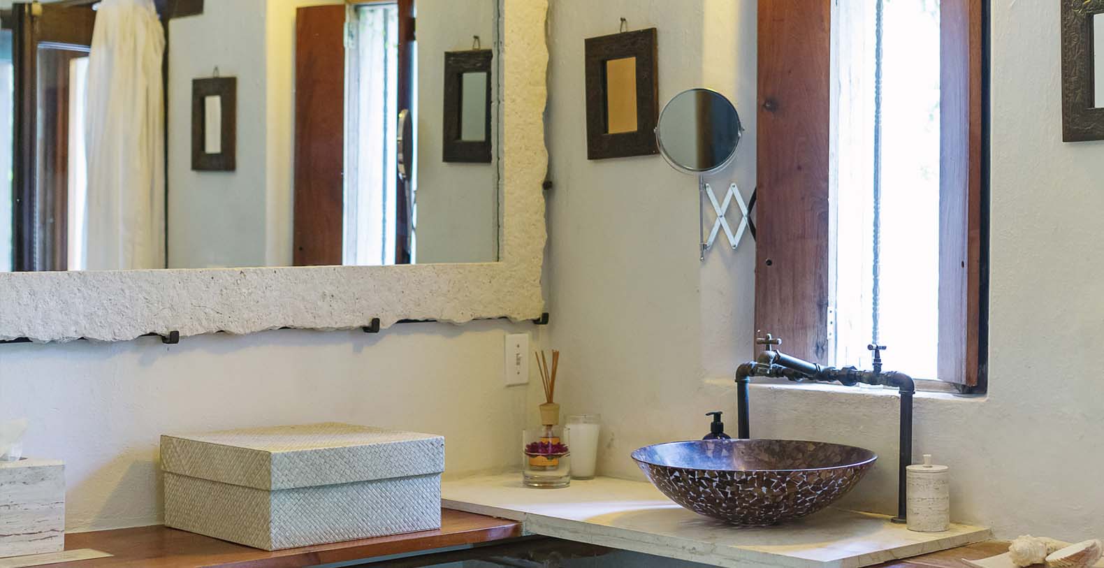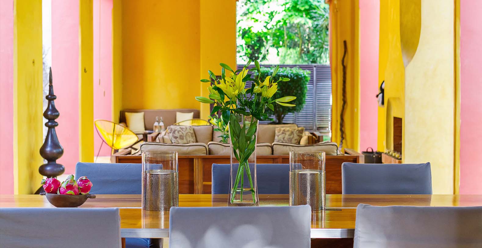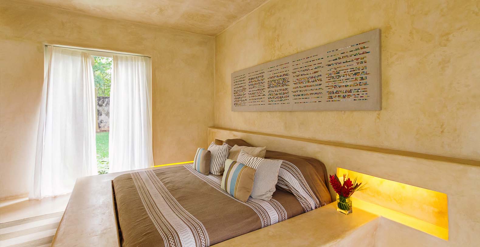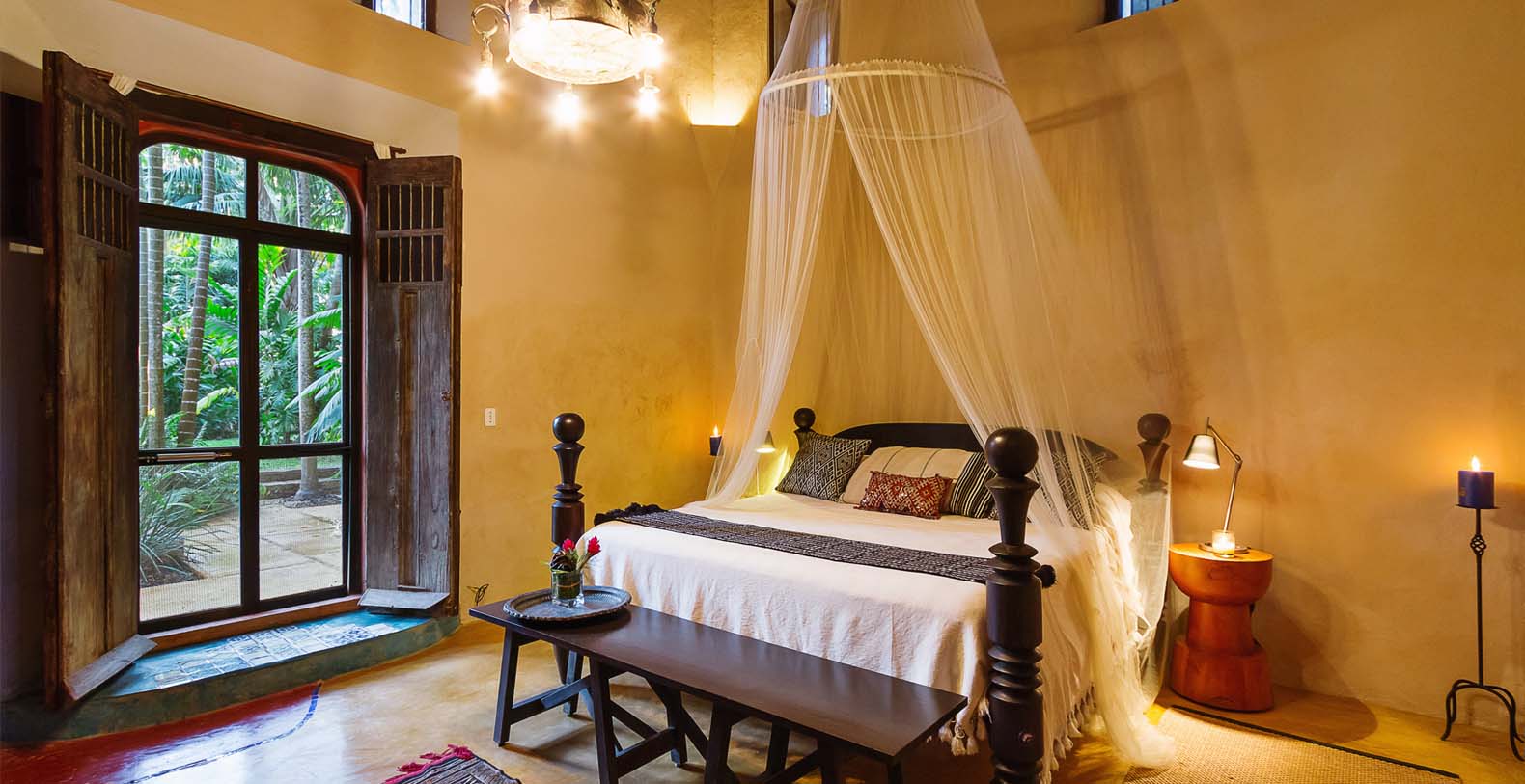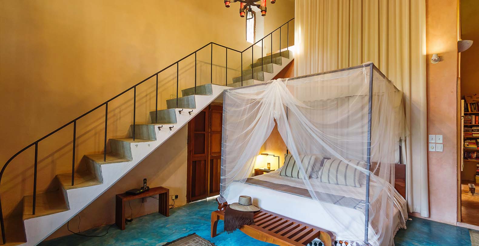 Throughout the hacienda there is evidence of its previous utilitarian life. Iron wheels and massive beams are remnants of its past. Once the water tank for the hacienda, the pool is now a shimmering refuge from the heat of the Yucatan. A steel and bamboo pergola and a playita of shallow water with a hammock suspended above provide areas for rest and shade. We have six chaise lounges for your relaxation. The open-air living room and dining pavilion, the Loggia is surrounded by lily and fish filled reflecting water ponds and dramatic lighting. From the loggia climb an enclosed spiral staircase to the roof top lounge area and a star gazing platform. Here you can watch the moon, stars, sunset, an approaching storm or enjoy the night breeze. Framing the entire hacienda are dry stacked stone walls, tall hedges of Fica and walls creatively designed with metal cages filled with local limestone. The grounds are filled with exotic rare palms, bamboos, gingers, tropical plants and fruit trees.