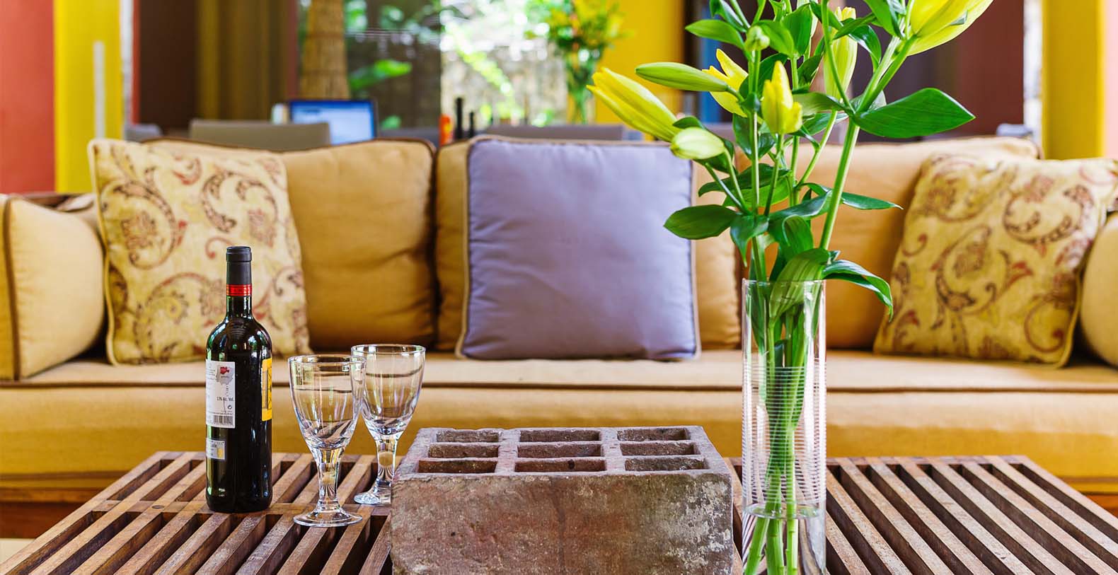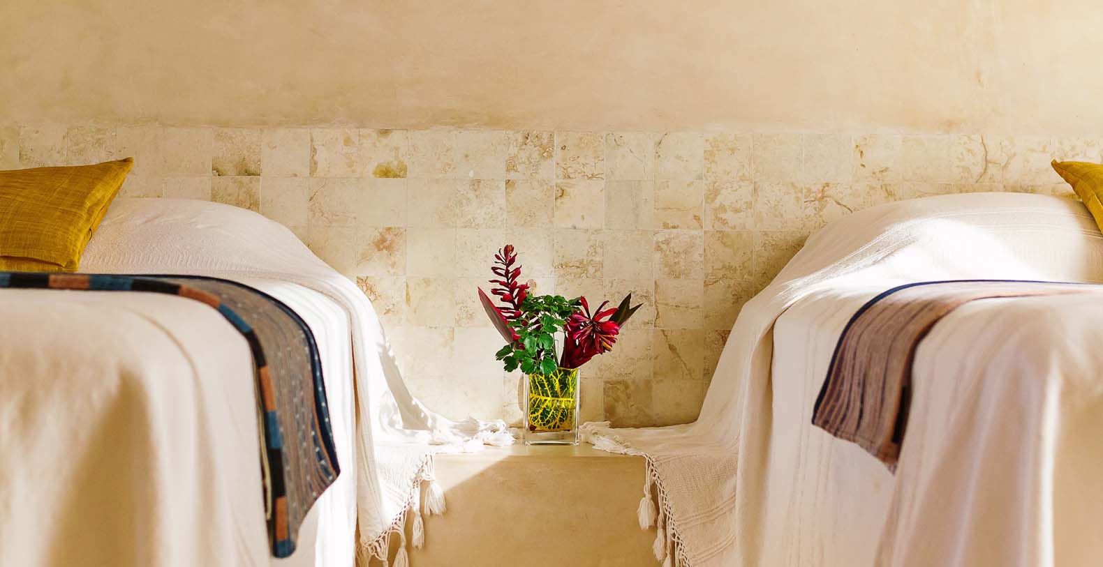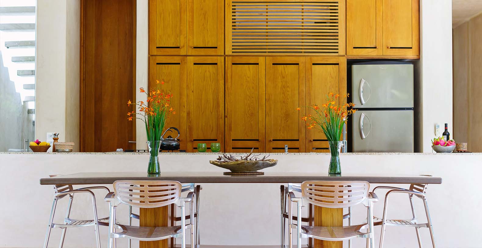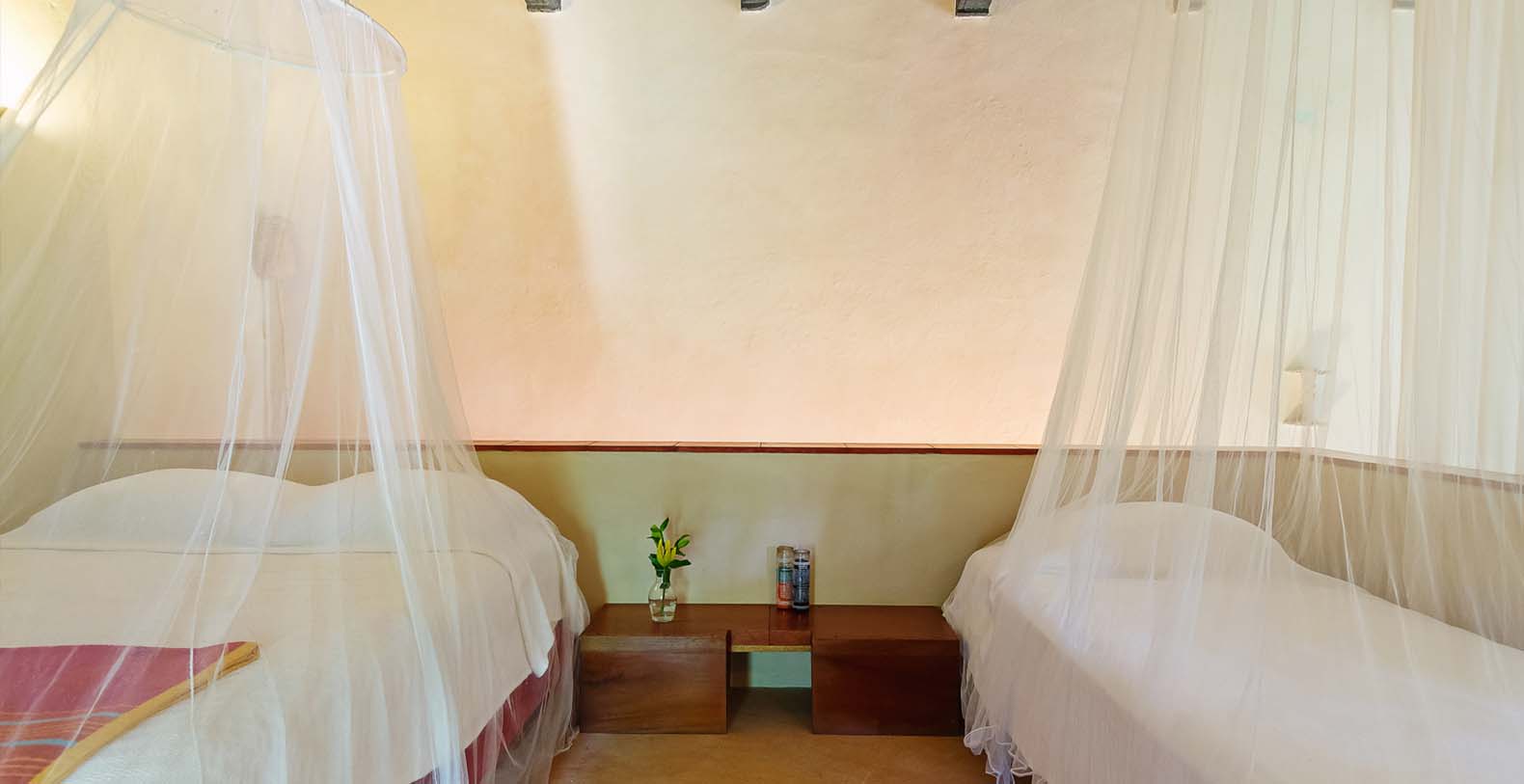 Throughout the hacienda there is evidence of its previous utilitarian life. Iron wheels and massive beams are remnants of its past. Once the water tank for the hacienda, the pool is now a shimmering refuge from the heat of the Yucatan. A steel and bamboo pergola and a playita of shallow water with a hammock suspended above provide areas for rest and shade. We have six chaise lounges for your relaxation. The open-air living room and dining pavilion, the Loggia is surrounded by lily and fish filled reflecting water ponds and dramatic lighting. From the loggia climb an enclosed spiral staircase to the roof top lounge area and a star gazing platform. Here you can watch the moon, stars, sunset, an approaching storm or enjoy the night breeze. Framing the entire hacienda are dry stacked stone walls, tall hedges of Fica and walls creatively designed with metal cages filled with local limestone. The grounds are filled with exotic rare palms, bamboos, gingers, tropical plants and fruit trees.