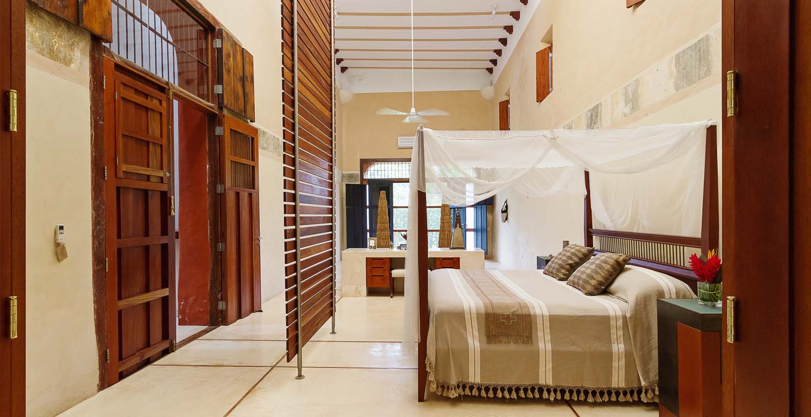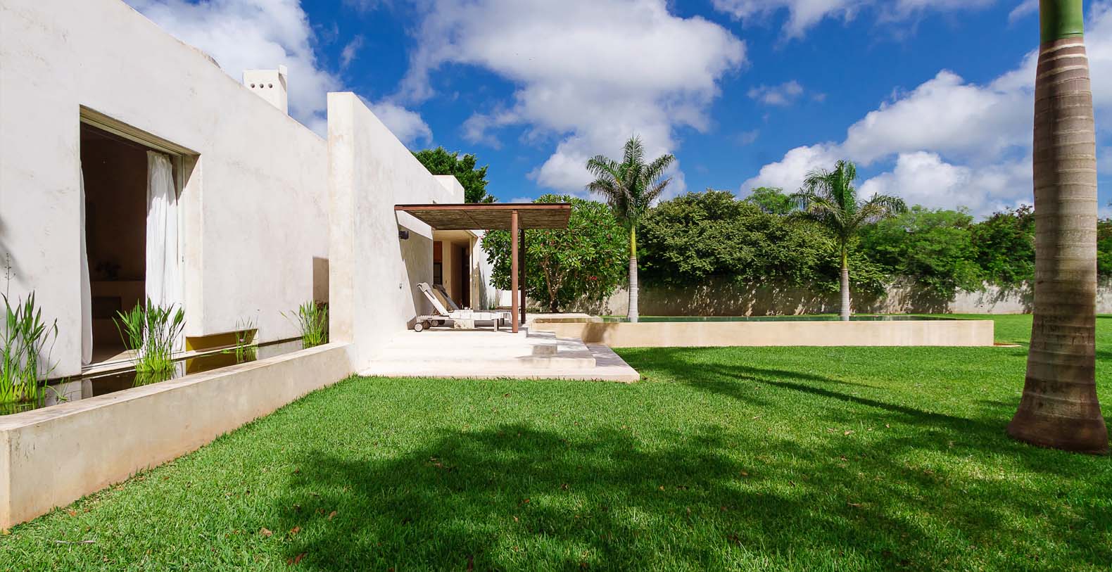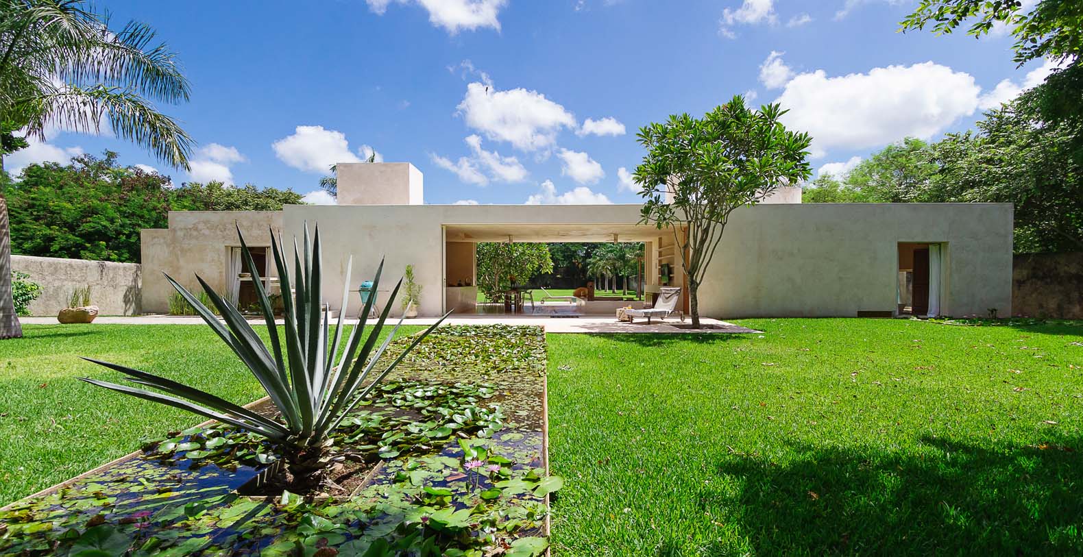 In addition to the loggia restoration and the new rooftop and Bocce Ball court we have a new hacienda entrance, driveway, bodega and a new 2100 sq.ft. 2 br, 2 bath guest house. This house is called Casa Sisal. Although this home was designed in the modern aesthetic, the construction techniques and materials are the same as the hacienda. Surrounded by water lily filled reflecting ponds it was built in the henequen drying fields, adjacent to the hacienda. It is on 3 acres and is surrounded by a 10-foot historic hacienda wall. There is a modern kitchen, a dining area for 8-10 and a sunken living room with fireplace and a flat screen monitor for DVD viewing, and the house is wired for sound and i pod ready. There is a King in one bedroom and 2 Queens in the other. In the master bathroom the shower can open to an enclosed garden. There is a 30 ft edgeless pool with a playita of shallow water. The home is fully screened and air conditioned. This house also has access to the bocce ball court. It is a comfortable private enclave. A winding driveway from the main entrance leads to a private parking area.
