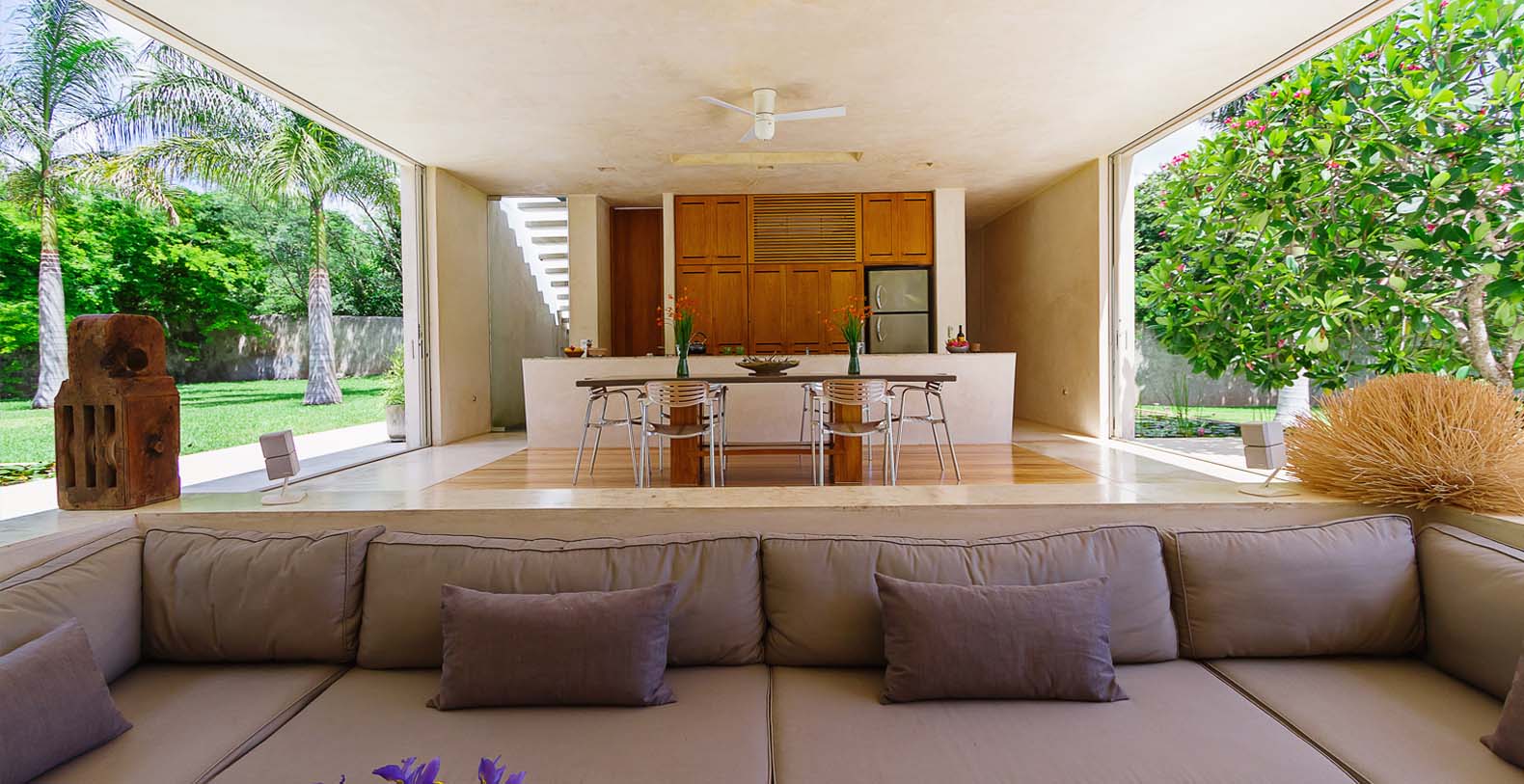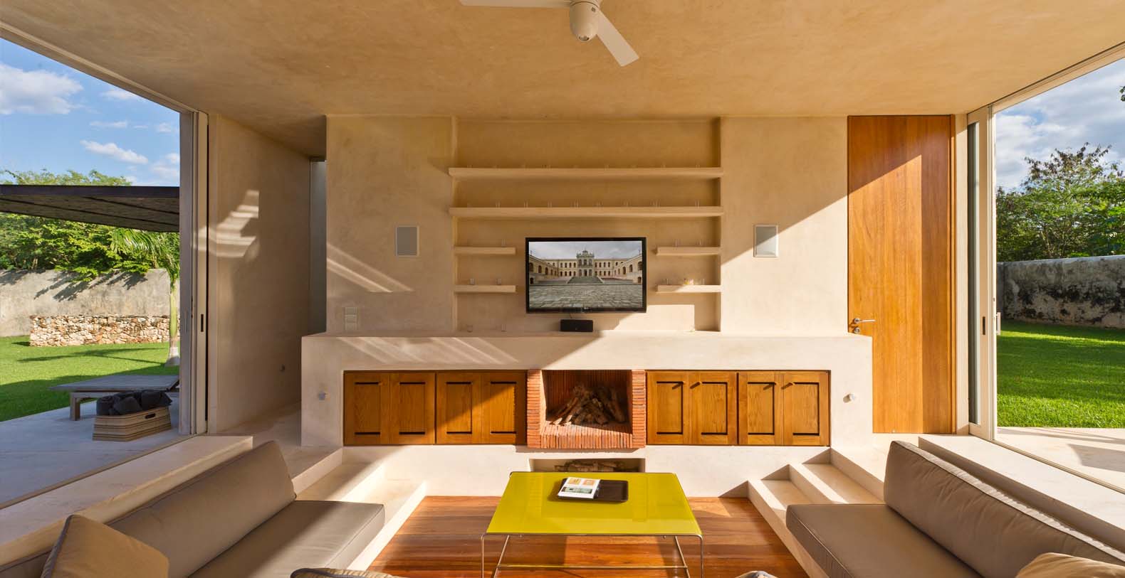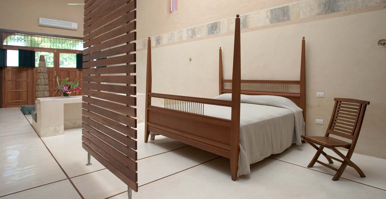 In addition to the loggia restoration and the new rooftop and Bocce Ball court we have a new hacienda entrance, driveway, bodega and a new 2100 sq.ft. 2 br, 2 bath guest house. This house is called Casa Sisal. Although this home was designed in the modern aesthetic, the construction techniques and materials are the same as the hacienda. Surrounded by water lily filled reflecting ponds it was built in the henequen drying fields, adjacent to the hacienda. It is on 3 acres and is surrounded by a 10-foot historic hacienda wall. There is a modern kitchen, a dining area for 8-10 and a sunken living room with fireplace and a flat screen monitor for DVD viewing, and the house is wired for sound and i pod ready. There is a King in one bedroom and 2 Queens in the other. In the master bathroom the shower can open to an enclosed garden. There is a 30 ft edgeless pool with a playita of shallow water. The home is fully screened and air conditioned. This house also has access to the bocce ball court. It is a comfortable private enclave. A winding driveway from the main entrance leads to a private parking area.