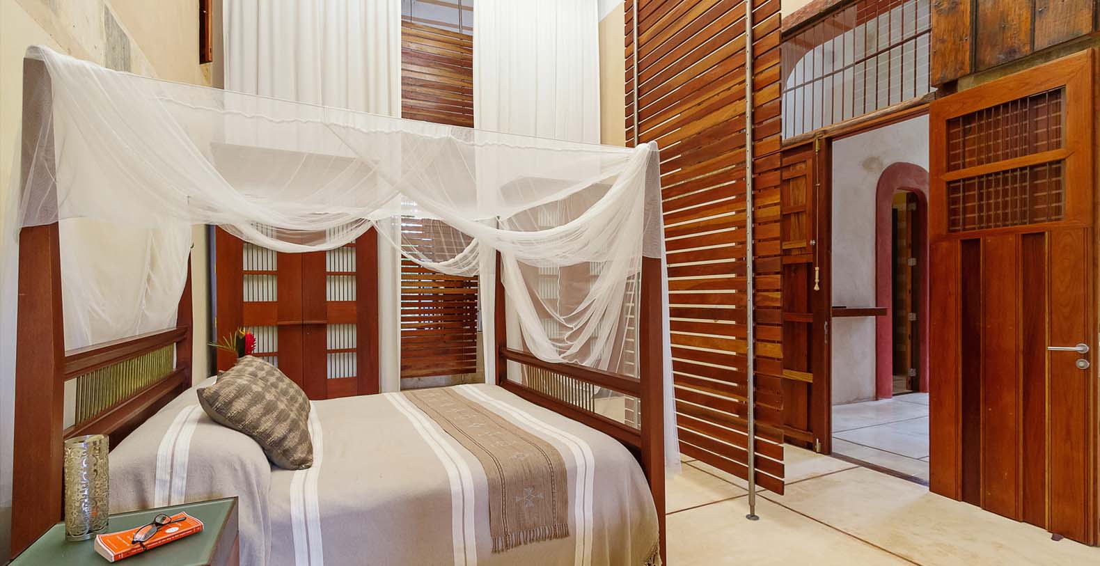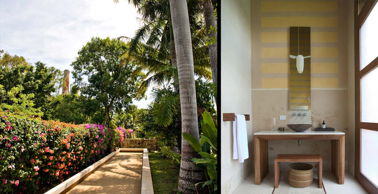 Casa Vieja houses the living room, 2 king bedrooms, a loft bedroom and 2 bathrooms and the colonial kitchen. Opposite the Casa Vieja is the casa Nueva, where a dramatic central hallway is the entrance to 3 bedrooms and 3 bathrooms all with soaring 26’ ceilings and 13’ high doors. The large master has a sunken living area, and outside within a walled garden is a settee and plunge pool. Between these two buildings is an open-air living room and dining room, the loggia. From the loggia climb a staircase to a rooftop lounge and a star gazing platform. Through a seashell mosaic tunnel from the inner courtyard you find the 40-foot pool and regulation size bocce ball court.