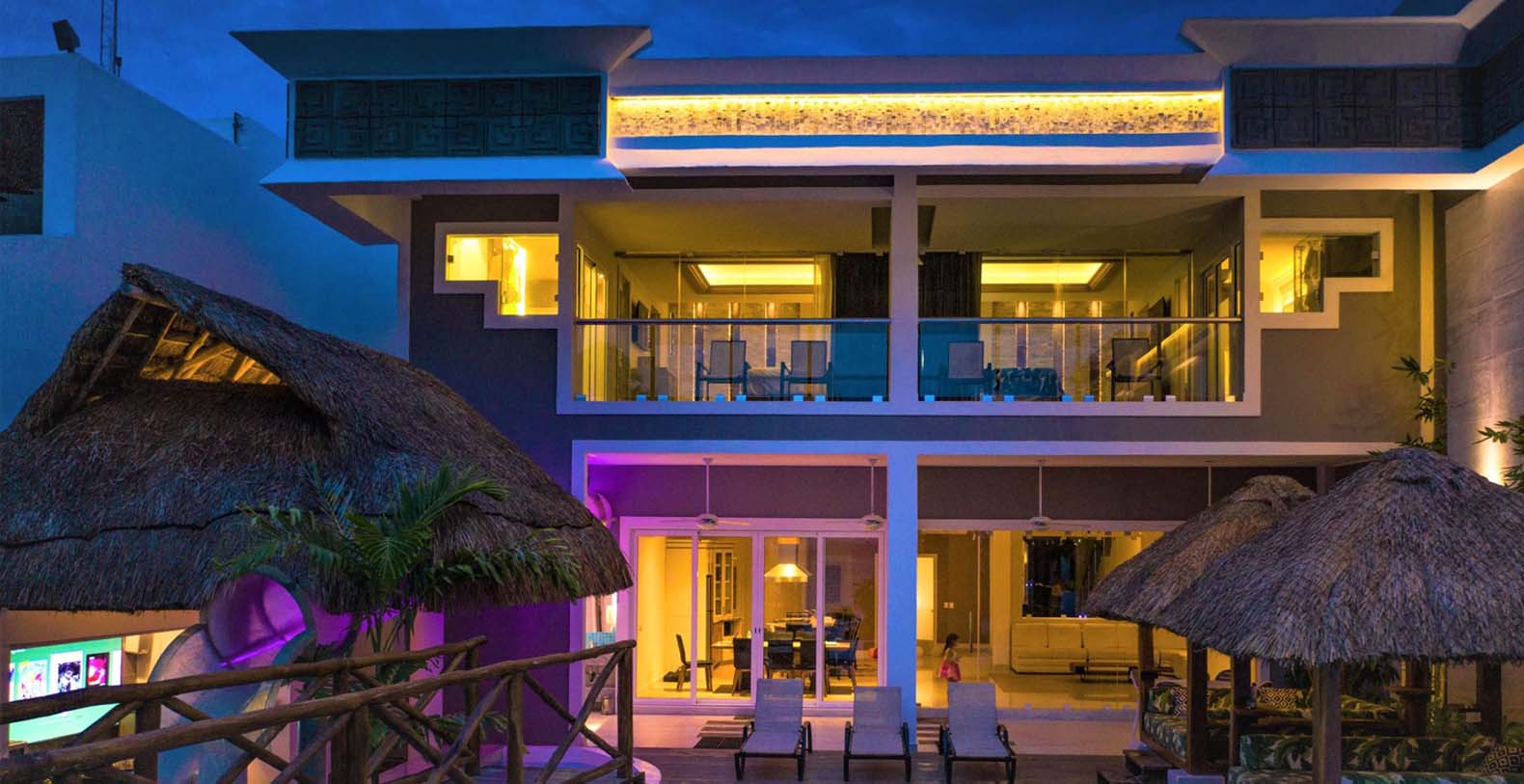 The Private Paradise Villa gated complex is dripping with imagination and hi-tech equipment inside and out, delivering an overall group family vacation experience that is out of this world. The ocean-view great room not only features an expansive theater screen that magically lowers over the living room windows, our ever popular gather-around Hibachi griddle dining experience and hilarious Shadow Theater to dance and sing-in but Private Paradise also showcases the Penthouse Plummet, a 250 feet long waterslide - with Rock & Roll sound and light-show – that travels through the house!