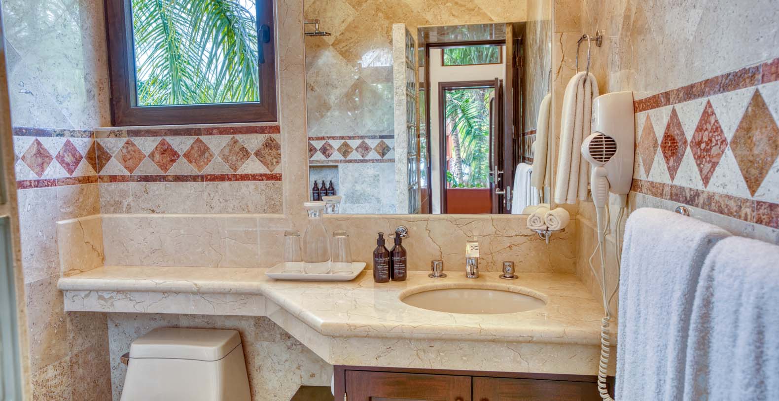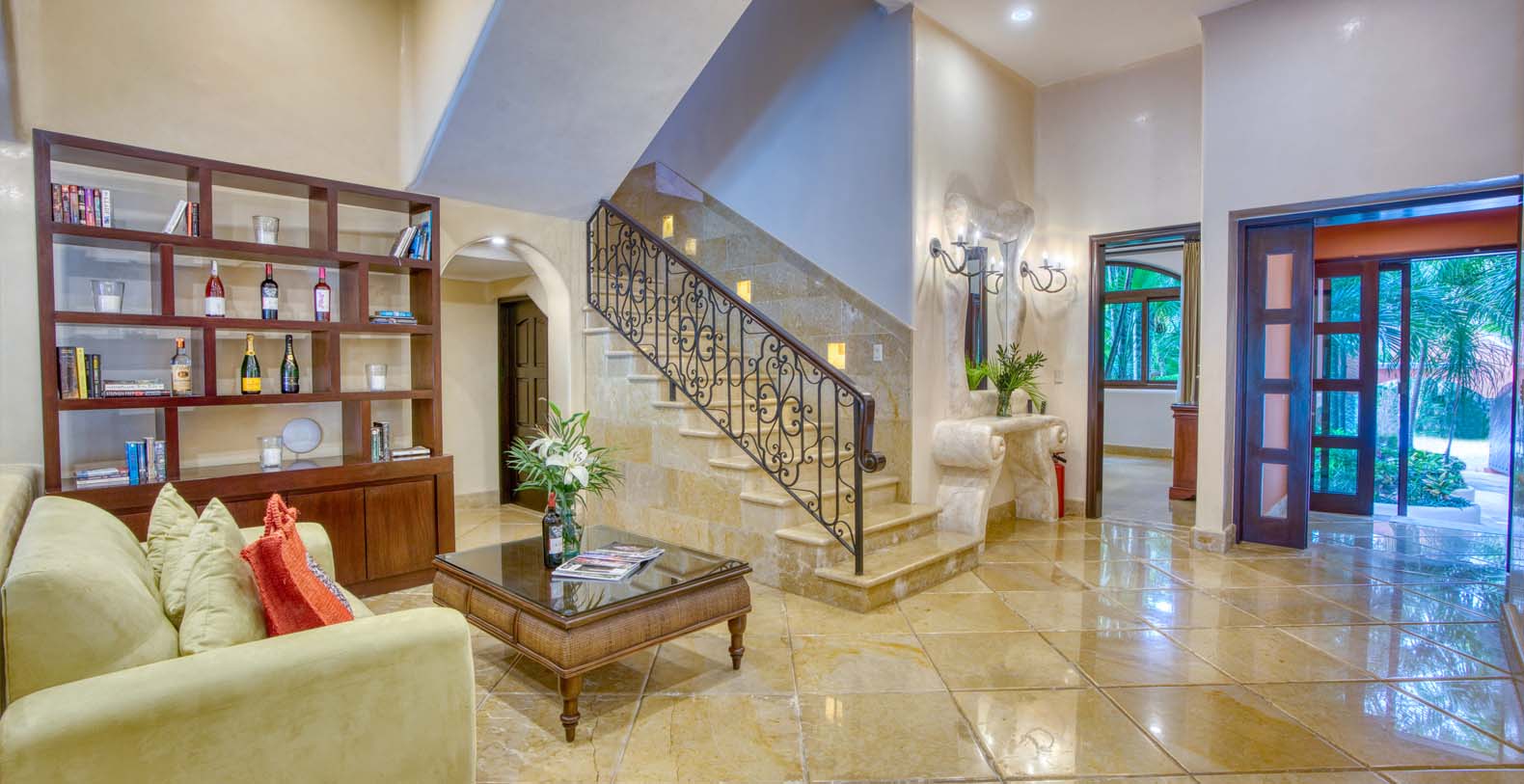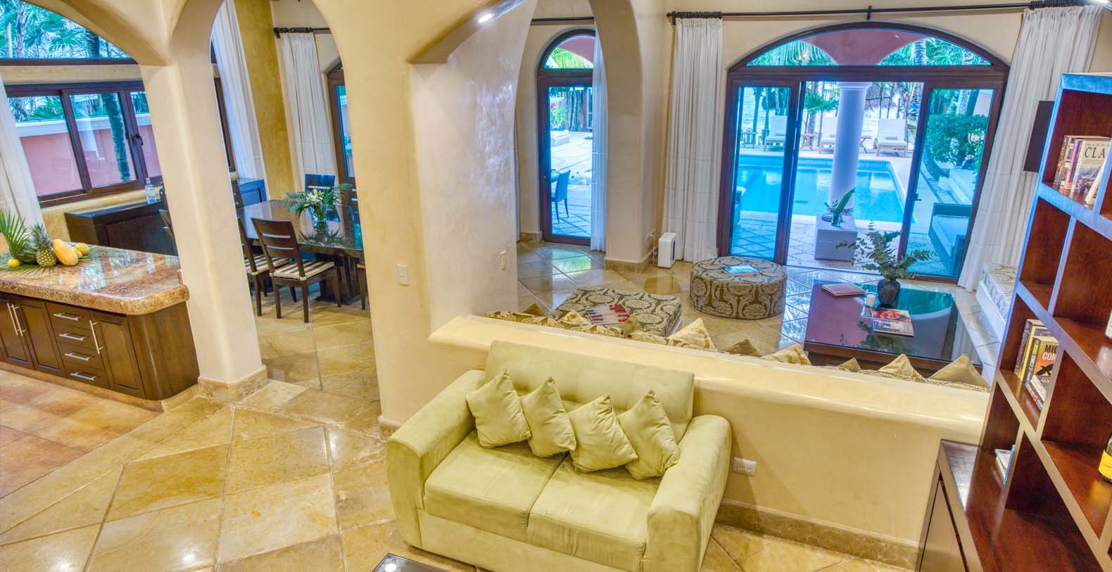 There are two living areas at Sueno del Mar. The first one can accommodate all guests comfortably with a spectacular view of the pool and the beach that is ideal for relaxing and entertainment. The pool is also equipped with an outdoor shower for your comfort. The second living area is located at the villa's entrance. Free internet access is available, which is ideal for modern travelers. Our manager also offers personal assistance, which includes planning and booking authentic Mayan excursions, and massages in the comfort of your dream vacation home. We also offer full-time caretakers.