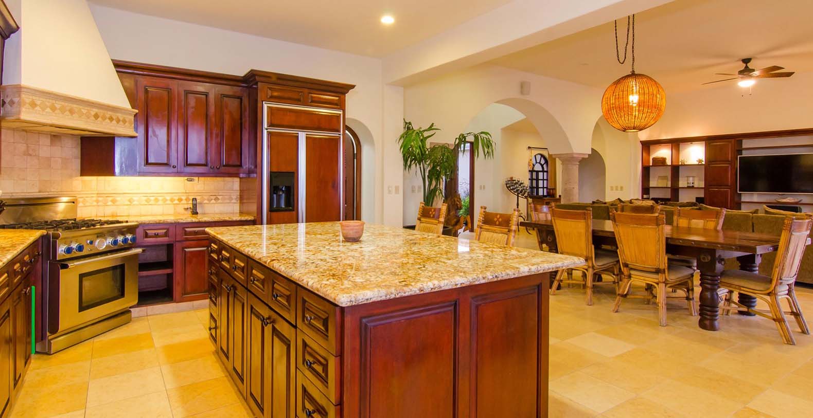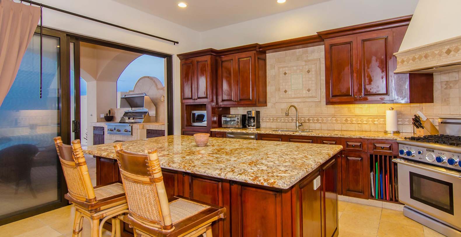 The private terrace off the spacious primary bedroom draws the eye, with its magnificent ocean views, though those vistas have competition from the high-definition broadcasts from the bedroom’s 42” TV. The fourth bedrooom is a tastefully designed 800-square-foot casita, with a private bath and spacious terrace. Bedrooms and baths have elegant marble floors. Refined stone and granite kitchen counters meet their match in the quality of the kitchen appliances.