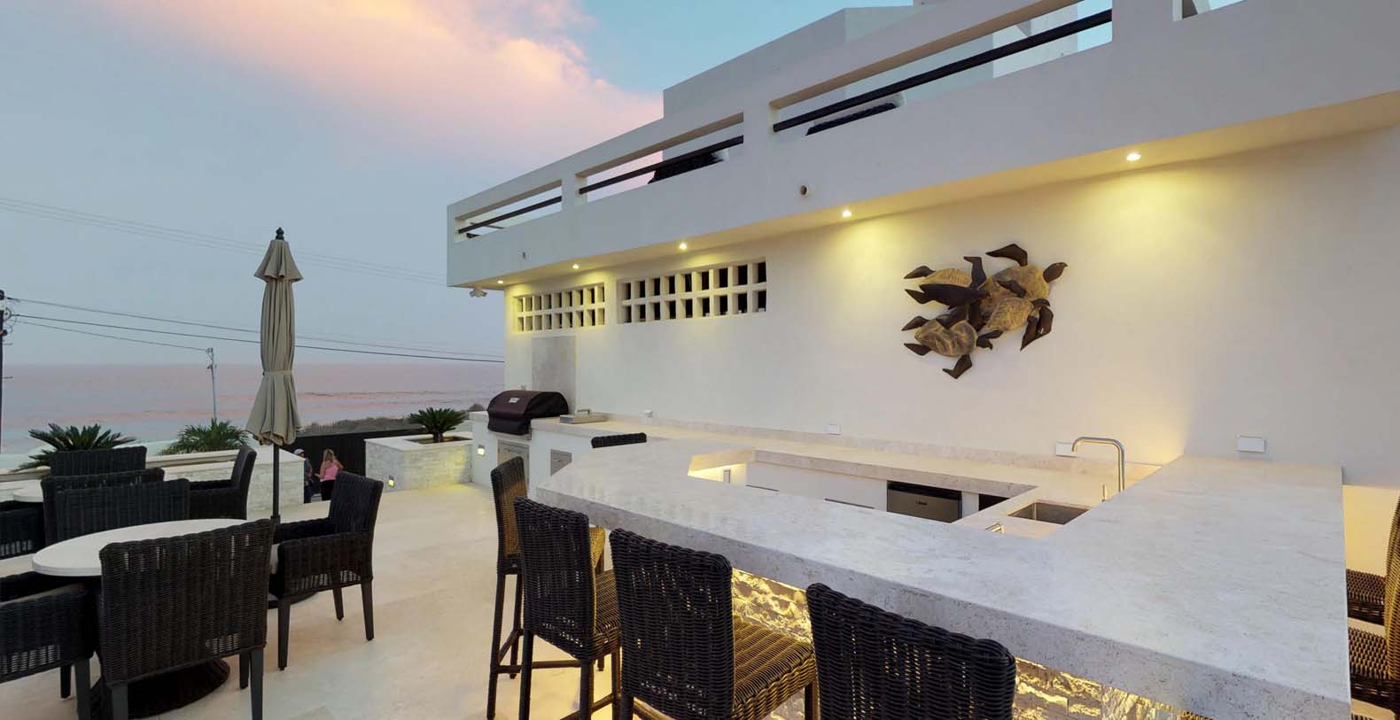This spacious retreat boasts a prime location with sweeping views of the Sea of Cortez, mountains, golf course and marina. You and your guests will enjoy the expansive swimming pool and spa, as well as the inviting marble terrace. Gather for drinks with friends at the outdoor bar, or relax in one of the chaise lounges in the sunshine. Head to the rooftop deck, complete with a bar, chairs and table, to enjoy the breathtaking panoramic views surrounding your private retreat.