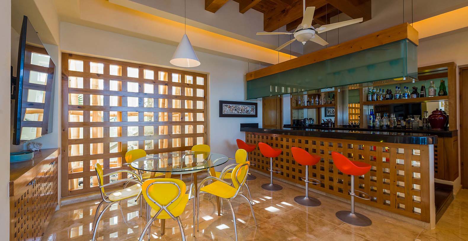 On the first floor, the jacuzzi and pool converge with the living room, dining room and kitchen in a large open plan space that integrates the indoor and outdoor experience, enhanced by fully folding doors. Our well-appointed bar with an ice machine has a 75” TV where you can enjoy the sporting events you like and a round table to play your favorite board games while enjoying delicious mixed drinks and cocktails prepared by our staff.