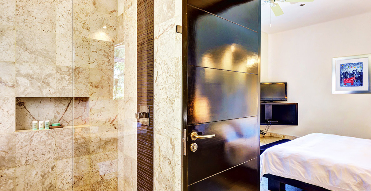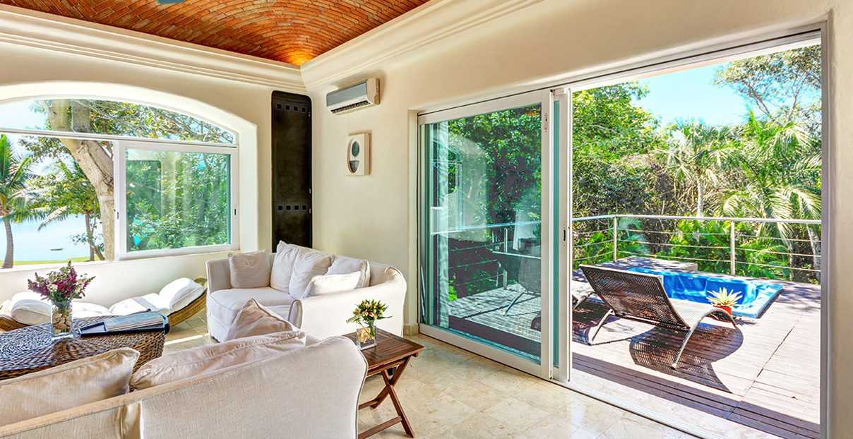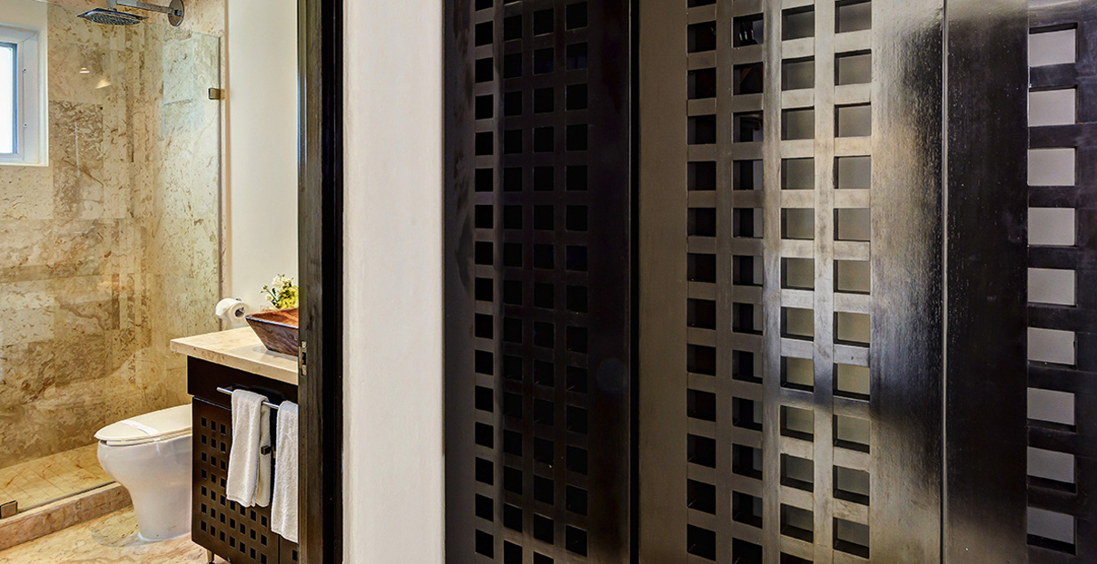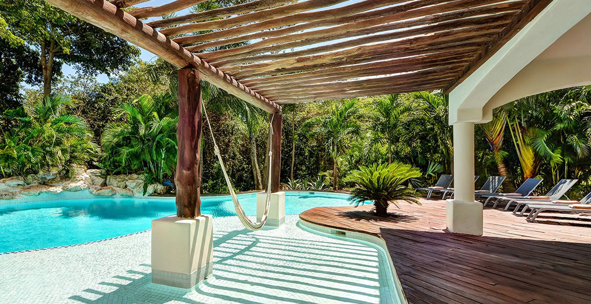 Villa Saasil it is one of the best Playa del Carmen rental properties on the market today. Its three-level pool is surrounded by wooden floors that start right outside the living room. The relaxing sound of cascading water is perfect for an afternoon nap in hammock, set right over the water. The first level of the pool, just a few inches deep, is a great place to relax under a wood log ceiling. The spacious living room with arched red brick ceiling has an open loft design that offers panoramic views of the golf course. Enjoy the pleasant scene right from your jacuzzi, set on a lovely terrace with wooden deck.