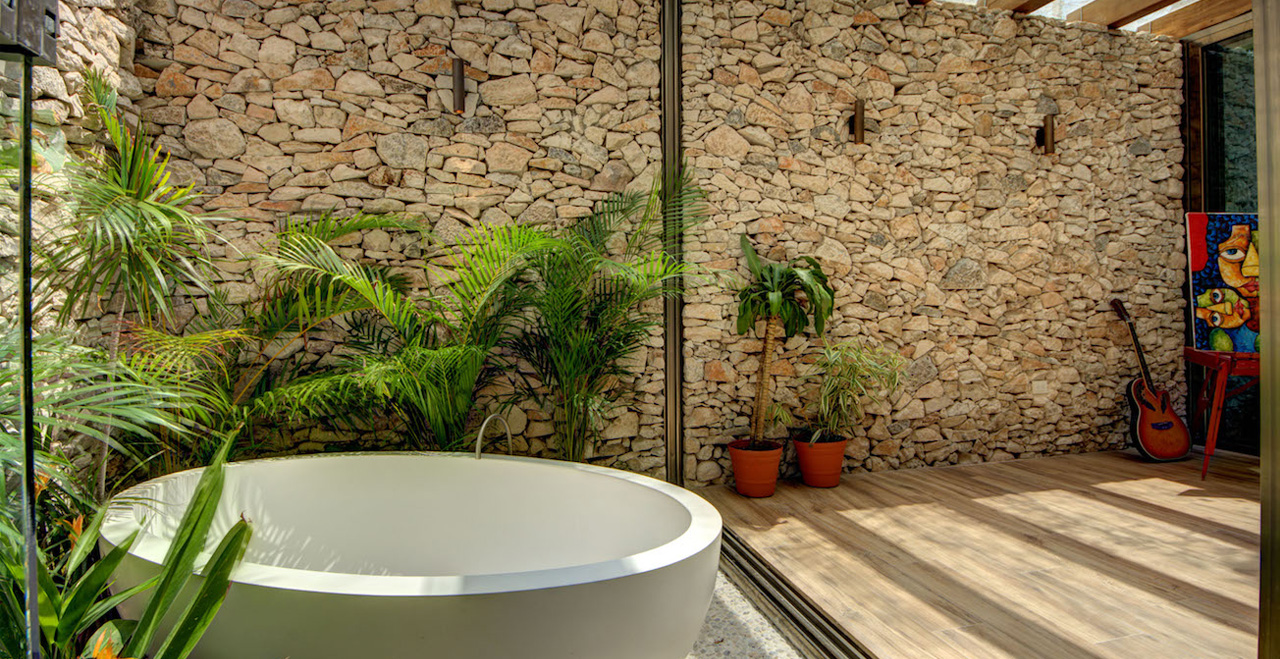 There is a beautiful connection between the indoors and the outdoors. The living area fully opens to the pool. The master bathroom has an open air bathtub in the garden - soak and watch the stars. The open rooftop is the ultimate sunset spot with jungle views.