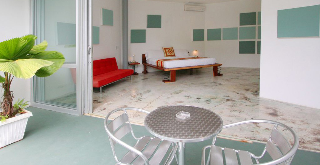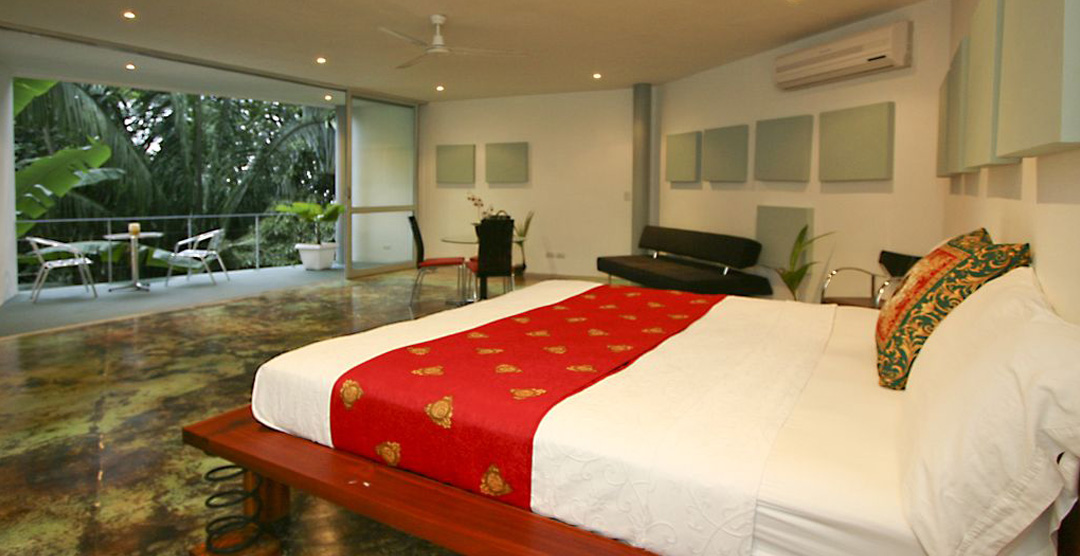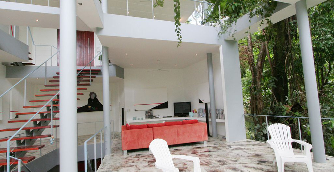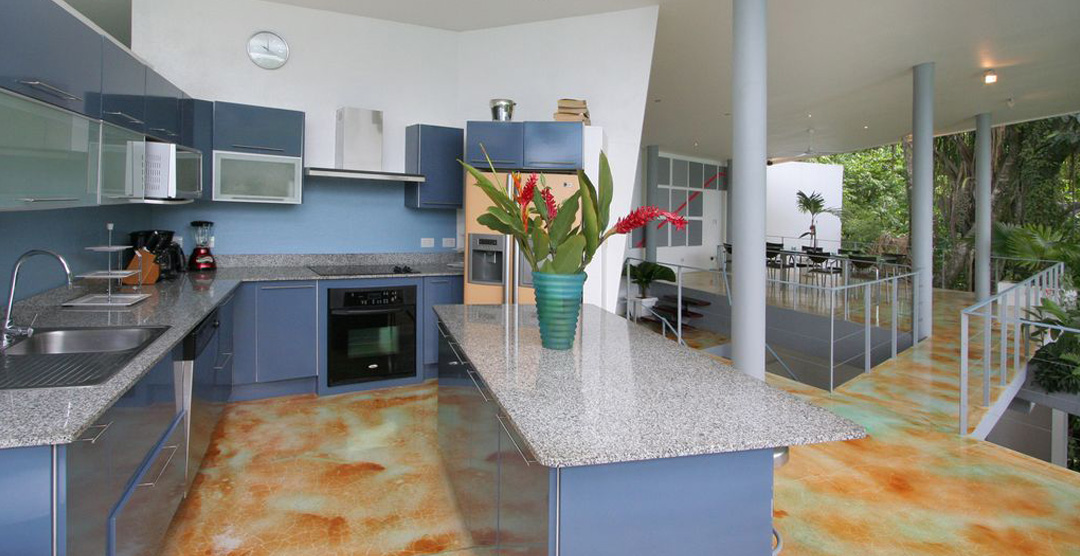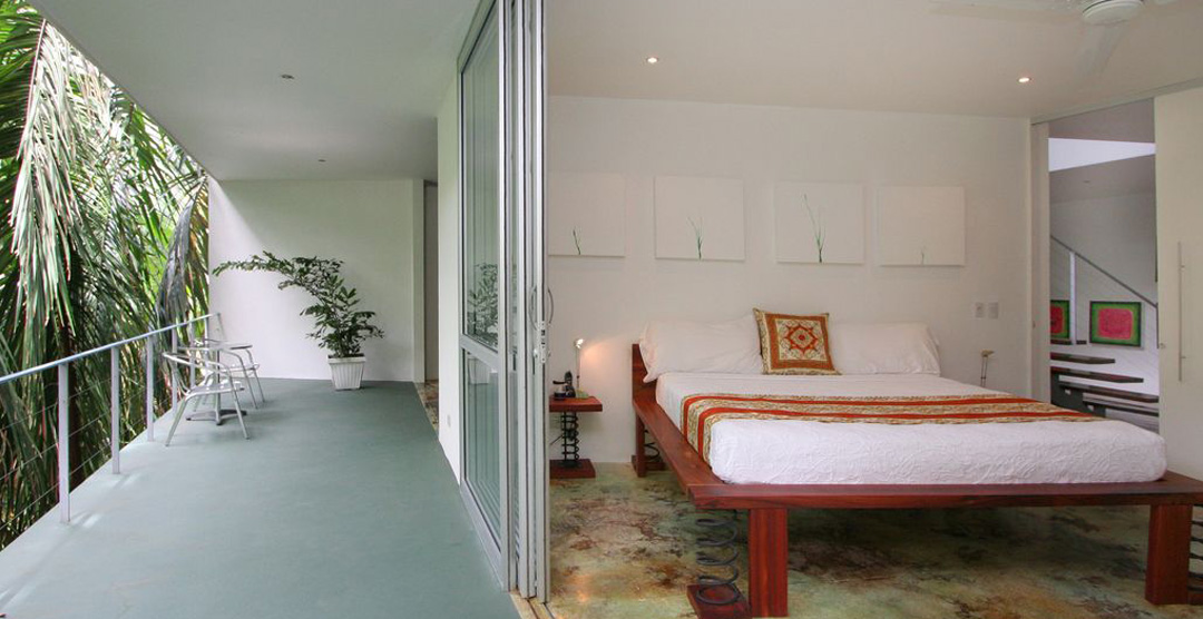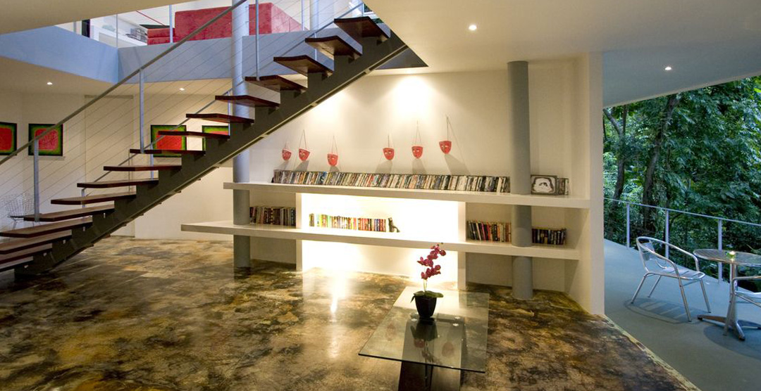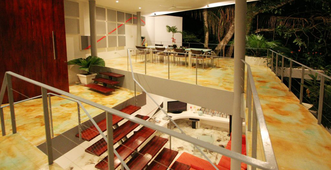 Casa Elsa is an open concept house. There are very few walls or doors in the house itself, except for the 4 bedrooms and ensuite baths. The house sports several floors, each offering a unique view of the Costa Rican jungle. Casa Elsa's design also exposes one to the elements. Visitors will feel the cool coastal breeze blow into every room of this luxury home. During the day, Casa Elsa is brightly illuminated by indirect sunlight which compliments the artistic elements of the house such as the acid-etched concrete floors and brightly decorated walls.