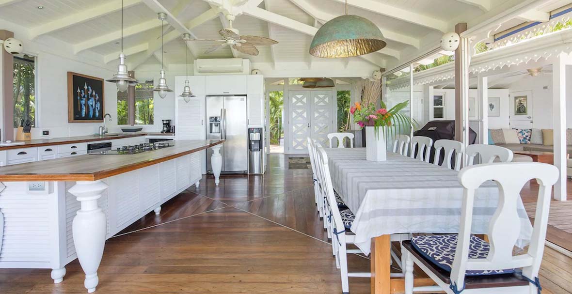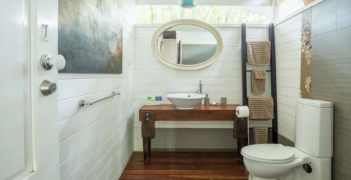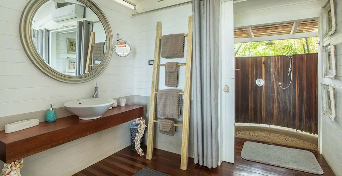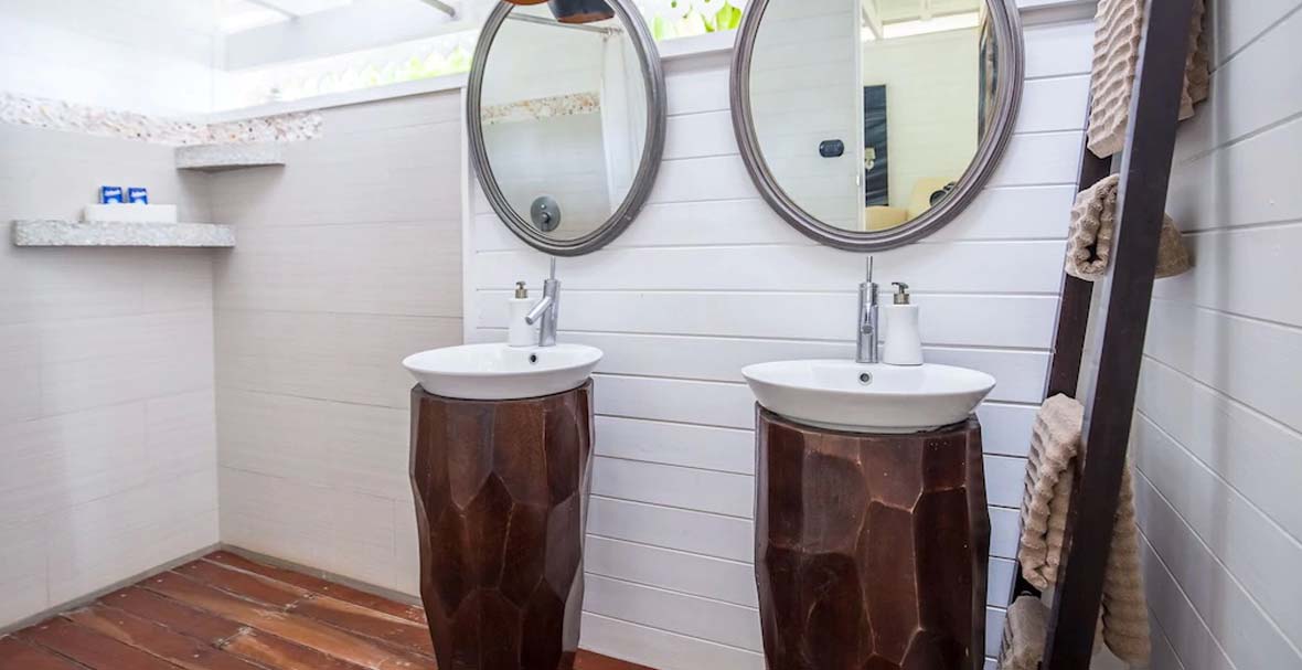 The Master Suite has Queen sized bed with Wood Tub and Shower, is air-conditioned, has ceiling fan, and a safe in the bedroom. Bedroom 2 has a Queen sized bed, shower, air-conditioning and a ceiling fan. Bedroom 3 has a Queen sized bed, shower, air-conditioning and a ceiling fan. Bedroom 4 has a Queen sized bed, a shared shower, air-conditioning, and a ceiling fan. The 5th bedroom has two twin sized beds, shared shower, air-conditioning, and a ceiling fan.