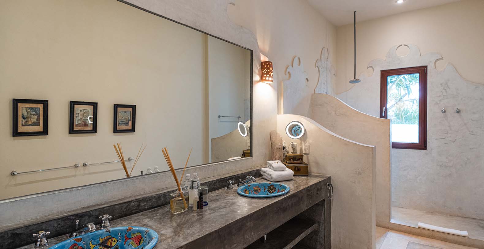 From the moment you walk through the villa gates you will be enchanted, the heart shaped tropical garden complete with cenote leads to the impressive villa. Entering the home you are transported to a world of luxury hacienda style. The center of the villa is a courtyard, from which you can see the true blue of the ocean beckoning you. On the lower floor, off the courtyard there are 2 living rooms, one of which has a huge flat screen TV with satellite, enormous gourmet kitchen with all modern conveniences and the Cariño Suite with 2 queen beds and ensuite bathroom. There is also a massage room, where you can enjoy blissful relaxing massages. There is a large ocean front covered terrace, where you will enjoy many delightful evenings with family and friends dining al fresco. There is a BBQ gas grill for those wishing to cook the catch of the day.