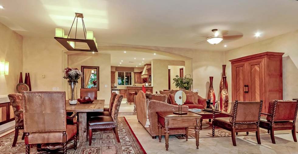 The heart of Encanto is its open-plan great room, whose hacienda-style furnishings combine European elegance with a relaxed, inviting feel. Settle in to one of the plush sofas, gather around the artfully weathered dining table or perch at the bar in the well-equipped kitchen, which has a microwave, toaster, coffee maker, plus a blender for all your cocktail needs.