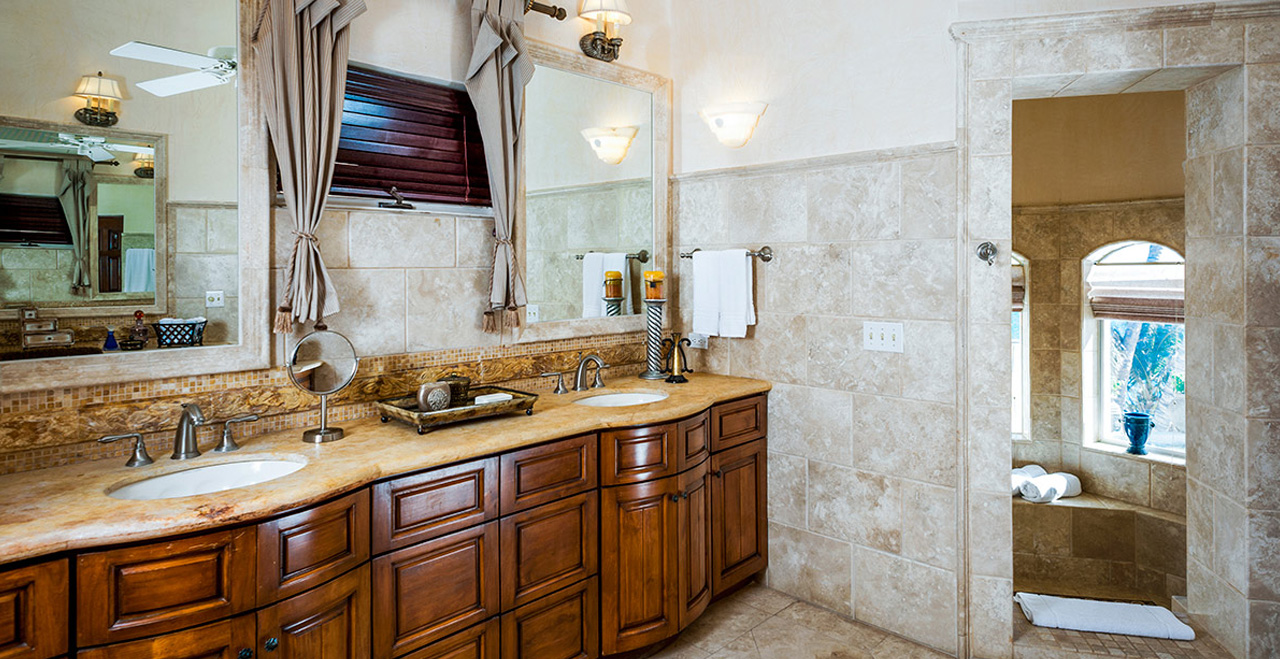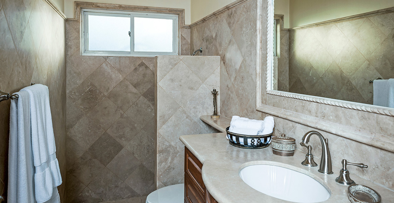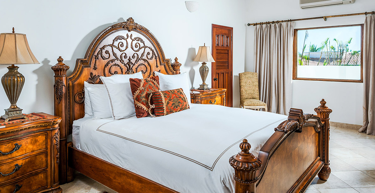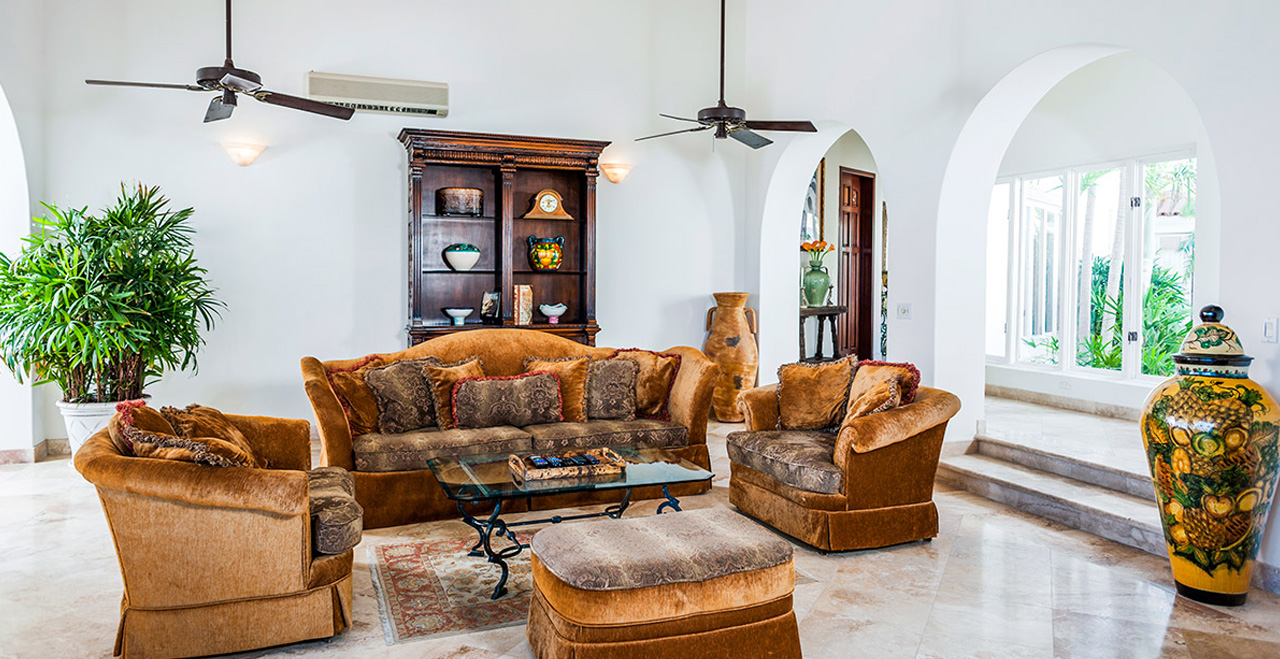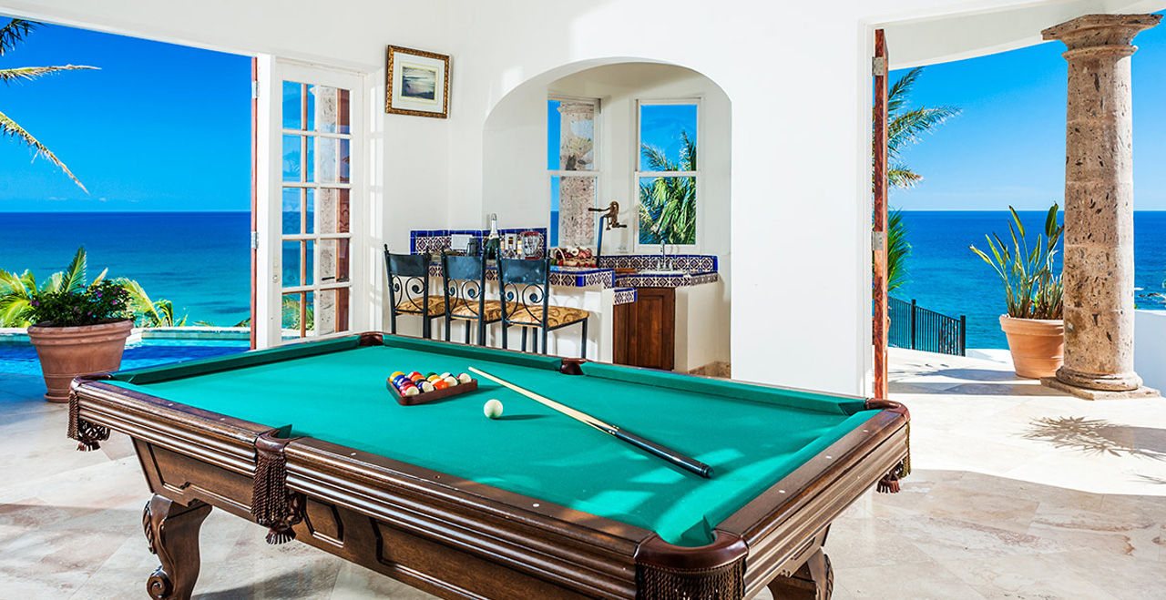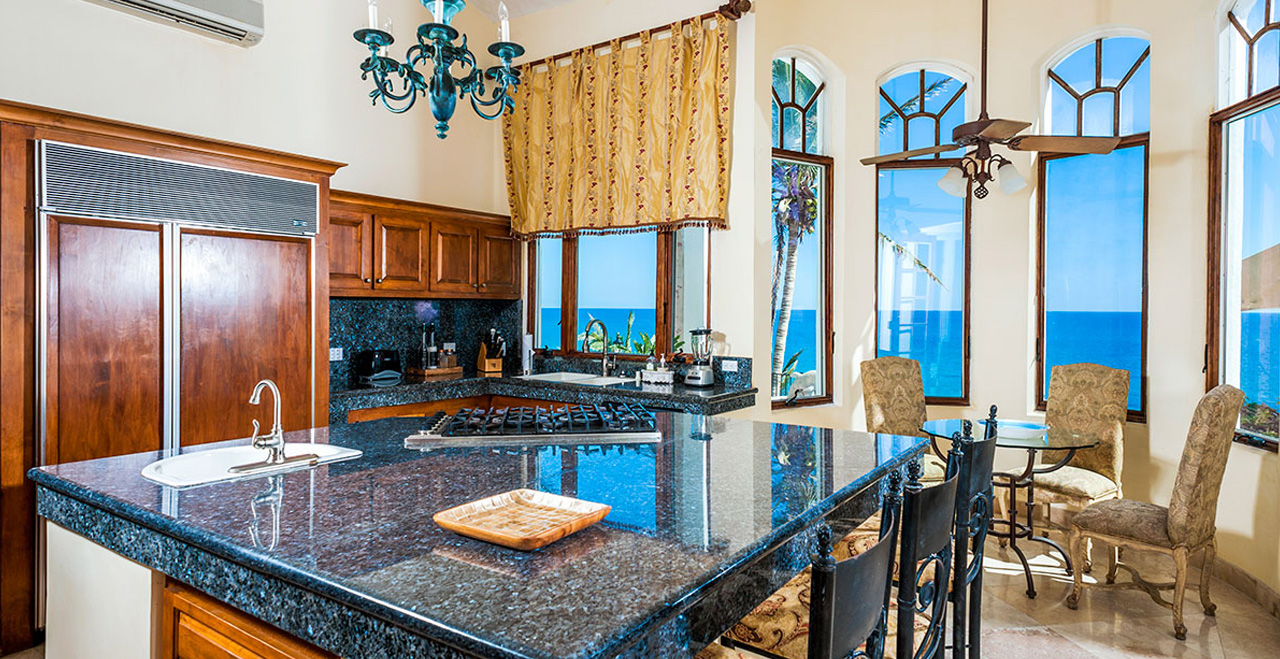 A billiard room and bar are surrounded by French doors that open to the pool area. Air conditioning with individual controls is in all rooms. A long corridor offers lush views of tropical vegetation in the wall courtyard. There is a fully furnished gourmet kitchen with granite counter tops and modern appliances, like a commercial-grade Viking stove and Sub-zero refrigeration. If you prefer, the services of a chef can be arrange to handle your food preparation.