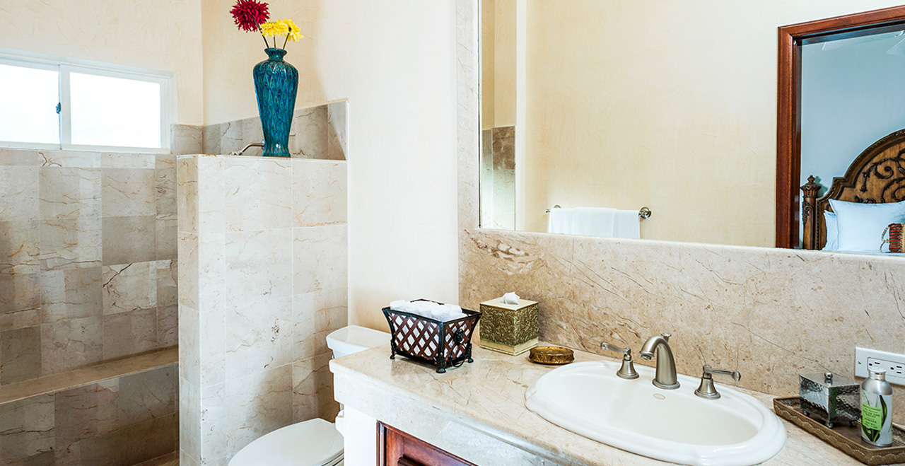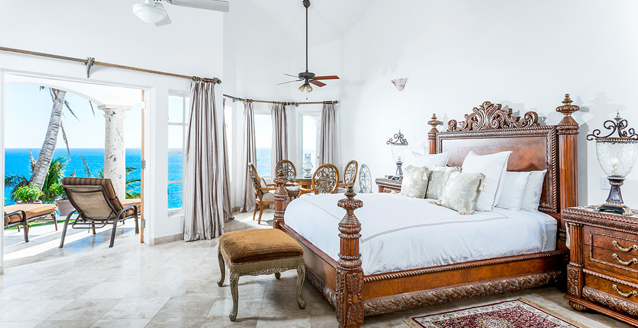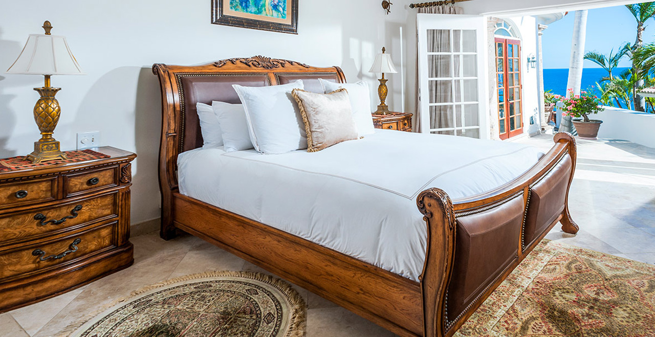 The spacious floor plan features five bedrooms, each with private bathrooms, large Master Suite, and Guest Suite have balconies that open onto the pool and ocean. The Master Suite has one king bed; the Guest Suite has one king bed; bedroom three has one king bed; and bedroom four has two queen beds. There is also a private courtyard Guest Suite with a king bed.