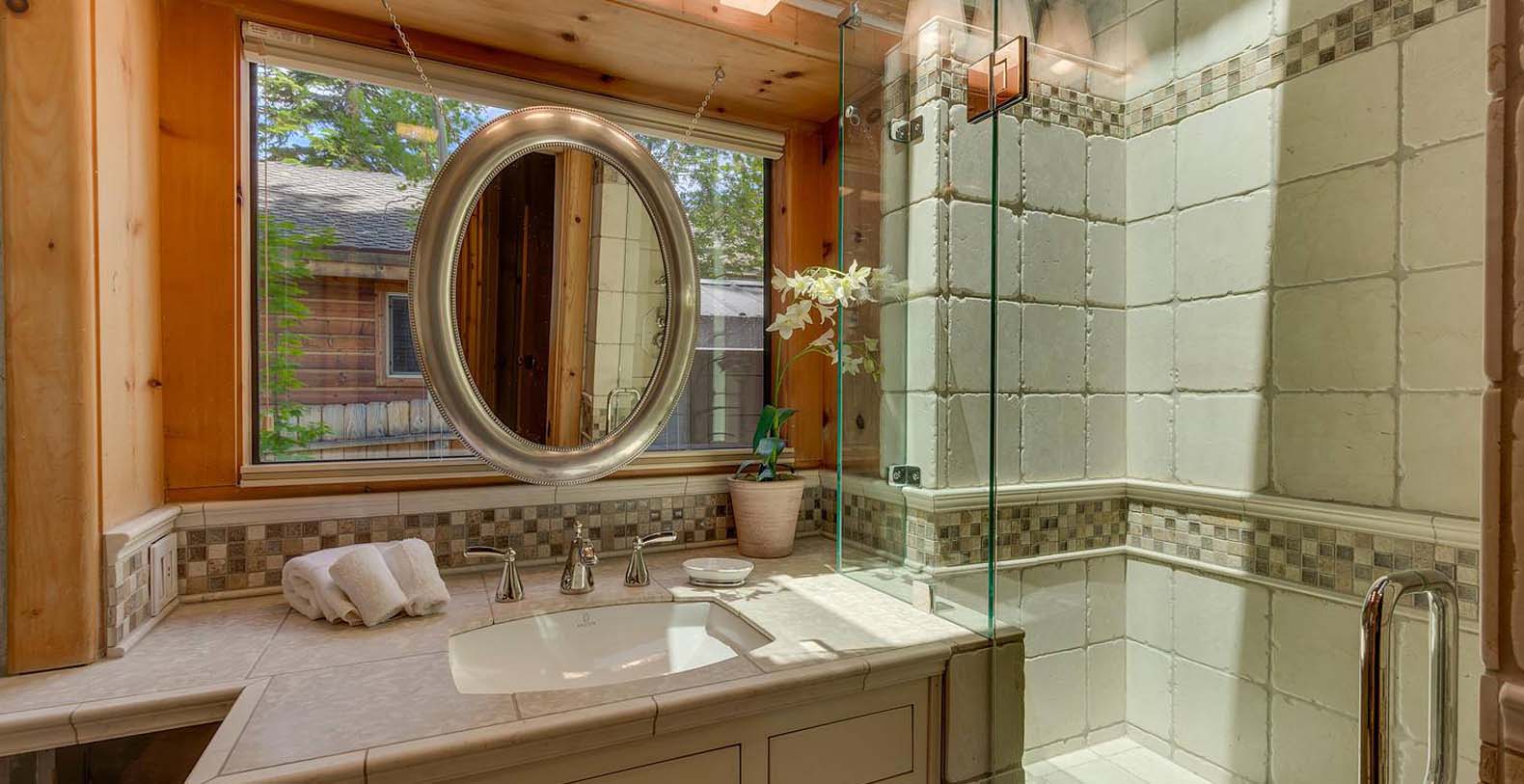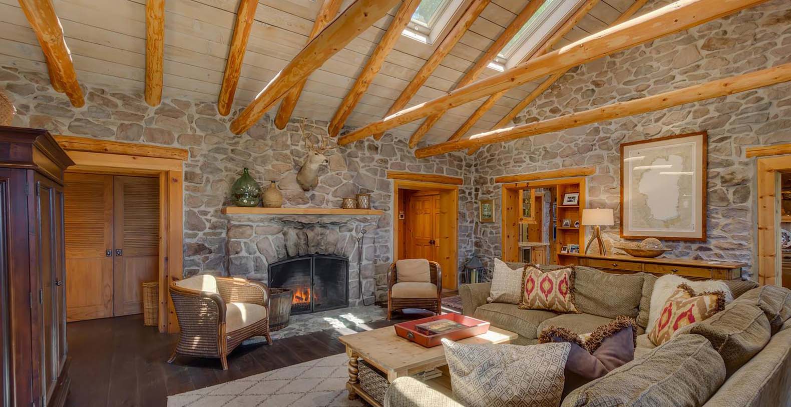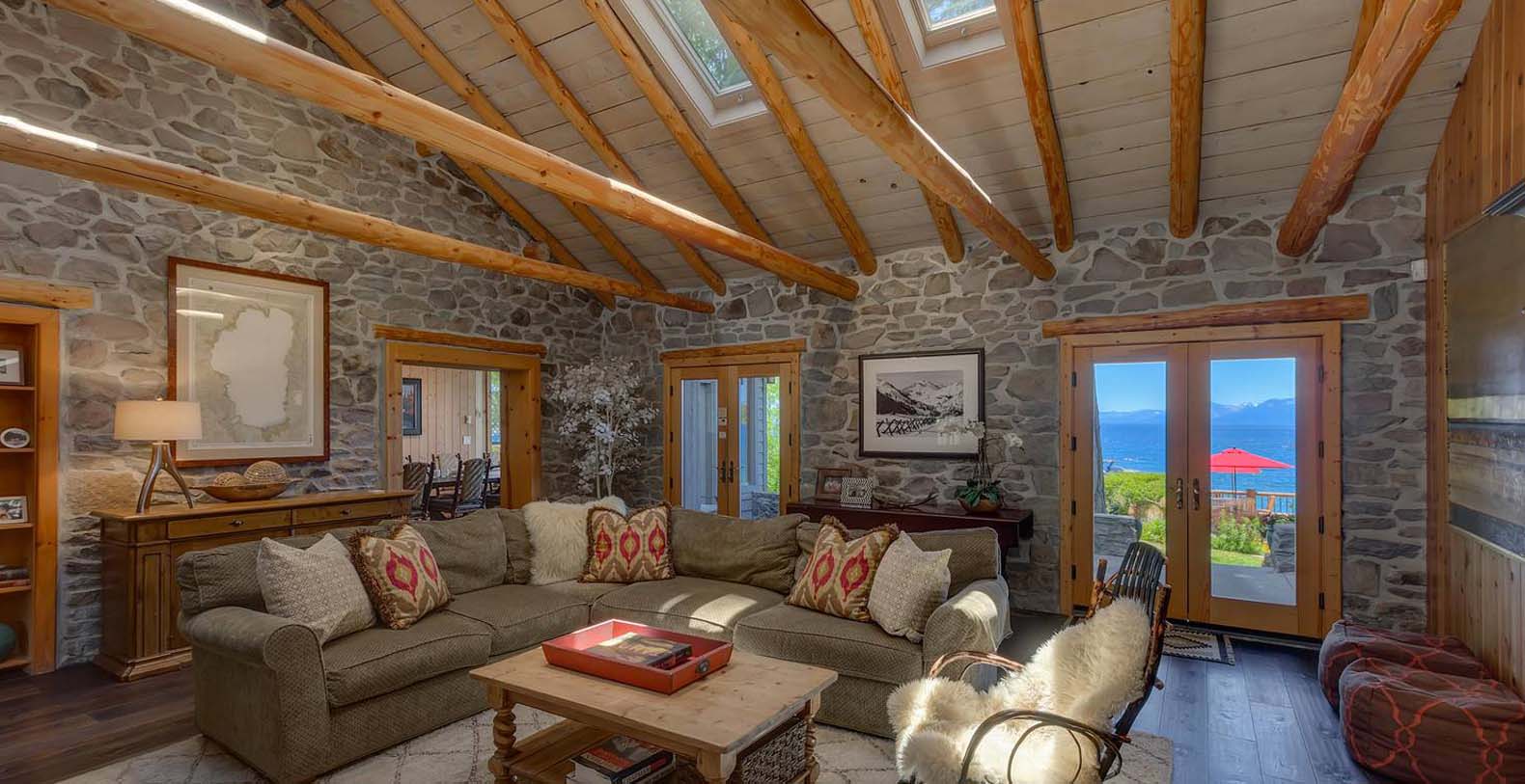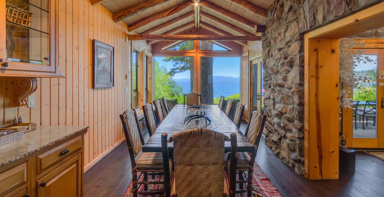 This historic 1919 stone house vacation rental is beautifully remodeled capturing Old Tahoe charm amidst contemporary upgrades throughout. The main house boasts rare, south-facing panoramic views, enjoyed from the dining room, stone patio, great room, and master bedroom. The great room is inviting and cozy with several seating areas to accommodate family get-togethers and a large wood burning fireplace to gather around.