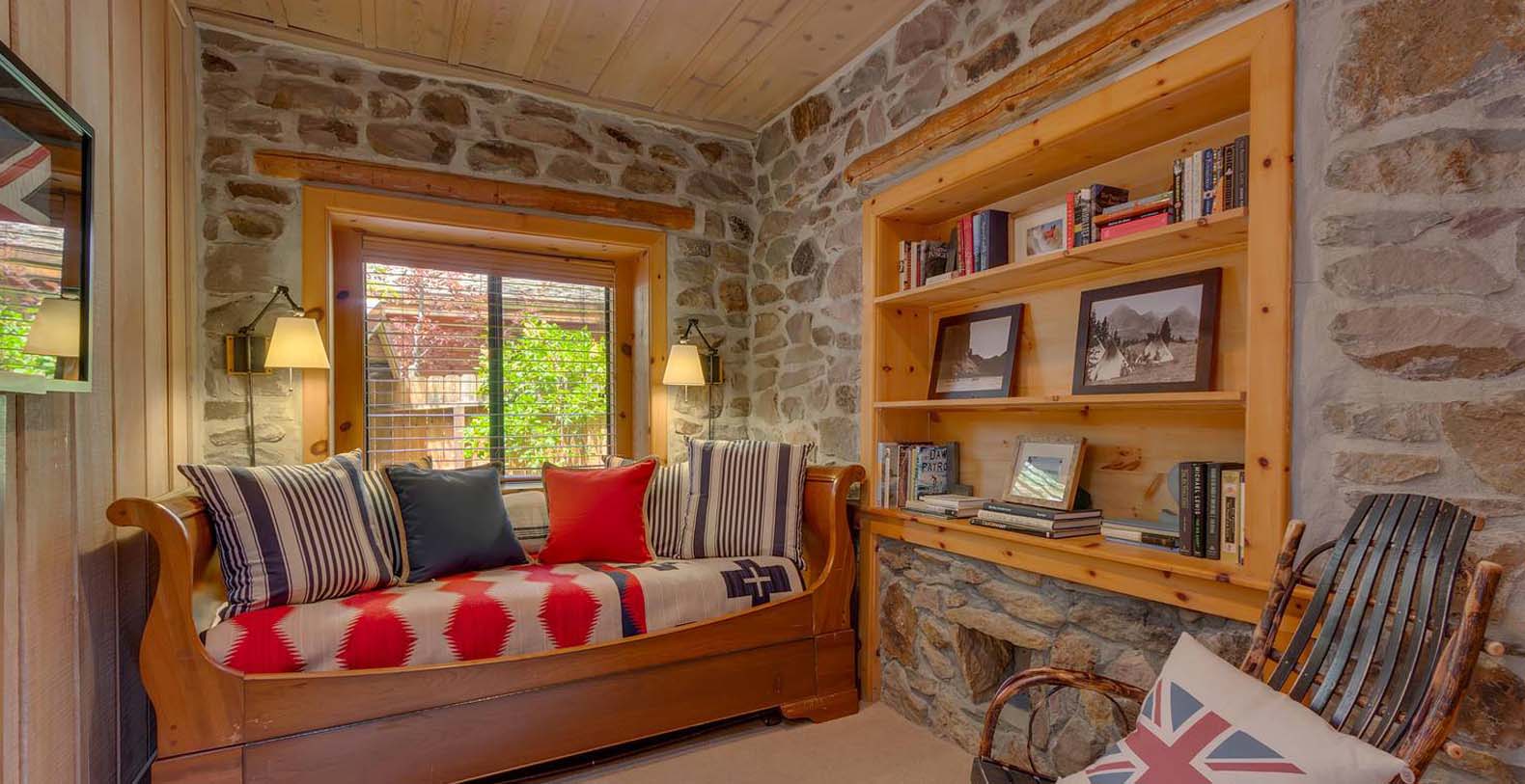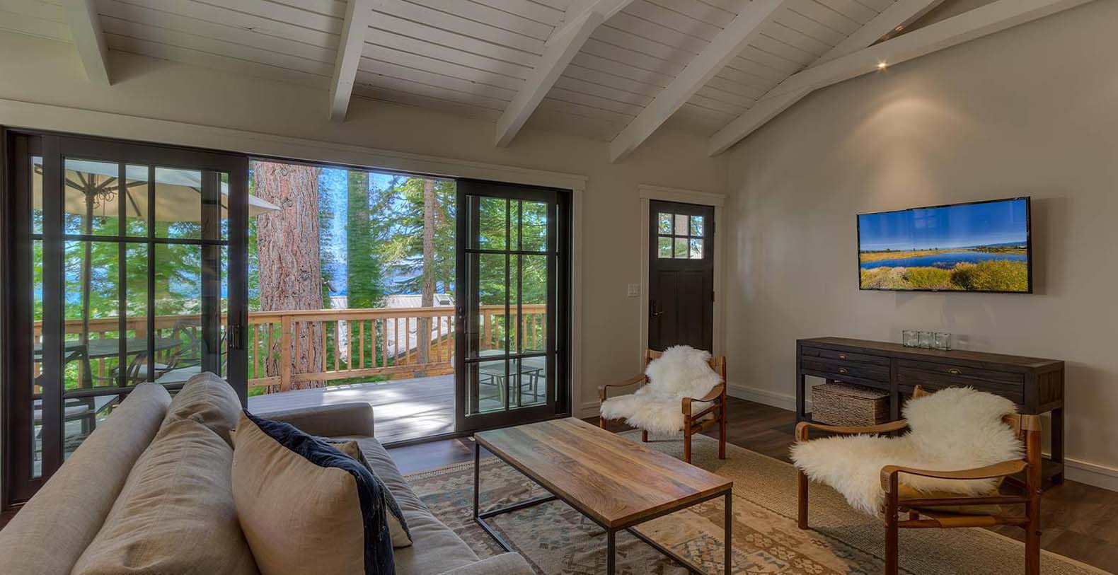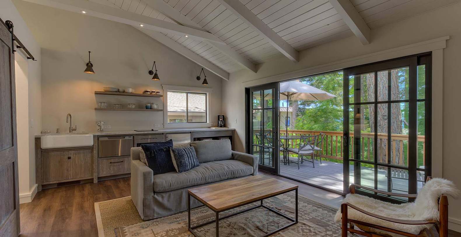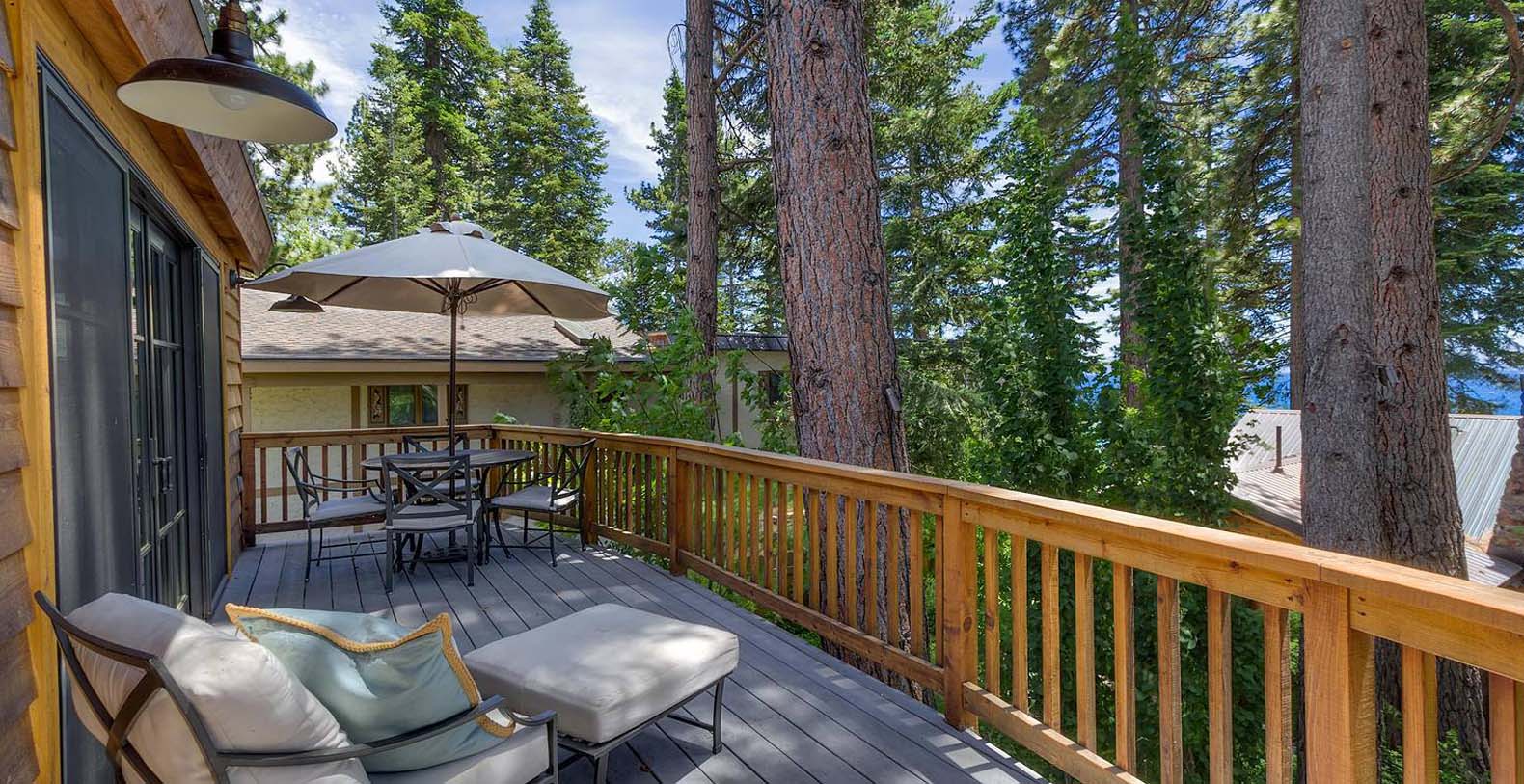 This historic 1919 stone house vacation rental is beautifully remodeled capturing Old Tahoe charm amidst contemporary upgrades throughout. The main house boasts rare, south-facing panoramic views, enjoyed from the dining room, stone patio, great room, and master bedroom. The great room is inviting and cozy with several seating areas to accommodate family get-togethers and a large wood burning fireplace to gather around.
