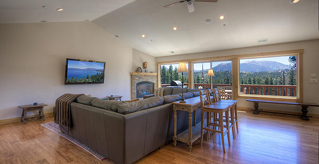 Absolutely amazing brand new construction with a wonderful game room and enormous upstairs great room with a 63" LCD/TV! This fantastic home has an upstairs living plan, 4100 total square feet of living space, a huge wet bar in the game room, and more! Granite counter tops in the chef's dream kitchen, huge master suite with private bathroom with jacuzzi bath tub, 3 total master suites throughout, 5 total bedrooms with 4 and 1/2 bathrooms, and exceptional mountain views! Please note: This home was rebuilt after the Angora Fire in 2007, there are few trees but wonderful mountain views.