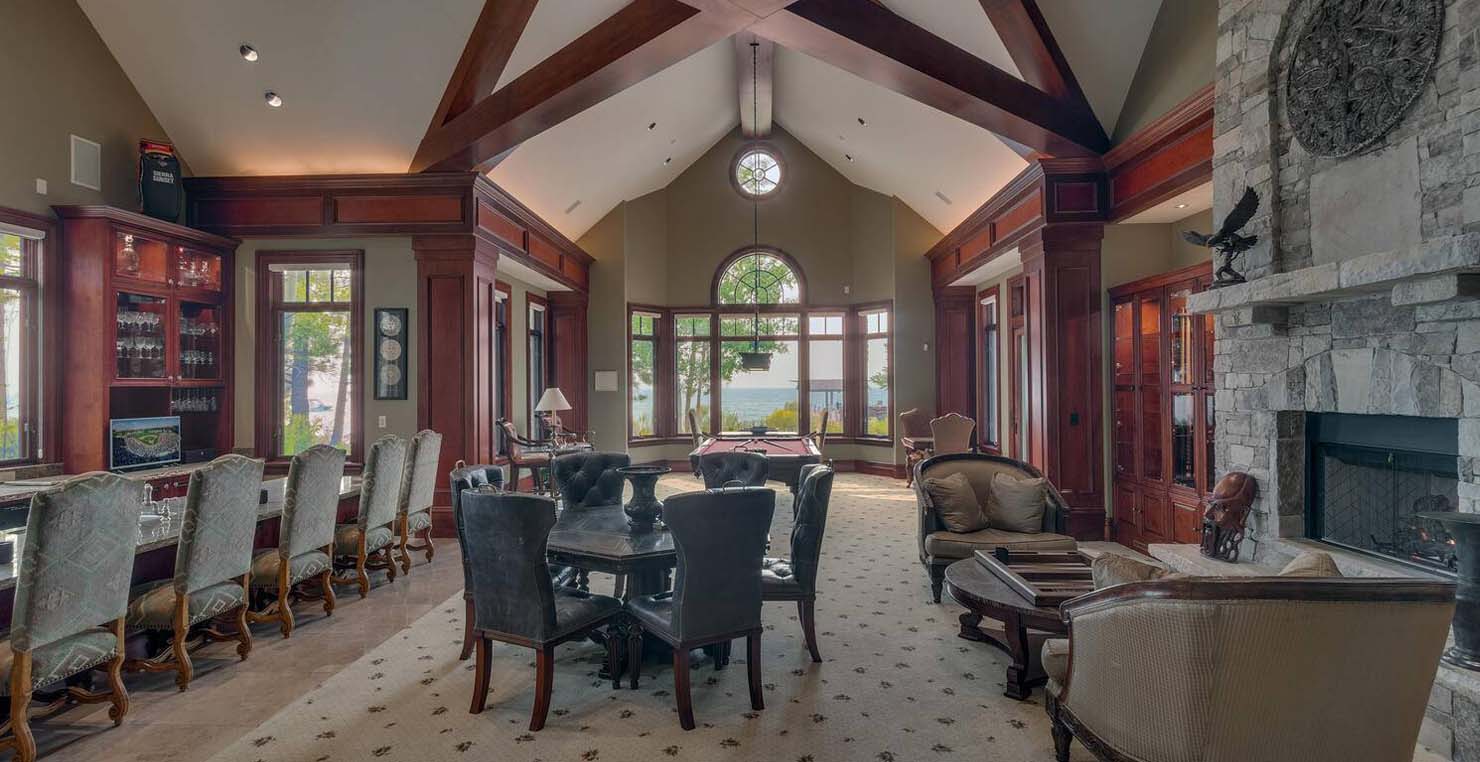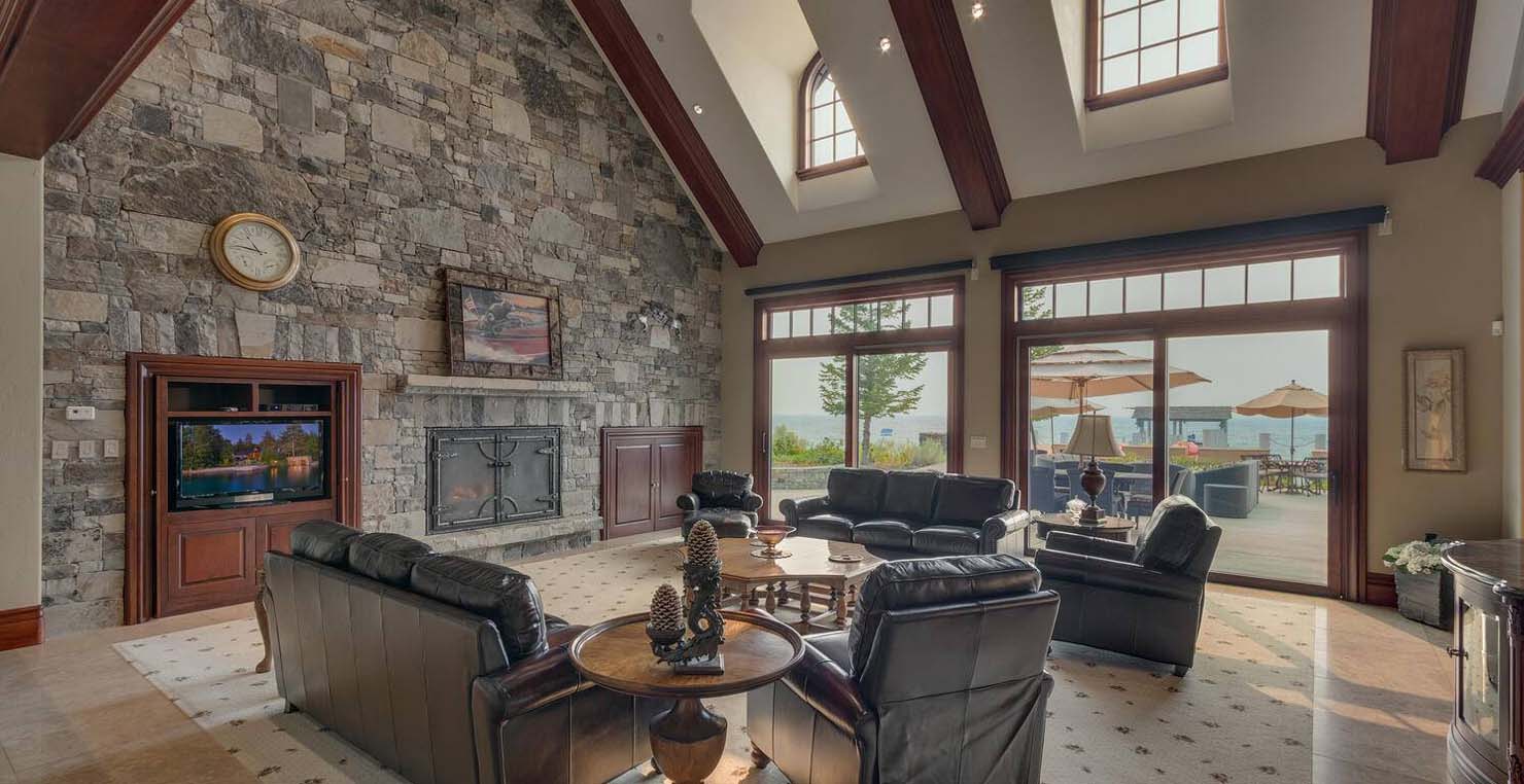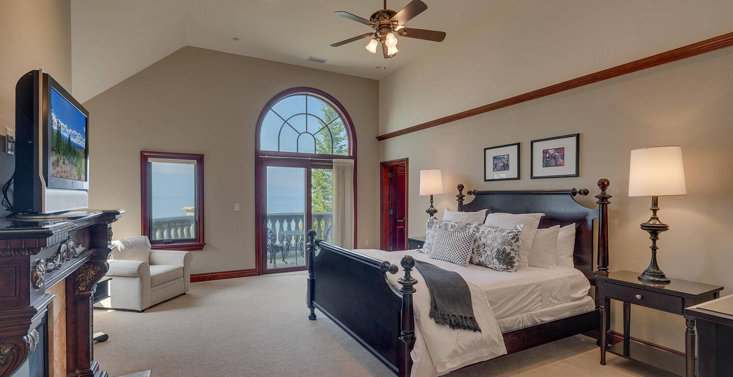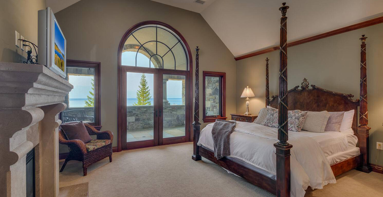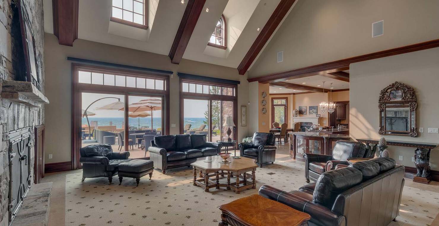 Across the hall is both a wine cellar with a conversational table and four tall embroidered chairs, and an exercise room with a television, full bathroom and cozy sauna. The kitchen has not one, but two, large islands each with a sink, a six-burner stove and grill, double oven and a hot water sink directly above the burners for stock pots. Lovely redwood cabinets and dark granite countertops perfectly accentuate the sunny room. Additionally, a large LG microwave, 24" television, and two wine refrigerators are complimented by an oversized pantry with an industrial sized fridge and a wealth cabinet space. The breakfast table offers seating for six at the dining table, a gas fireplace and, of course, views of the dock and lake. Stroll down to the end of the hallway, which spans the length of the house, to a massive billiards room furnished for entertainment with a professional sized bar with seating, a deep sink, 54" television, poker set, game table with backgammon table, pool table and foosball table. Double doors lead to an open, tiered floor theater room which seats 17 with full reclining chairs with cup holders. Outside, relax in the hot tub or by the fire pit while grilling on the barbecue and enjoying dinner at the patio seating area. Closer to the white sand beach are two more tables with an umbrella and four chairs each. Stroll on the dock which leads out 40 yards to your buoy and boasts over 50 yards of beautiful sandy beach. Adjacent to the front courtyard is the guest house with a kitchen, living room, and two bedrooms, which rests above a 3-car garage. The guest house balcony overlooks the front of the estate, full of Aspen trees and pines. The grandest view this world affords.