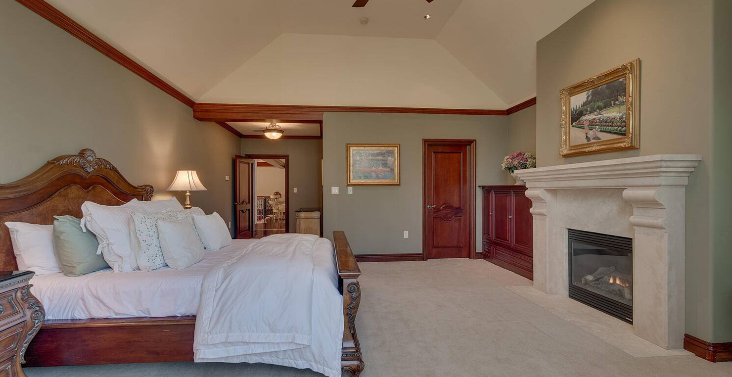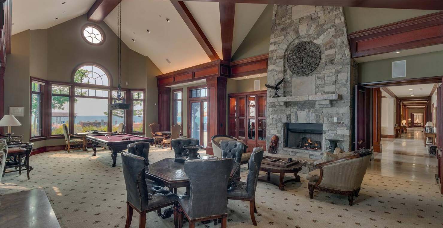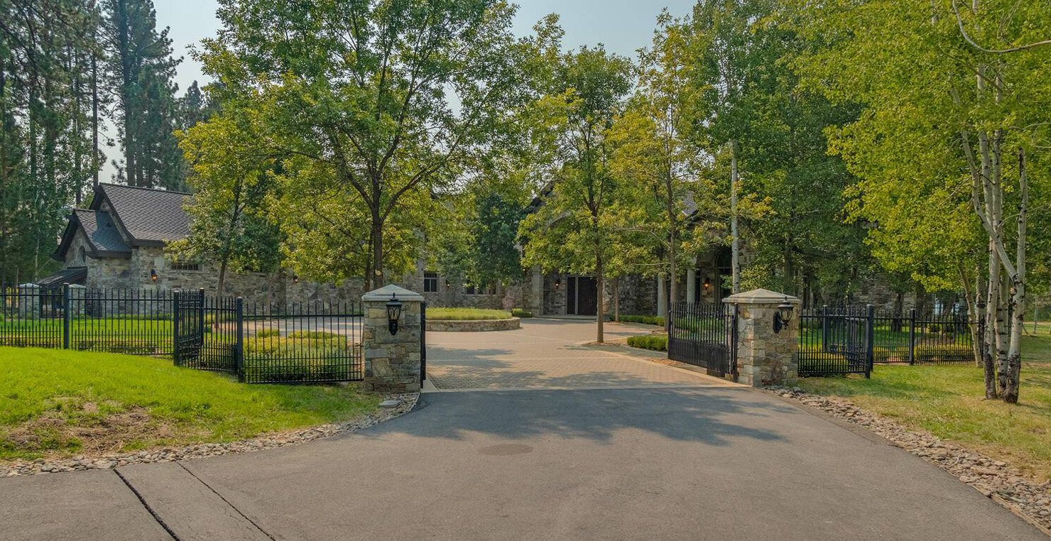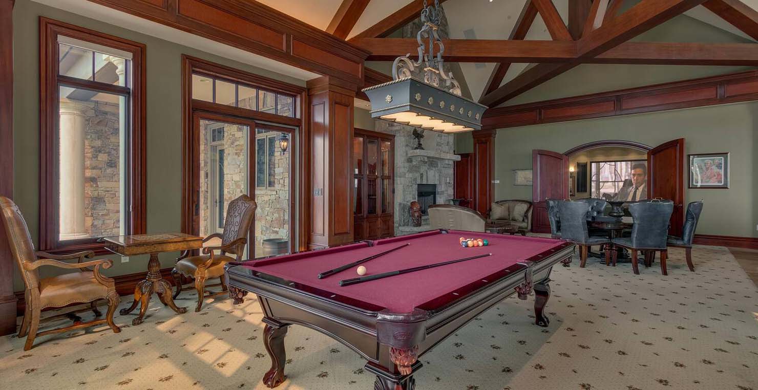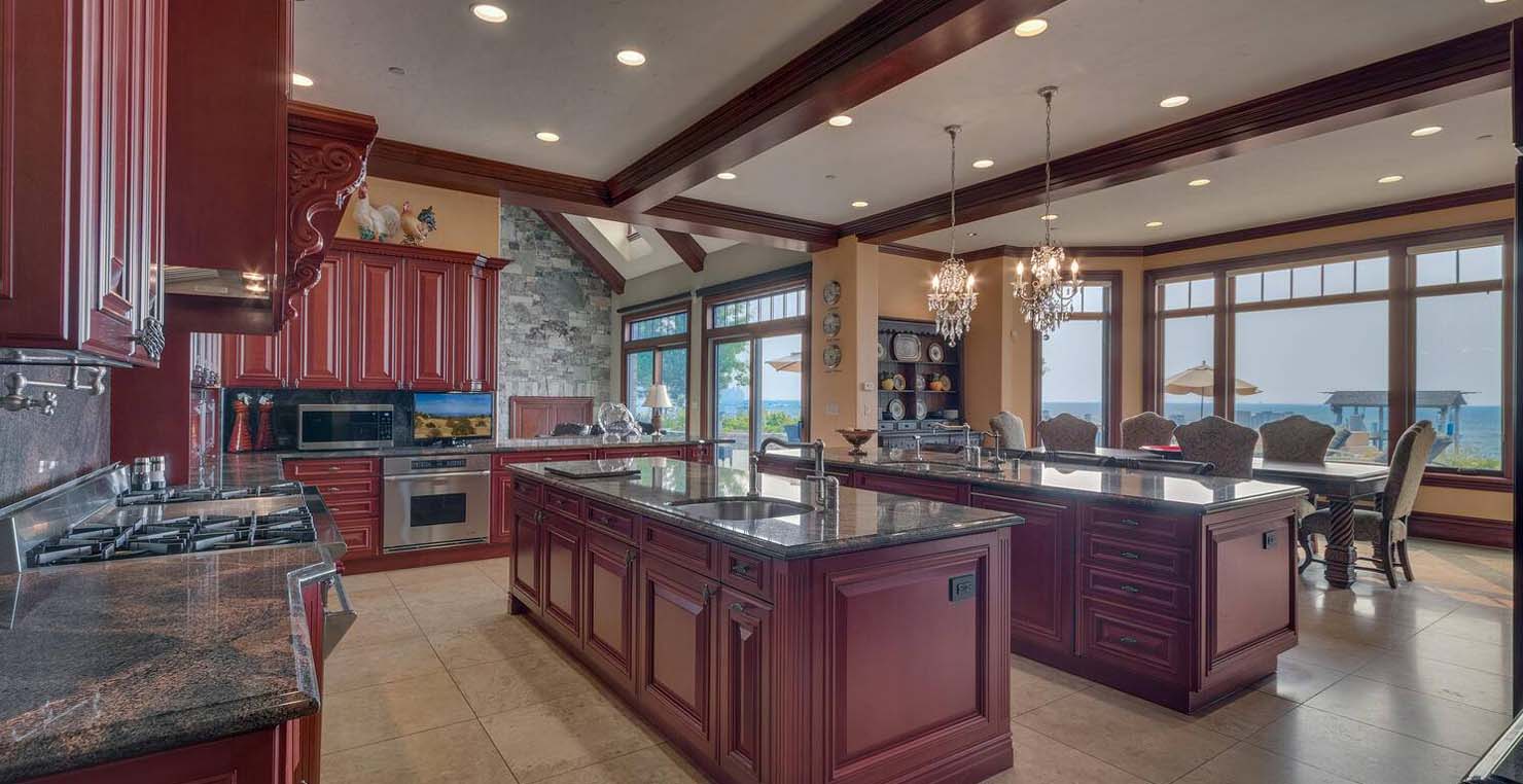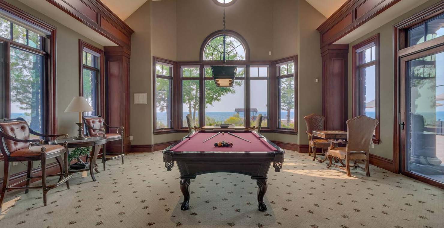 Across the hall is both a wine cellar with a conversational table and four tall embroidered chairs, and an exercise room with a television, full bathroom and cozy sauna. The kitchen has not one, but two, large islands each with a sink, a six-burner stove and grill, double oven and a hot water sink directly above the burners for stock pots. Lovely redwood cabinets and dark granite countertops perfectly accentuate the sunny room. Additionally, a large LG microwave, 24" television, and two wine refrigerators are complimented by an oversized pantry with an industrial sized fridge and a wealth cabinet space. The breakfast table offers seating for six at the dining table, a gas fireplace and, of course, views of the dock and lake. Stroll down to the end of the hallway, which spans the length of the house, to a massive billiards room furnished for entertainment with a professional sized bar with seating, a deep sink, 54" television, poker set, game table with backgammon table, pool table and foosball table. Double doors lead to an open, tiered floor theater room which seats 17 with full reclining chairs with cup holders. Outside, relax in the hot tub or by the fire pit while grilling on the barbecue and enjoying dinner at the patio seating area. Closer to the white sand beach are two more tables with an umbrella and four chairs each. Stroll on the dock which leads out 40 yards to your buoy and boasts over 50 yards of beautiful sandy beach. Adjacent to the front courtyard is the guest house with a kitchen, living room, and two bedrooms, which rests above a 3-car garage. The guest house balcony overlooks the front of the estate, full of Aspen trees and pines. The grandest view this world affords.