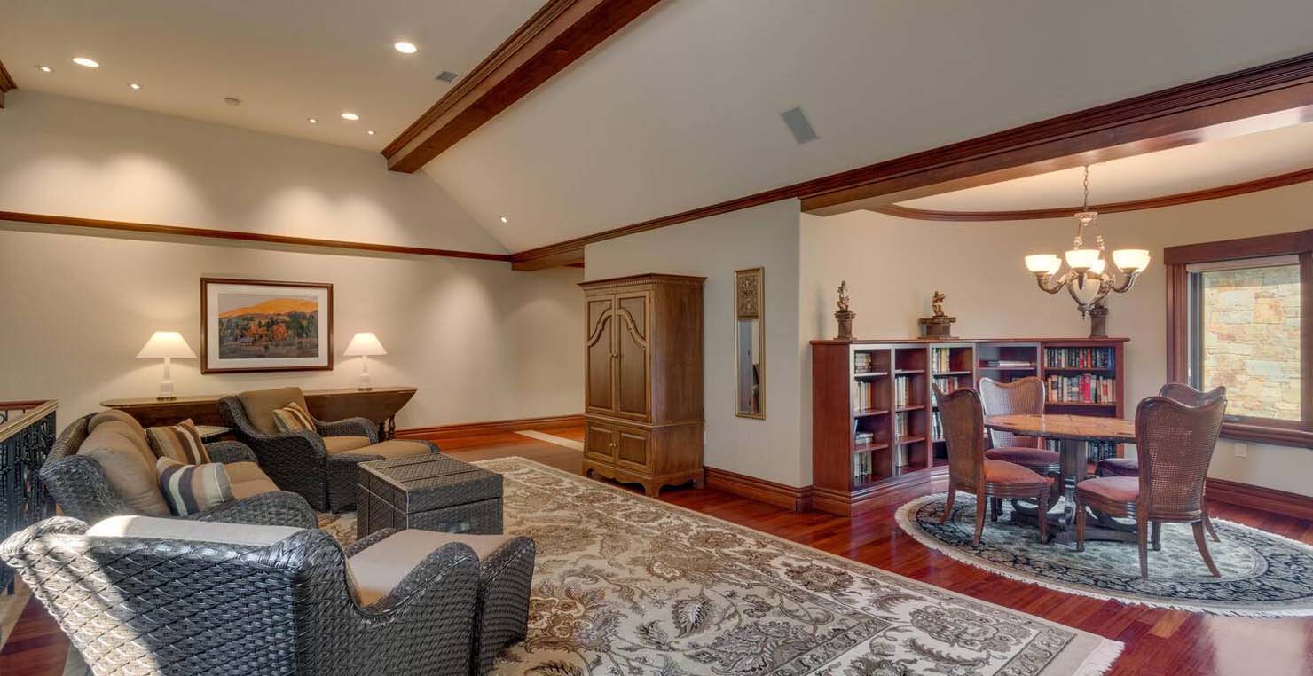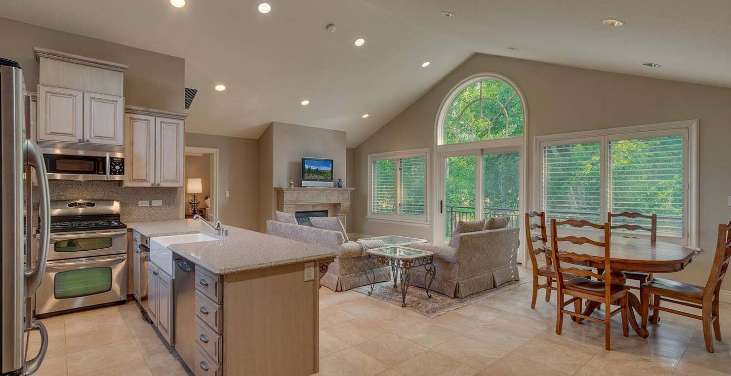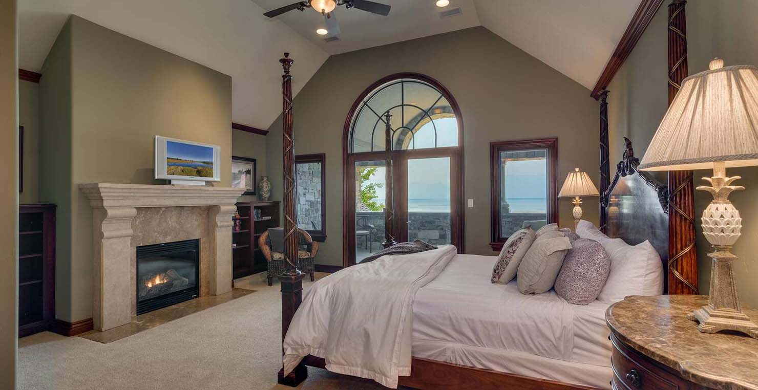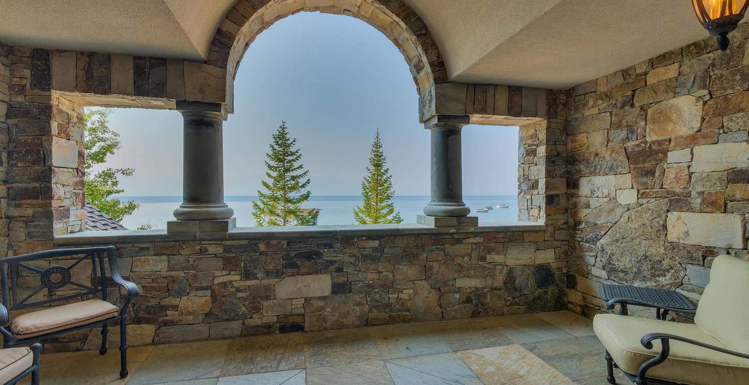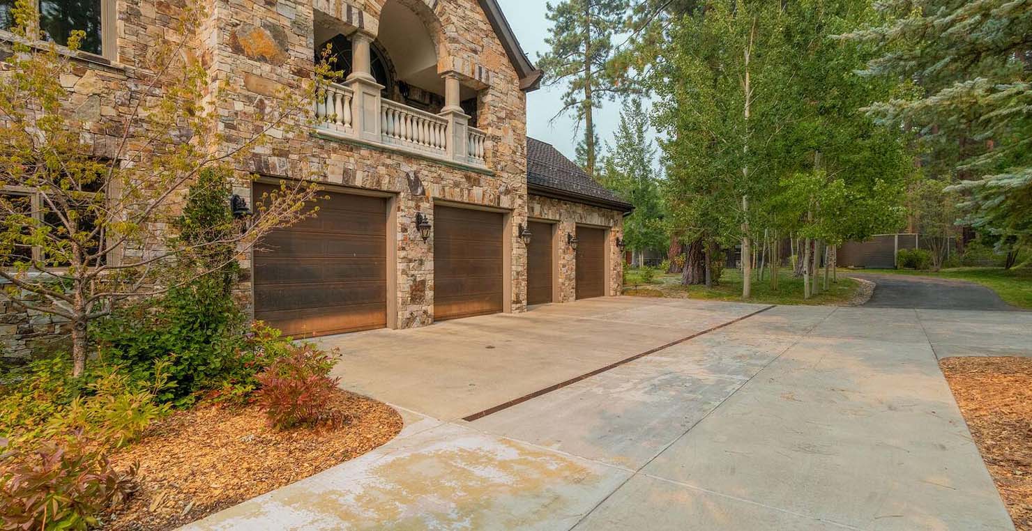 Across the hall is both a wine cellar with a conversational table and four tall embroidered chairs, and an exercise room with a television, full bathroom and cozy sauna. The kitchen has not one, but two, large islands each with a sink, a six-burner stove and grill, double oven and a hot water sink directly above the burners for stock pots. Lovely redwood cabinets and dark granite countertops perfectly accentuate the sunny room. Additionally, a large LG microwave, 24" television, and two wine refrigerators are complimented by an oversized pantry with an industrial sized fridge and a wealth cabinet space. The breakfast table offers seating for six at the dining table, a gas fireplace and, of course, views of the dock and lake. Stroll down to the end of the hallway, which spans the length of the house, to a massive billiards room furnished for entertainment with a professional sized bar with seating, a deep sink, 54" television, poker set, game table with backgammon table, pool table and foosball table. Double doors lead to an open, tiered floor theater room which seats 17 with full reclining chairs with cup holders. Outside, relax in the hot tub or by the fire pit while grilling on the barbecue and enjoying dinner at the patio seating area. Closer to the white sand beach are two more tables with an umbrella and four chairs each. Stroll on the dock which leads out 40 yards to your buoy and boasts over 50 yards of beautiful sandy beach. Adjacent to the front courtyard is the guest house with a kitchen, living room, and two bedrooms, which rests above a 3-car garage. The guest house balcony overlooks the front of the estate, full of Aspen trees and pines. The grandest view this world affords.