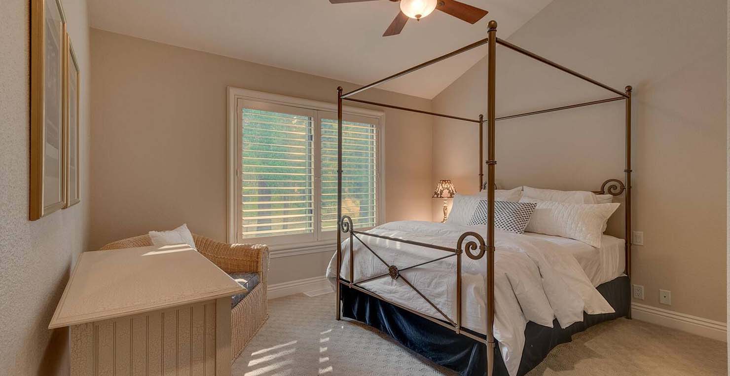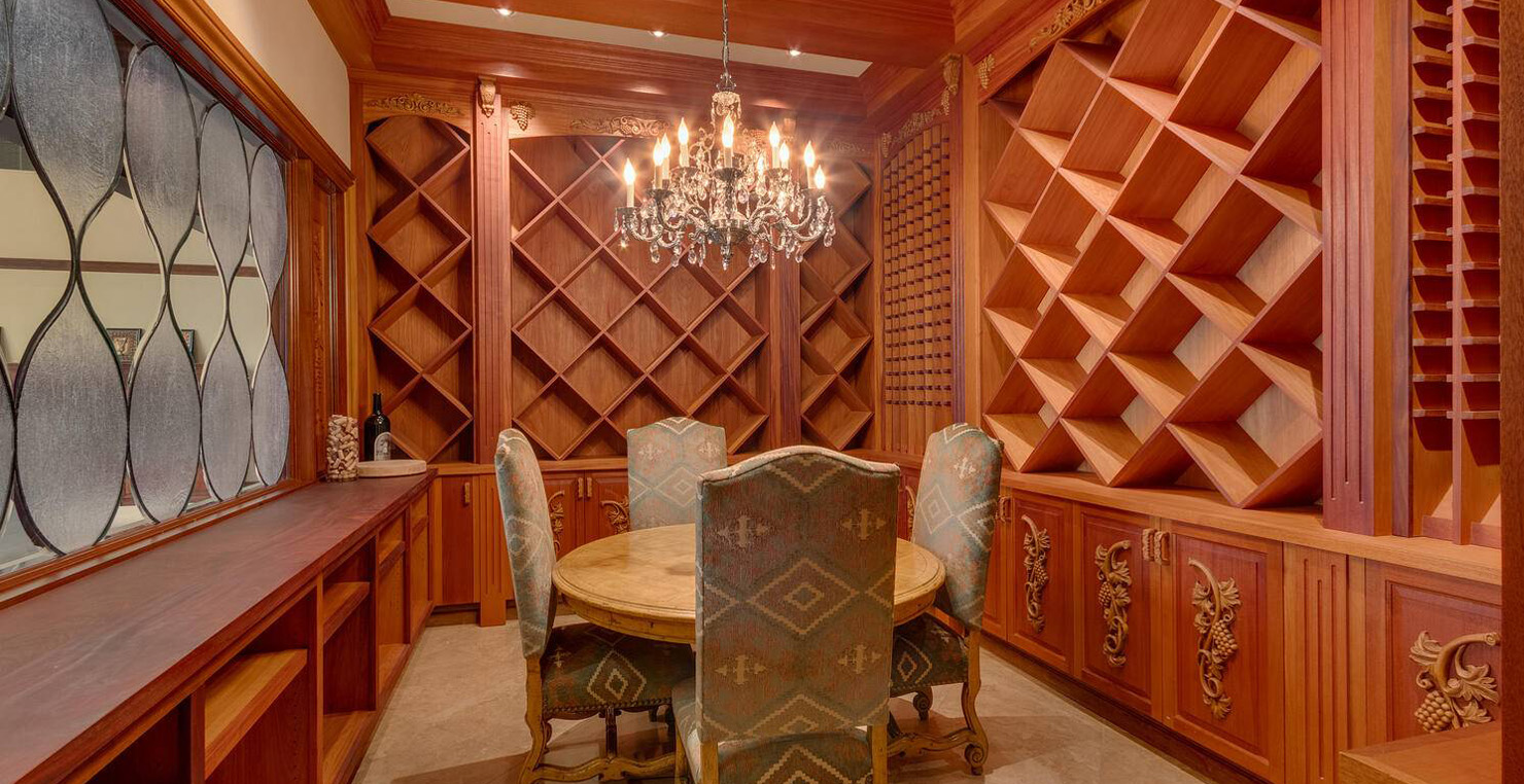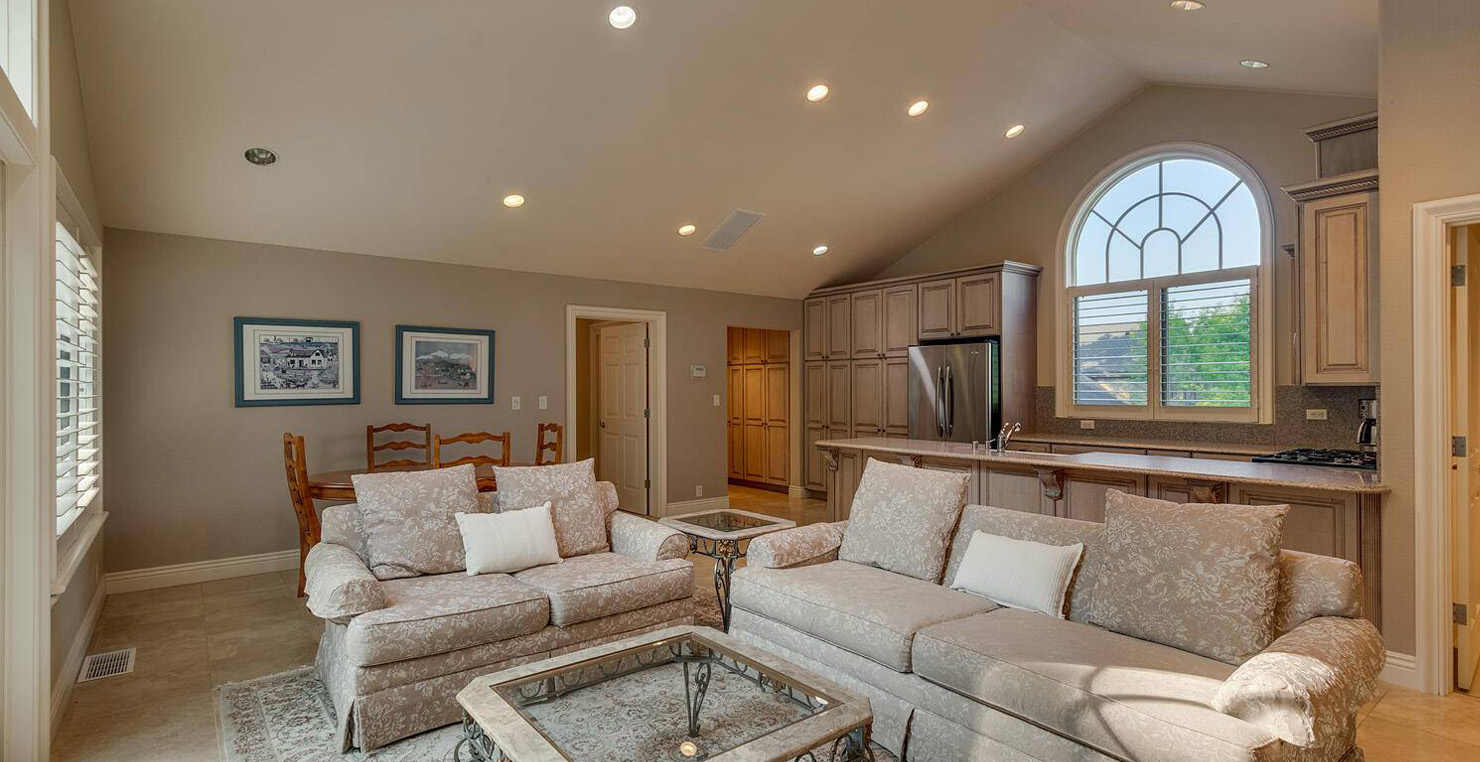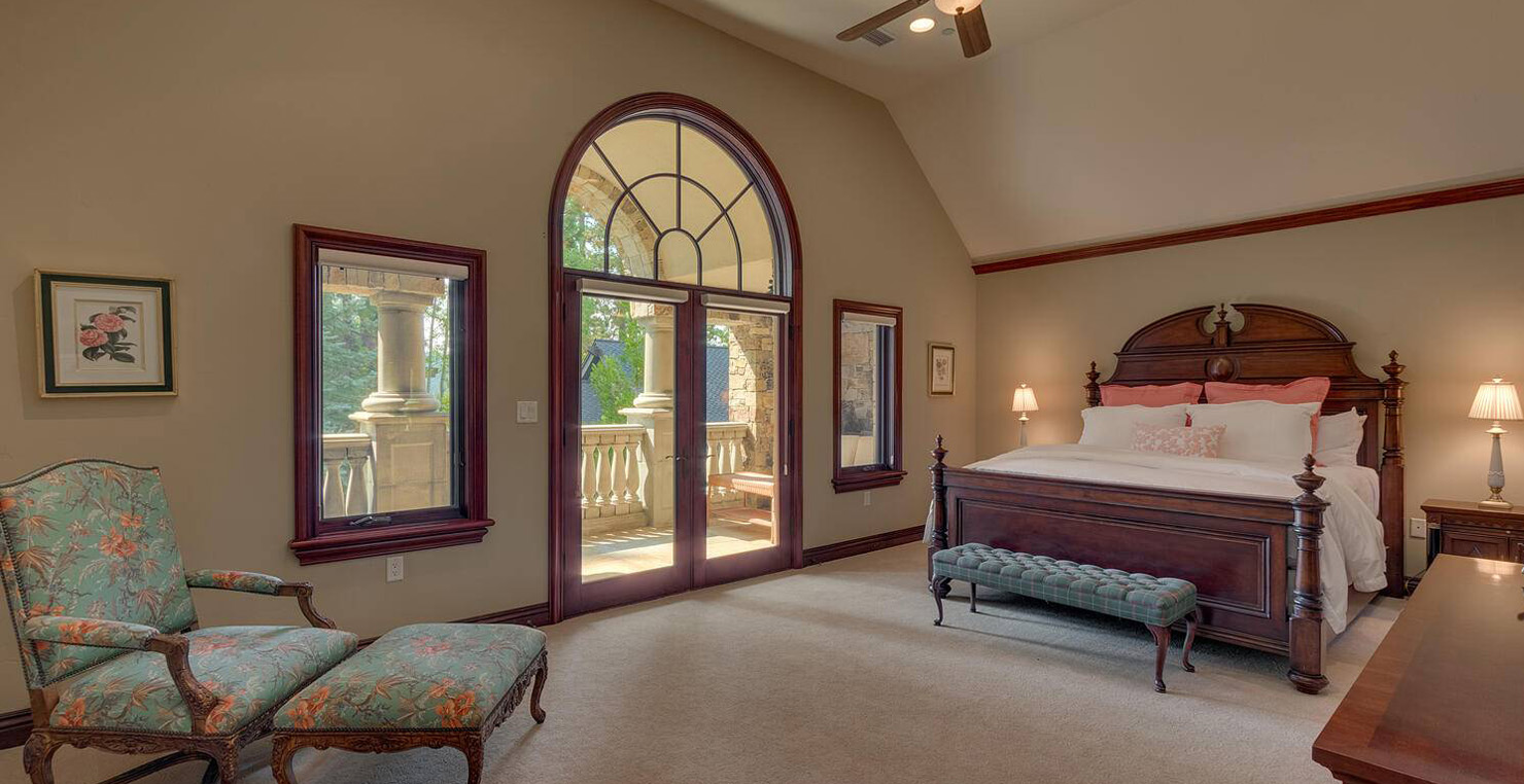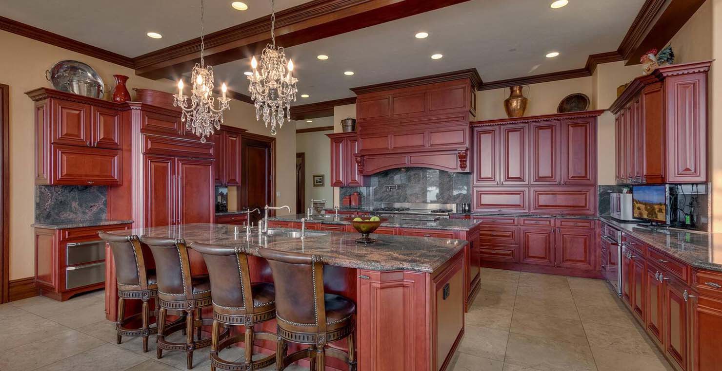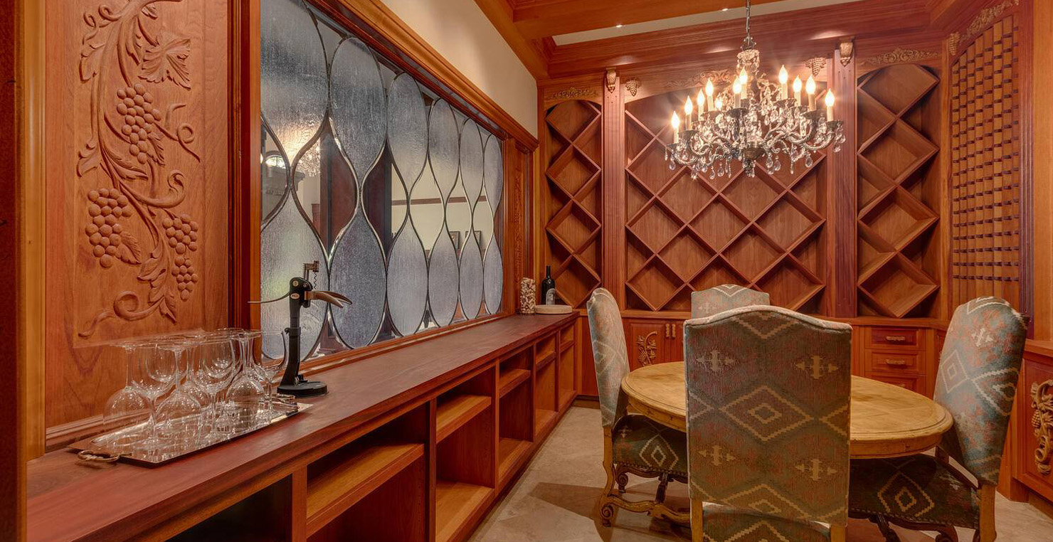 Across the hall is both a wine cellar with a conversational table and four tall embroidered chairs, and an exercise room with a television, full bathroom and cozy sauna. The kitchen has not one, but two, large islands each with a sink, a six-burner stove and grill, double oven and a hot water sink directly above the burners for stock pots. Lovely redwood cabinets and dark granite countertops perfectly accentuate the sunny room. Additionally, a large LG microwave, 24" television, and two wine refrigerators are complimented by an oversized pantry with an industrial sized fridge and a wealth cabinet space. The breakfast table offers seating for six at the dining table, a gas fireplace and, of course, views of the dock and lake. Stroll down to the end of the hallway, which spans the length of the house, to a massive billiards room furnished for entertainment with a professional sized bar with seating, a deep sink, 54" television, poker set, game table with backgammon table, pool table and foosball table. Double doors lead to an open, tiered floor theater room which seats 17 with full reclining chairs with cup holders. Outside, relax in the hot tub or by the fire pit while grilling on the barbecue and enjoying dinner at the patio seating area. Closer to the white sand beach are two more tables with an umbrella and four chairs each. Stroll on the dock which leads out 40 yards to your buoy and boasts over 50 yards of beautiful sandy beach. Adjacent to the front courtyard is the guest house with a kitchen, living room, and two bedrooms, which rests above a 3-car garage. The guest house balcony overlooks the front of the estate, full of Aspen trees and pines. The grandest view this world affords.