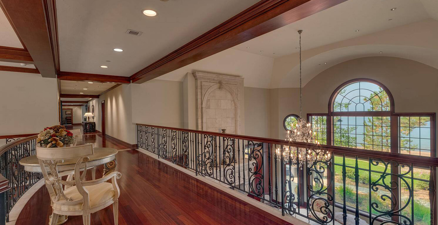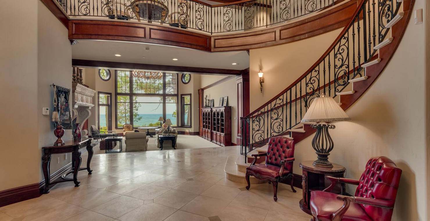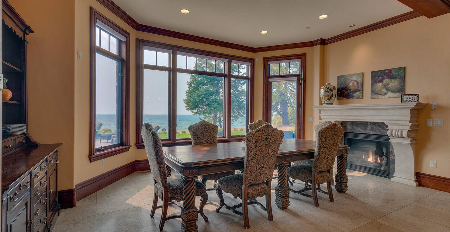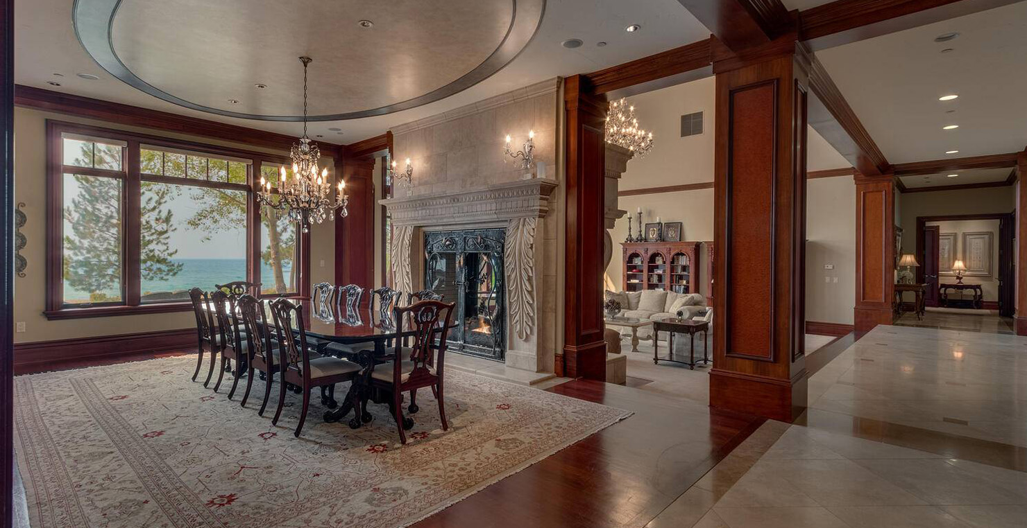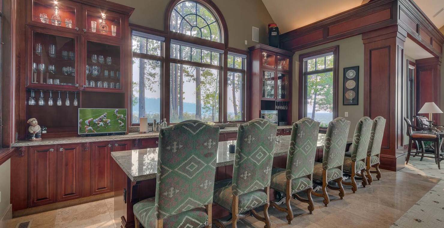 Enter via the tree ensconced road behind a gated frame with Aspen groves on either side and approach the front courtyard with large double doors. An impressive stone, arch entryway greets you. The main entry rotunda has elegant artwork and marble statues, with a grand spiral staircase leading to the second floor. Front and center is a comfortable sitting area, with a cream sofa, matching armchair and outfitted bookshelves. A table by the window provides a panoramic views of stunning Lake Tahoe. To the left, the formal dining room seats 10 comfortably with beautiful blue views, rich woods and a glass armoire with ceramic vases and serving-ware. A pass through pantry offers various coffee makers, sink, ice machine and cabinets for storage.