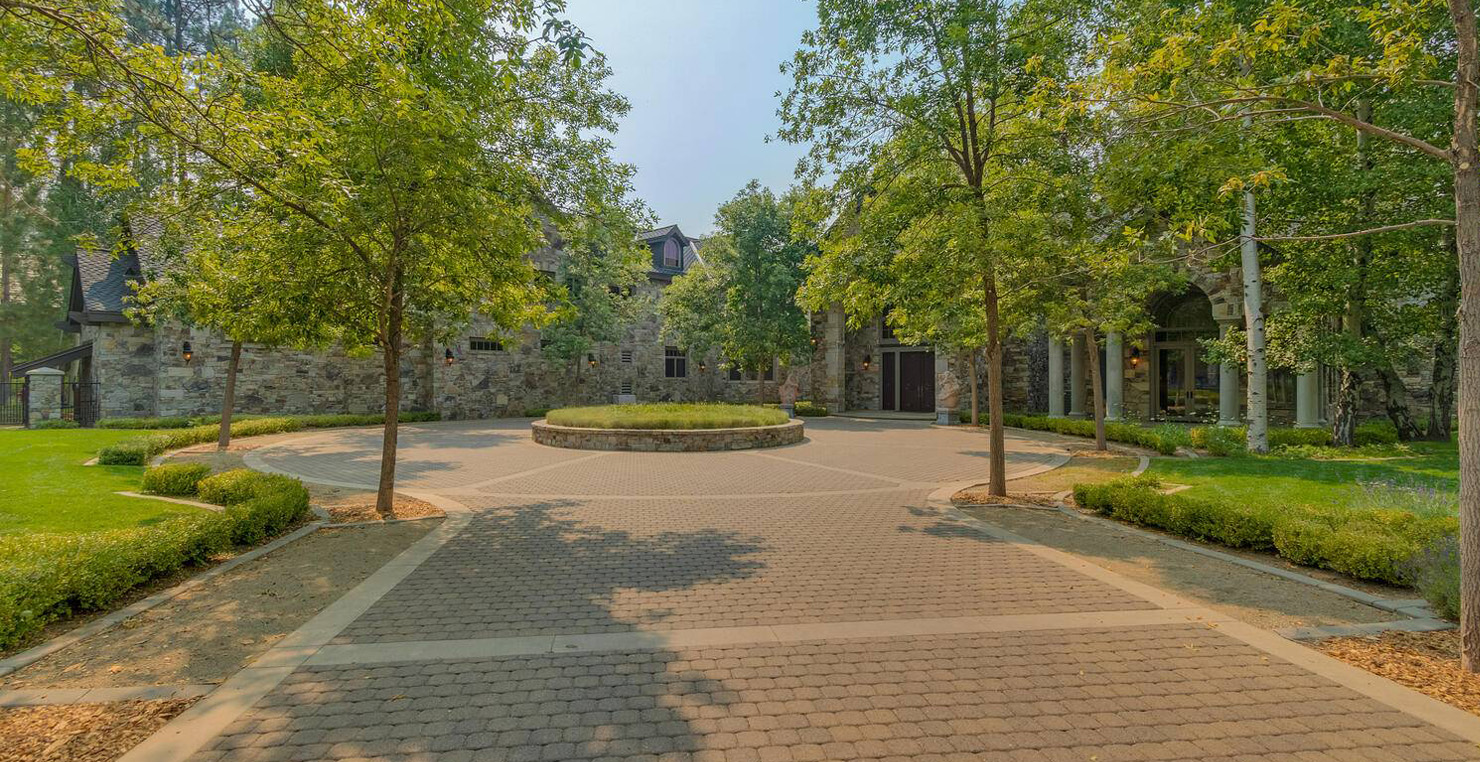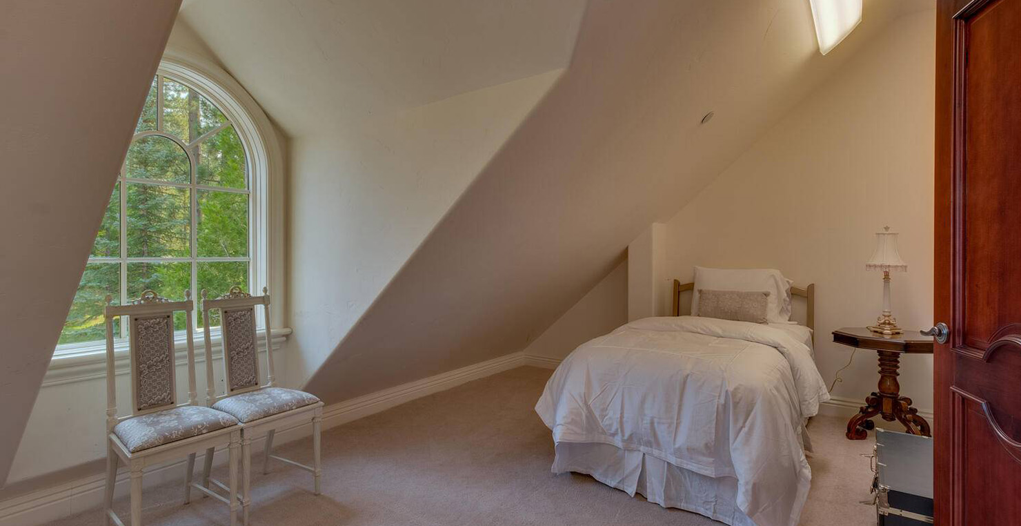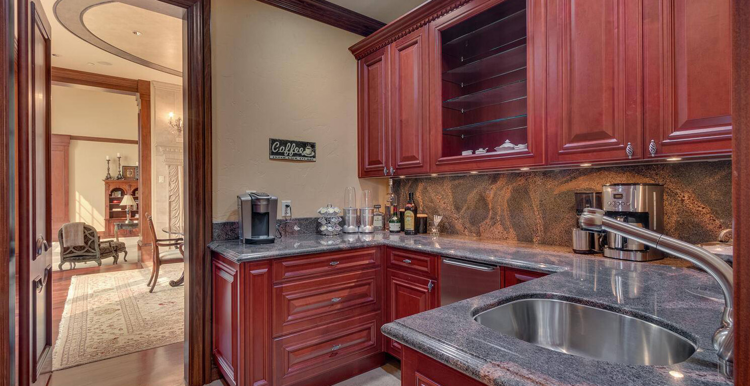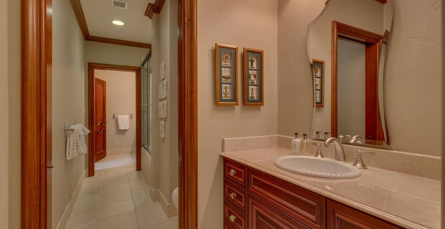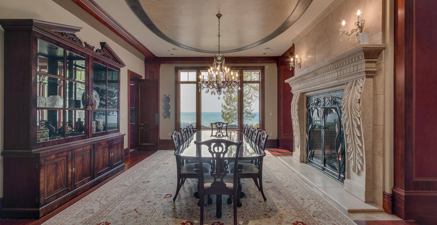 Enter via the tree ensconced road behind a gated frame with Aspen groves on either side and approach the front courtyard with large double doors. An impressive stone, arch entryway greets you. The main entry rotunda has elegant artwork and marble statues, with a grand spiral staircase leading to the second floor. Front and center is a comfortable sitting area, with a cream sofa, matching armchair and outfitted bookshelves. A table by the window provides a panoramic views of stunning Lake Tahoe. To the left, the formal dining room seats 10 comfortably with beautiful blue views, rich woods and a glass armoire with ceramic vases and serving-ware. A pass through pantry offers various coffee makers, sink, ice machine and cabinets for storage.
