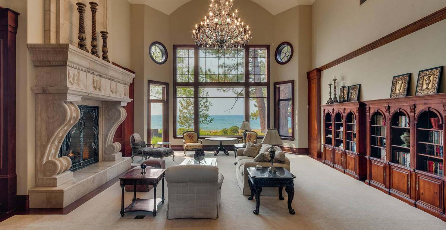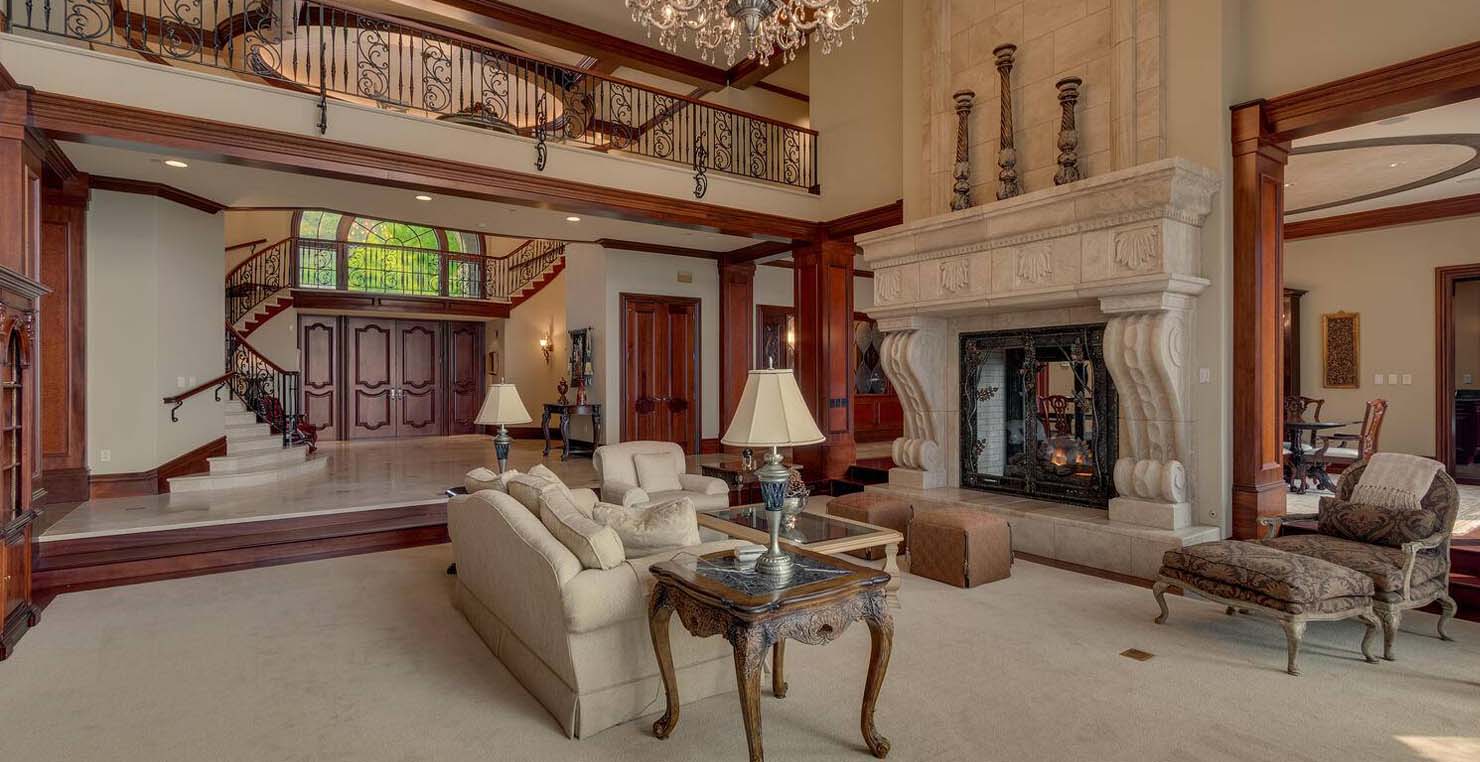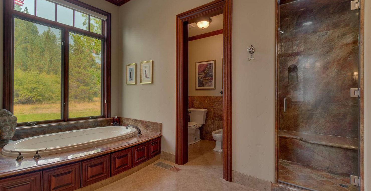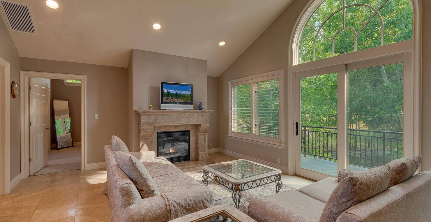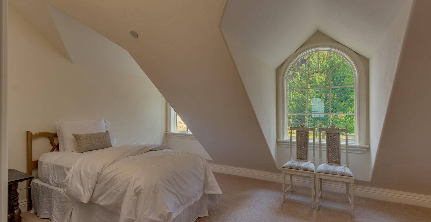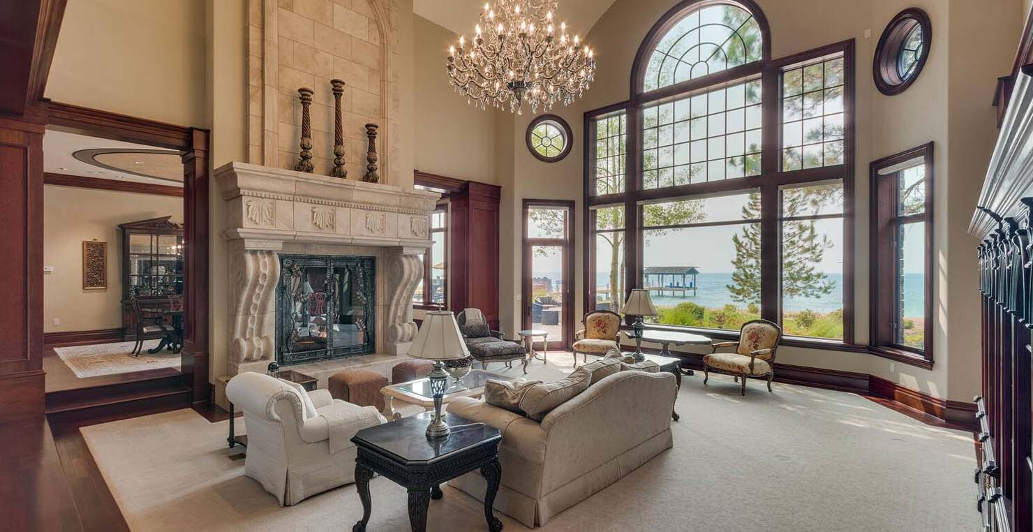 Enter via the tree ensconced road behind a gated frame with Aspen groves on either side and approach the front courtyard with large double doors. An impressive stone, arch entryway greets you. The main entry rotunda has elegant artwork and marble statues, with a grand spiral staircase leading to the second floor. Front and center is a comfortable sitting area, with a cream sofa, matching armchair and outfitted bookshelves. A table by the window provides a panoramic views of stunning Lake Tahoe. To the left, the formal dining room seats 10 comfortably with beautiful blue views, rich woods and a glass armoire with ceramic vases and serving-ware. A pass through pantry offers various coffee makers, sink, ice machine and cabinets for storage.