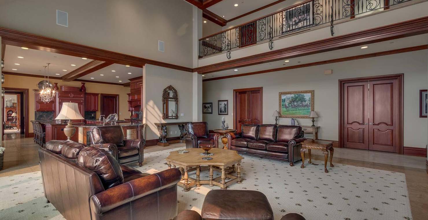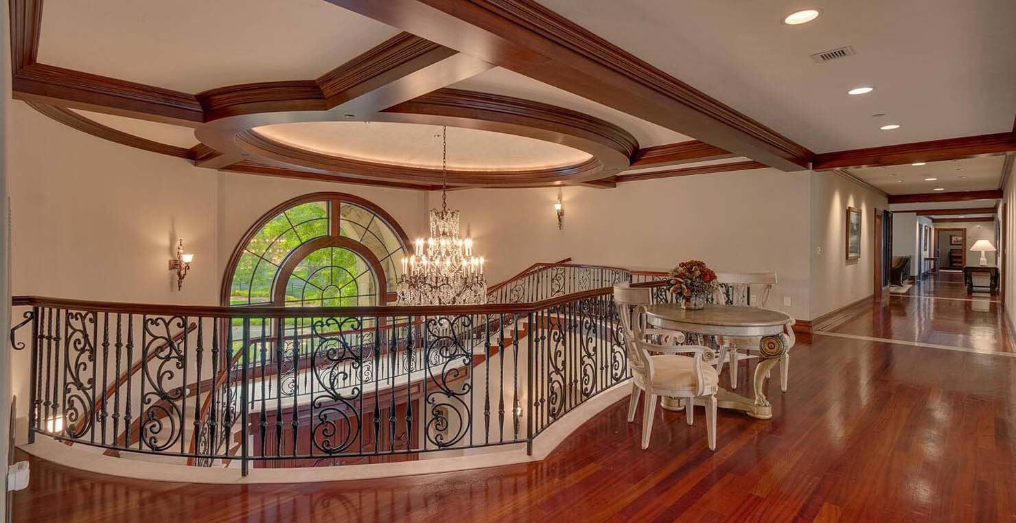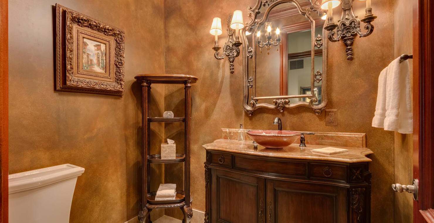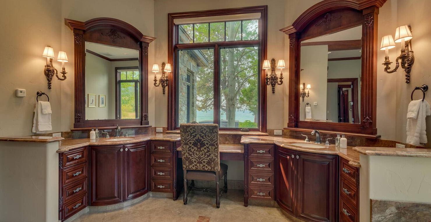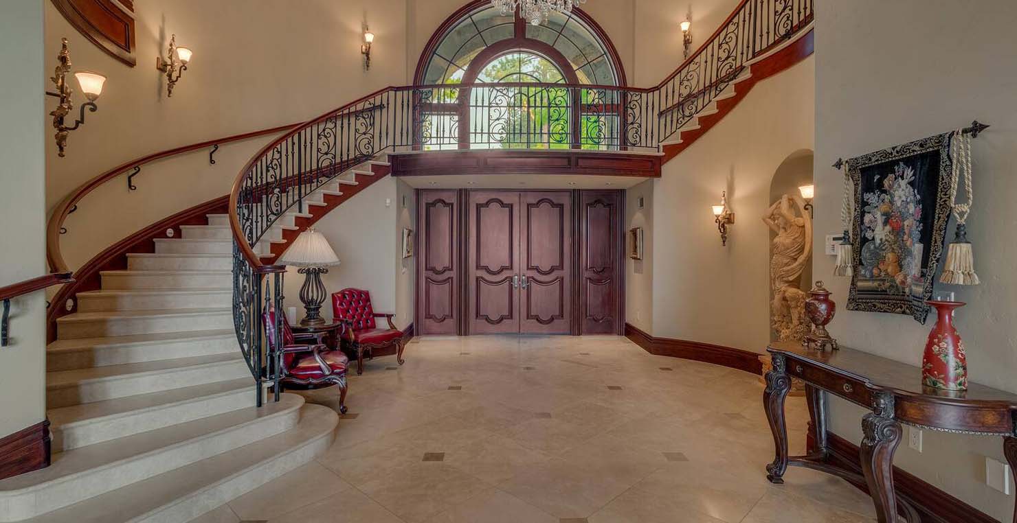 Enter via the tree ensconced road behind a gated frame with Aspen groves on either side and approach the front courtyard with large double doors. An impressive stone, arch entryway greets you. The main entry rotunda has elegant artwork and marble statues, with a grand spiral staircase leading to the second floor. Front and center is a comfortable sitting area, with a cream sofa, matching armchair and outfitted bookshelves. A table by the window provides a panoramic views of stunning Lake Tahoe. To the left, the formal dining room seats 10 comfortably with beautiful blue views, rich woods and a glass armoire with ceramic vases and serving-ware. A pass through pantry offers various coffee makers, sink, ice machine and cabinets for storage.