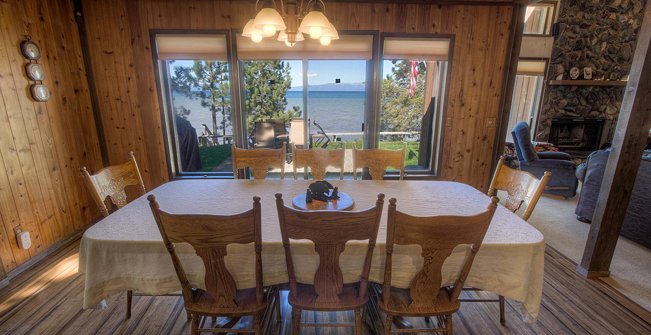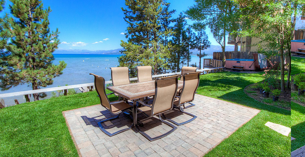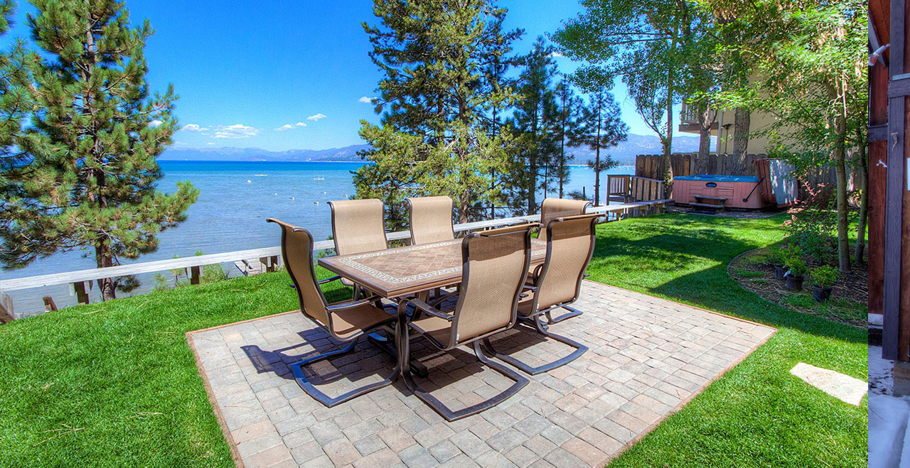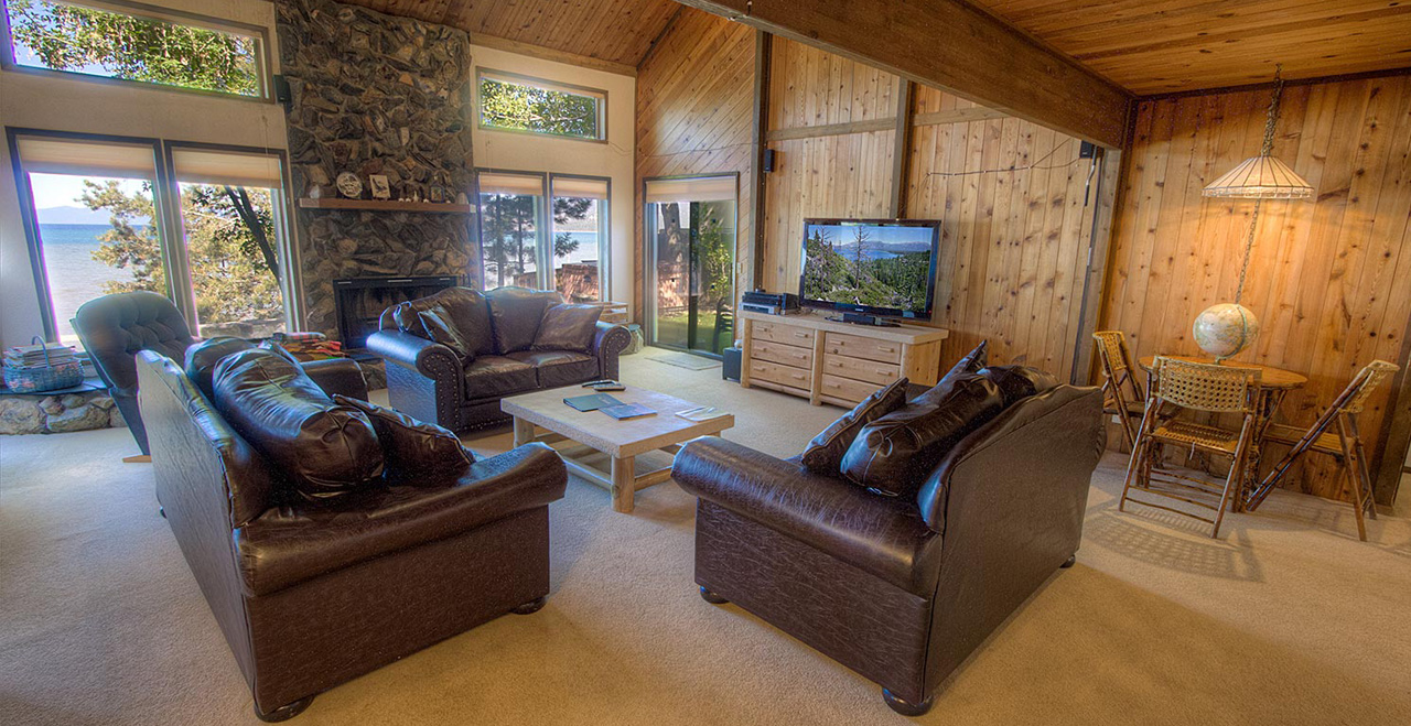 Lake Tahoe lakefront rental with hot tub! This large downstairs living home is located in historic Al Tahoe and is on a bluff overlooking crystal blue Lake Tahoe. Enjoy sunsets and BBQ's while taking in the spectacular view while on the wide back lawn complete with outdoor dining and seating. Slide into the outdoor hot tub and watch the stars glow at Night. Or, relax in the living room with a 52' LCD/High Definition TV and Blue Ray Player with lake views all around. This contemporary lakefront home has the feel of Old Tahoe with vaulted ceiling/cedar siding living room complete with a large rock fireplace. Expansive picture windows invite you to enjoy the spectacular view.