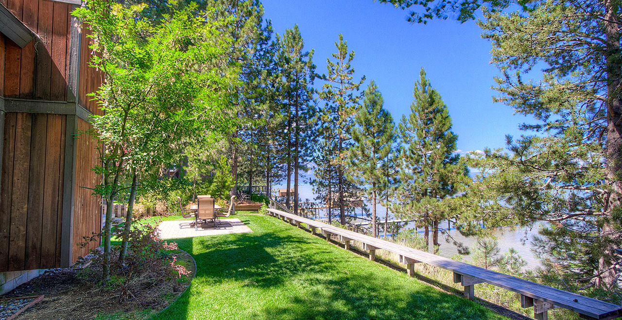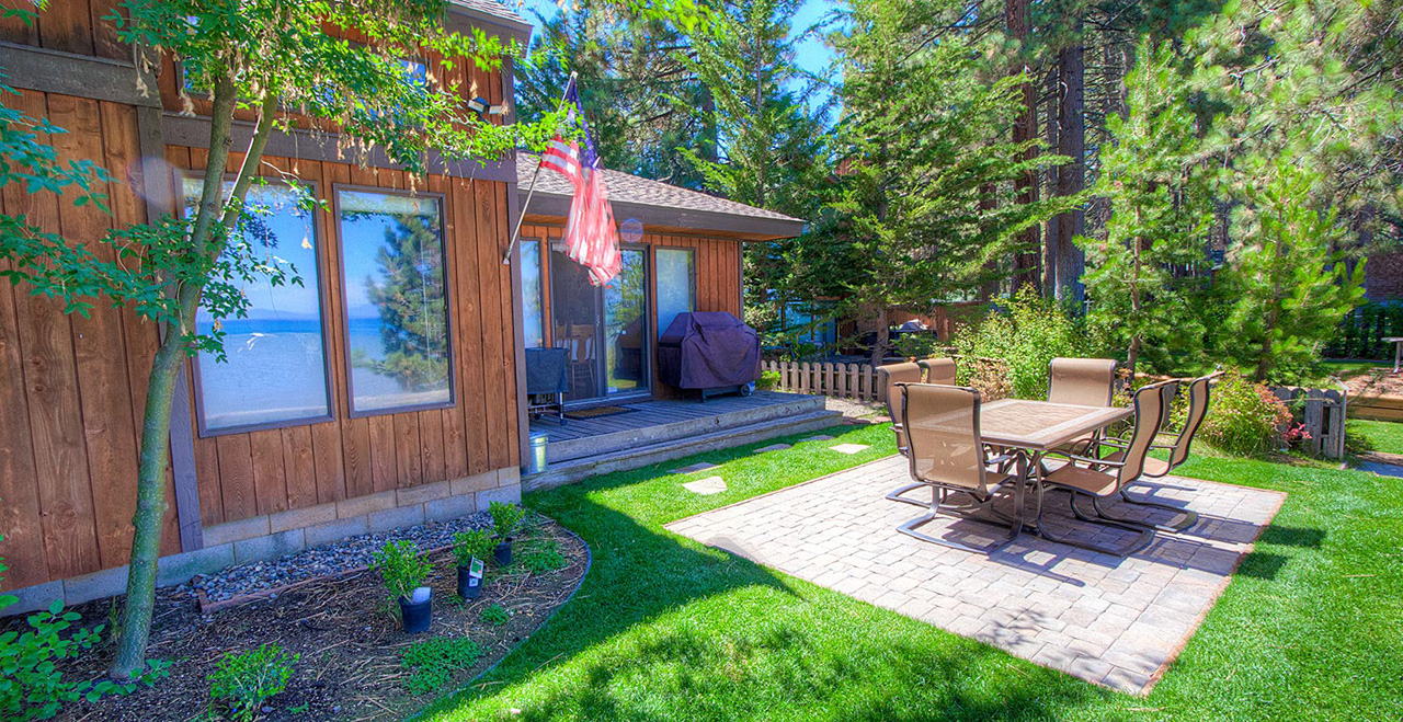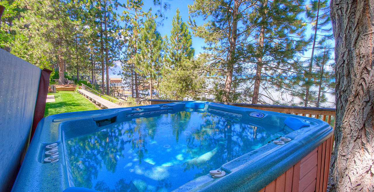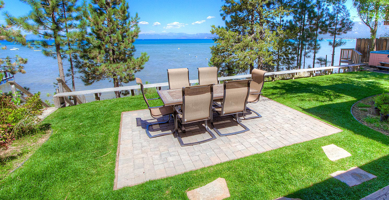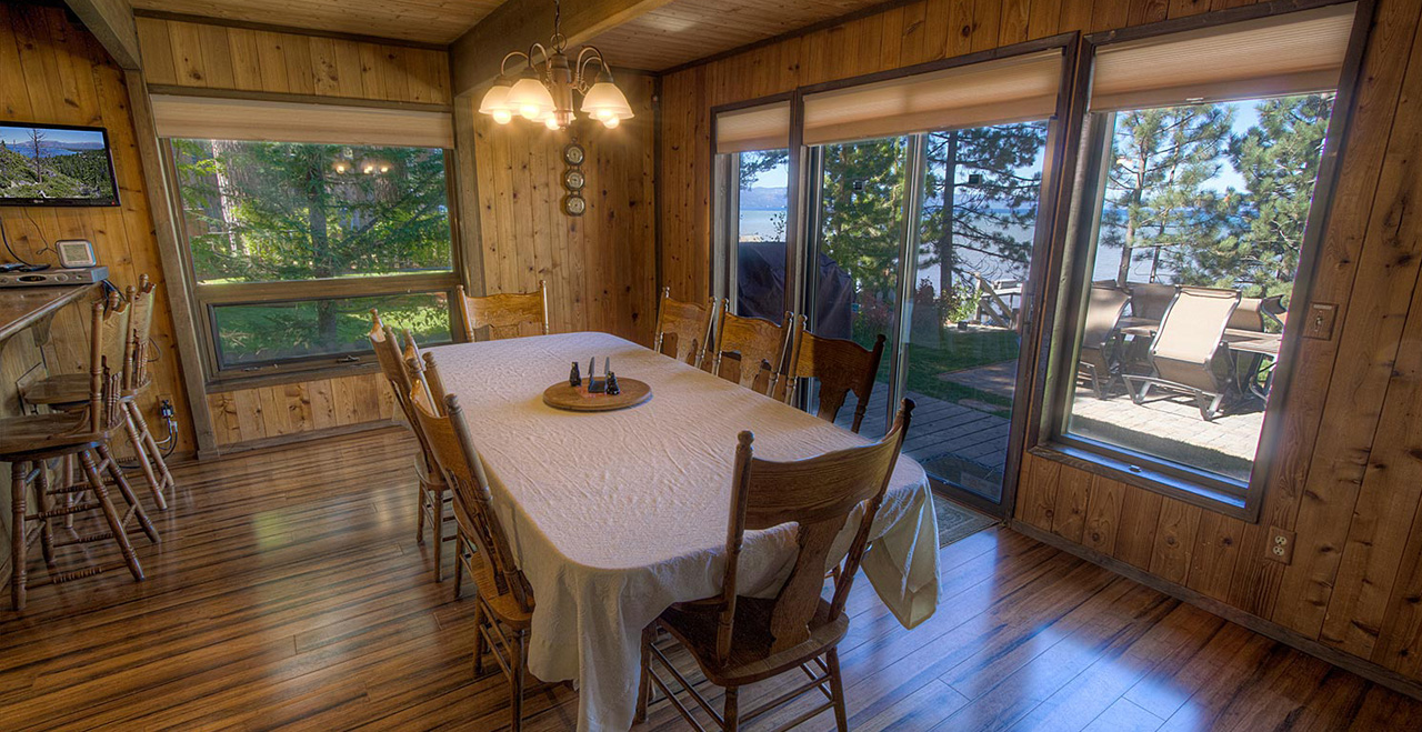 Lake Tahoe lakefront rental with hot tub! This large downstairs living home is located in historic Al Tahoe and is on a bluff overlooking crystal blue Lake Tahoe. Enjoy sunsets and BBQ's while taking in the spectacular view while on the wide back lawn complete with outdoor dining and seating. Slide into the outdoor hot tub and watch the stars glow at Night. Or, relax in the living room with a 52' LCD/High Definition TV and Blue Ray Player with lake views all around. This contemporary lakefront home has the feel of Old Tahoe with vaulted ceiling/cedar siding living room complete with a large rock fireplace. Expansive picture windows invite you to enjoy the spectacular view.