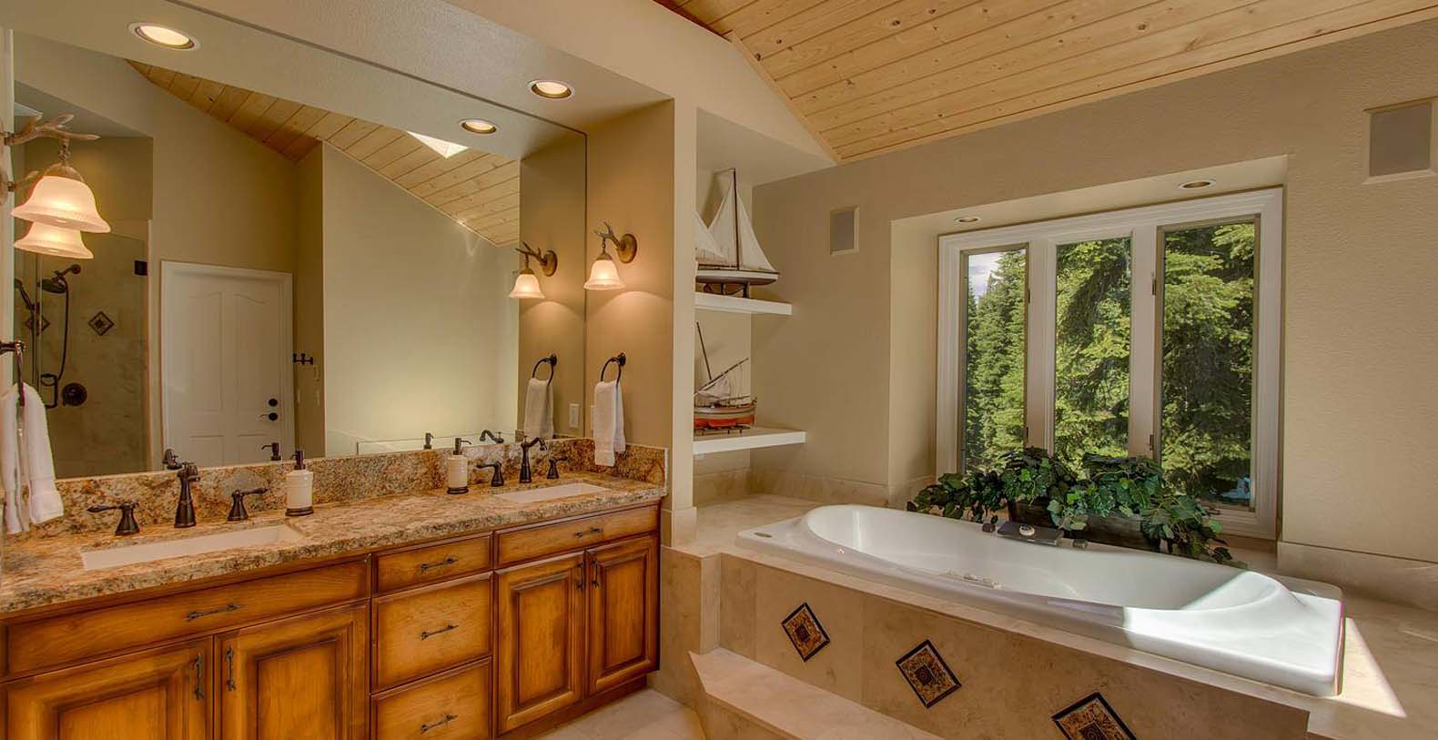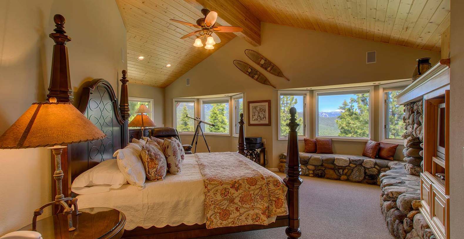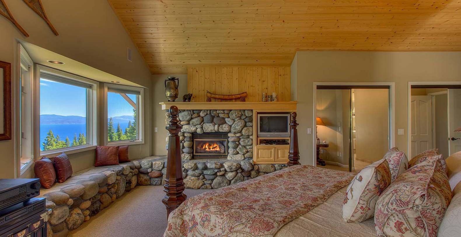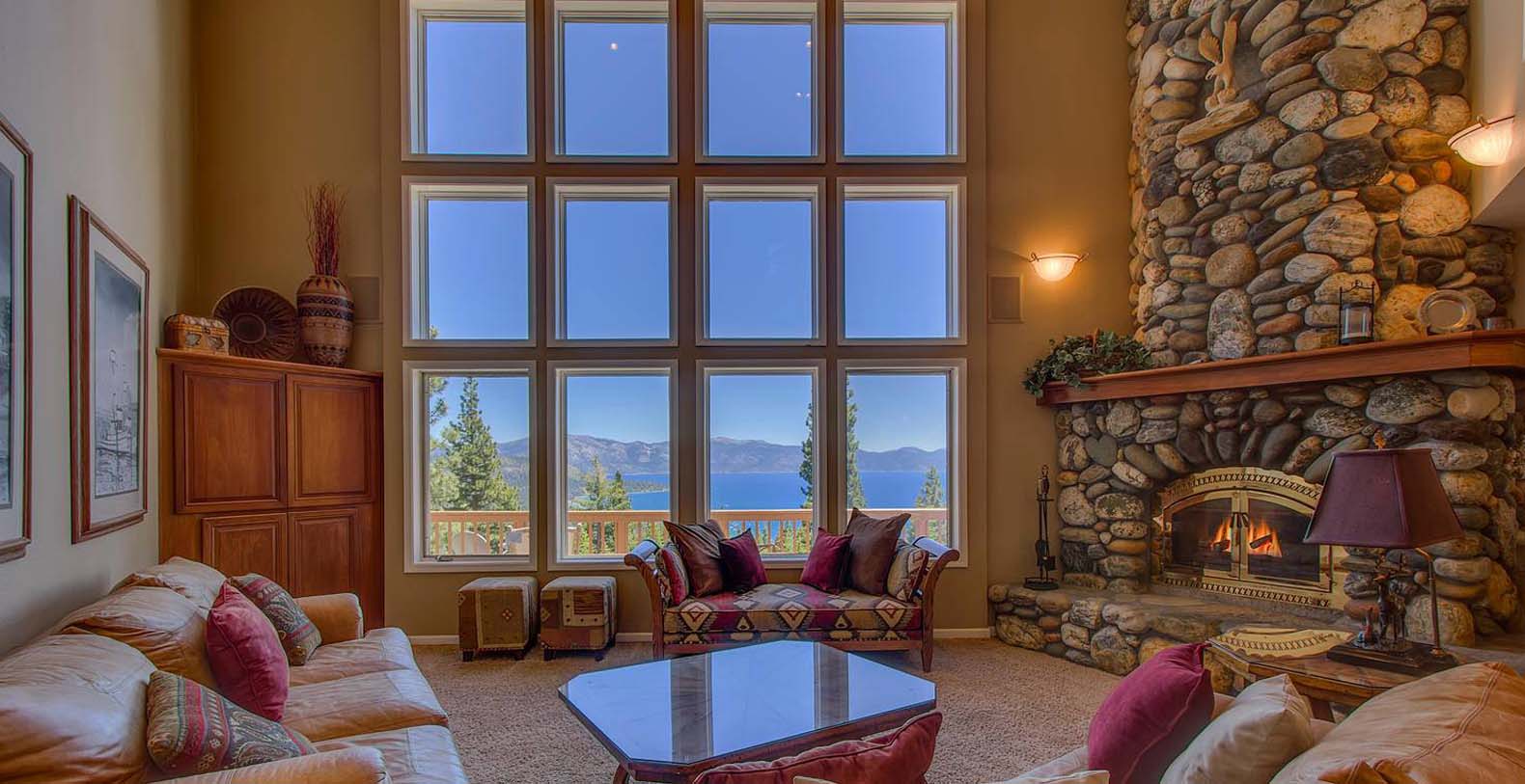 As you walk in the home, the ceiling soars up 30 feet with a full wall of windows that overlook the beauty of Lake Tahoe. The kitchen is designed for those who enjoy cooking. The master bedroom also has a lake view and rock fireplace as well as a extra large master bath with jacuzzi tub.