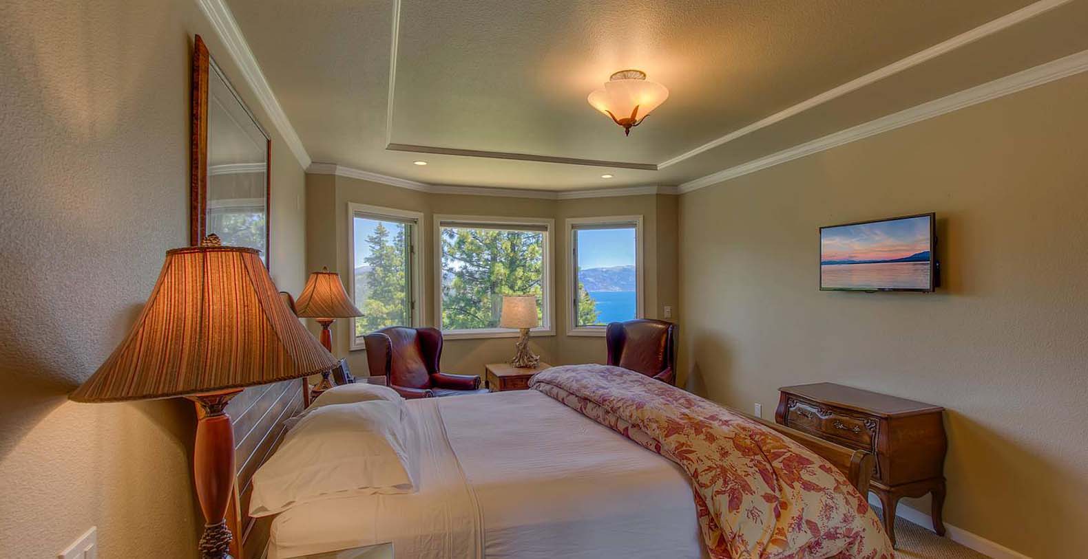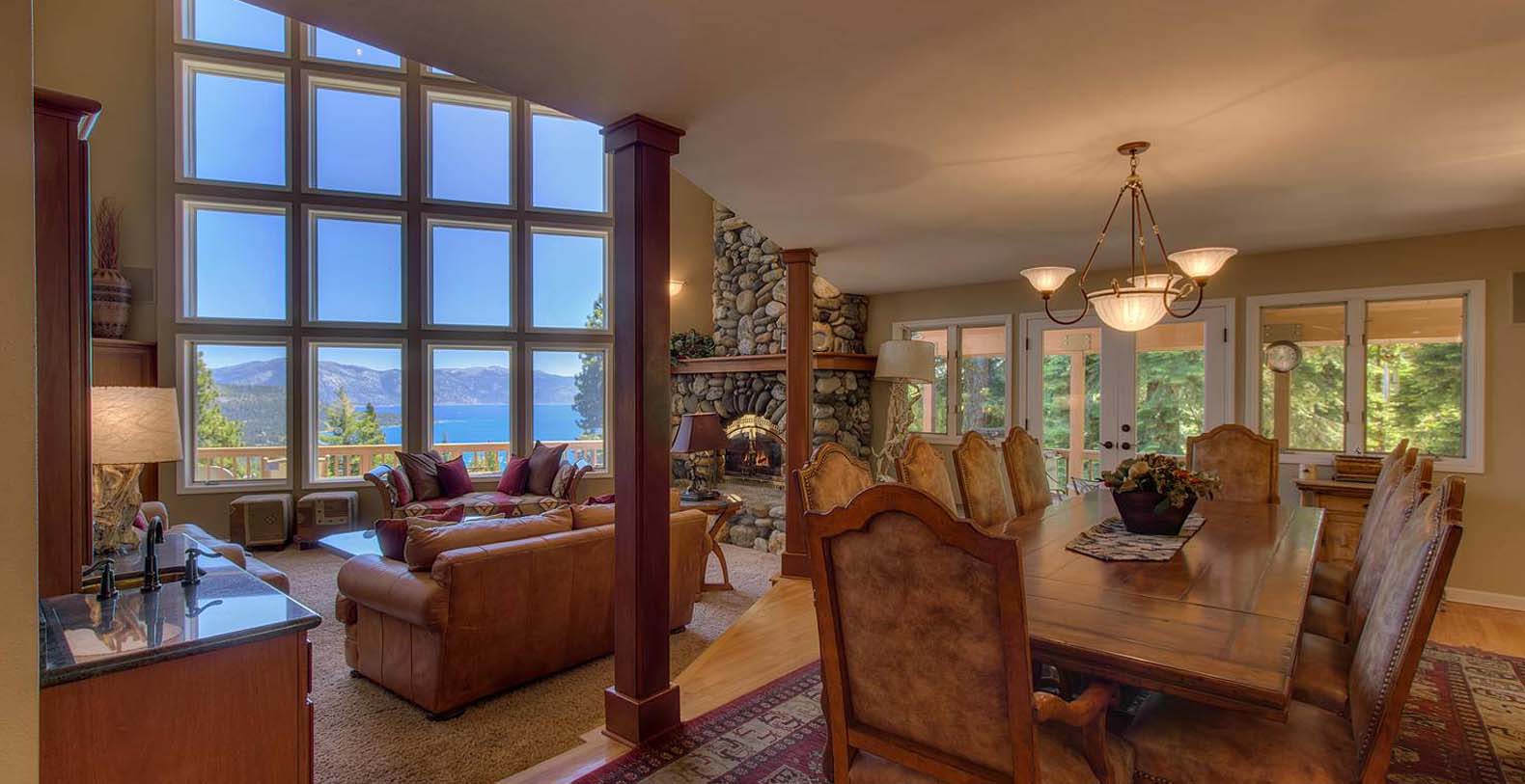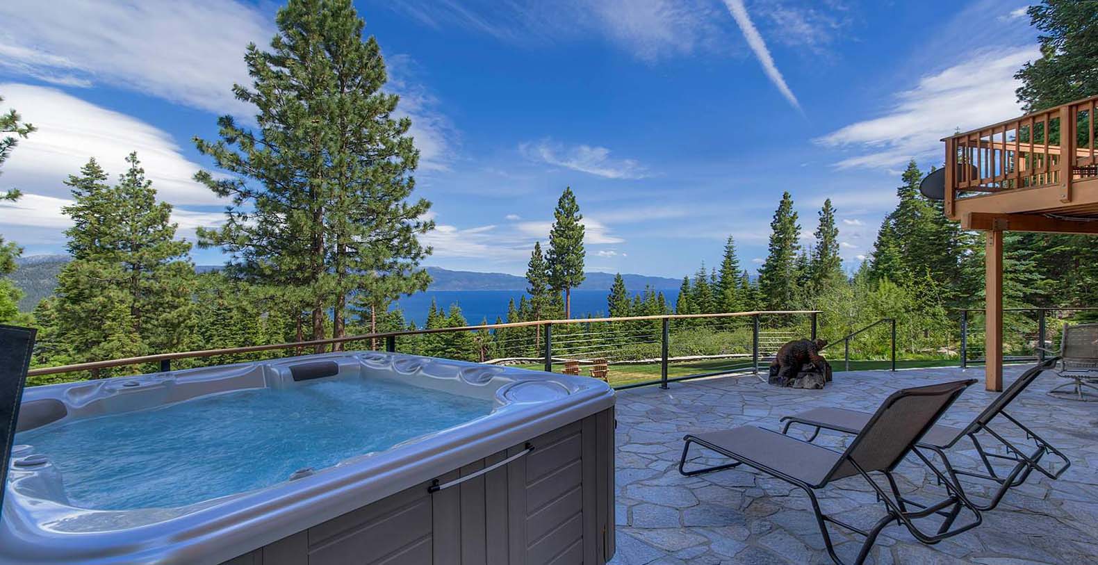 The home is spacious enough for the whole family. The family room has a pool table and sectional sofa with large screen television. Walk out from the family room to the 1,400 square foot Quartzite patio and hot tub looking over the lake and open to gaze at the stars. Get your workout done in an extensive gym. You will enjoy beautiful lake and mountain views throughout the entire home from Diamond Peak Ski area to Heavenly Valley.
