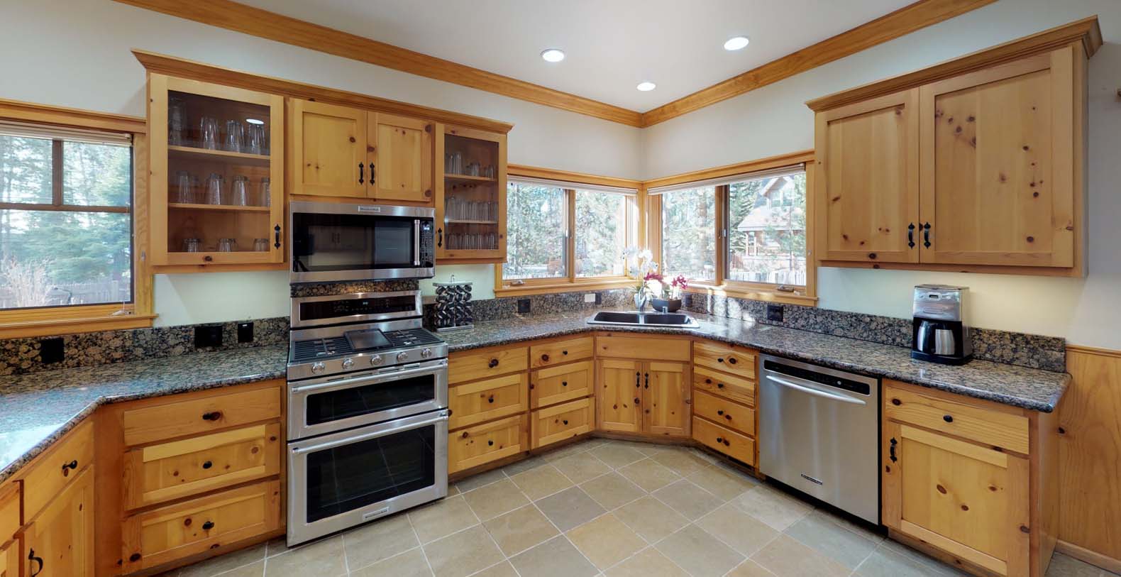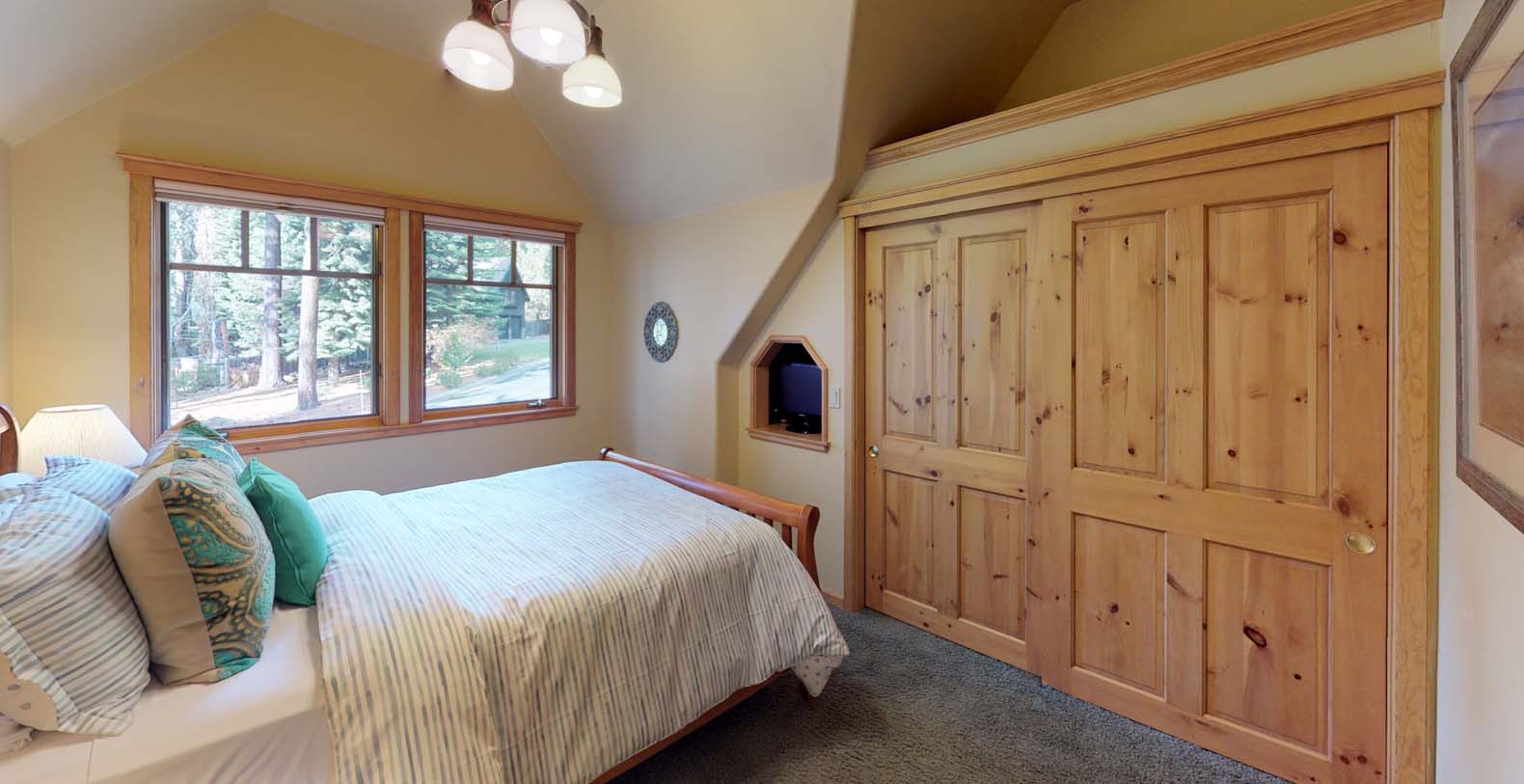 Tahoe Vista Manor is a beautifully built and tastefully furnished vacation rental home encompassing mountain craftsman style. The relaxing setting, large yard, and convenient location will make your Tahoe getaway complete with easy access to winter and summer fun. Park your boat in the level driveway, and then launch the next morning at the public beach just two blocks away. In the evening, take a stroll down the street for dinner, and enjoy an ice cream cone next door from Bud's Ice Cream Shop. If dining at home is your preference, barbecue with your party on the deck in the beautifully landscaped, large fenced yard. Inside, the main floor living area boasts a cozy wood-burning fireplace (with a gas starter). The generously sized kitchen with granite counters, gas stove and microwave will delight any culinary enthusiast. Upstairs are four bedrooms, each with its own television, plus three full bathrooms. Tahoe Vista Manor is perfectly situated between Tahoe City and Kings Beach, allowing for convenient access to both areas for endless, year-round fun.