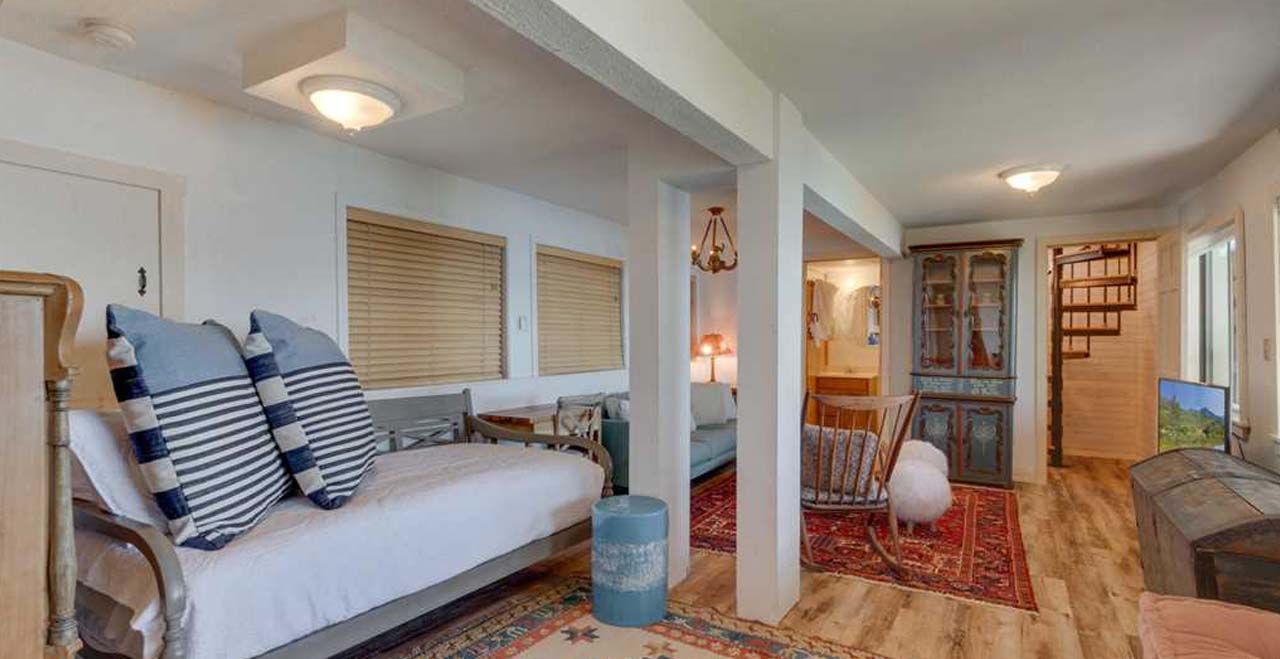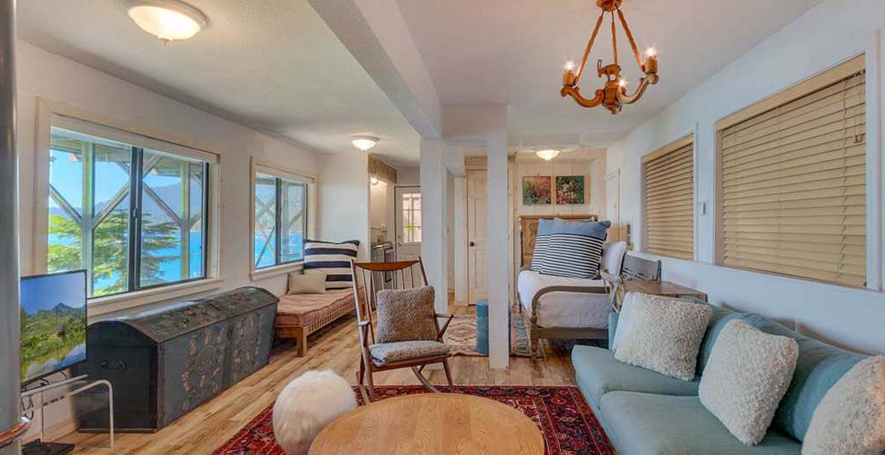 Outdoors on Meeks there is more than your share of eye candy as you see the beauty of the Lake and the surroundings. The large deck showcasing panoramic views from the south to the north shores, granite boulders surrounded by turquoise blue waters and a large dock are ideal for sunbathing or simply watching the kayaks drift by. This cozy cabin has Pickwick pine walls, exposed beams, marble kitchen counters and warm wood floors, creating a feeling of warmth and classic attractiveness The living room and kitchen have large windows allowing the sun to stream in while adoring eyes look out over the wondrous, vast blue. If you are seeking a dream-like vacation experience in a lakefront cottage, the this is your spot!