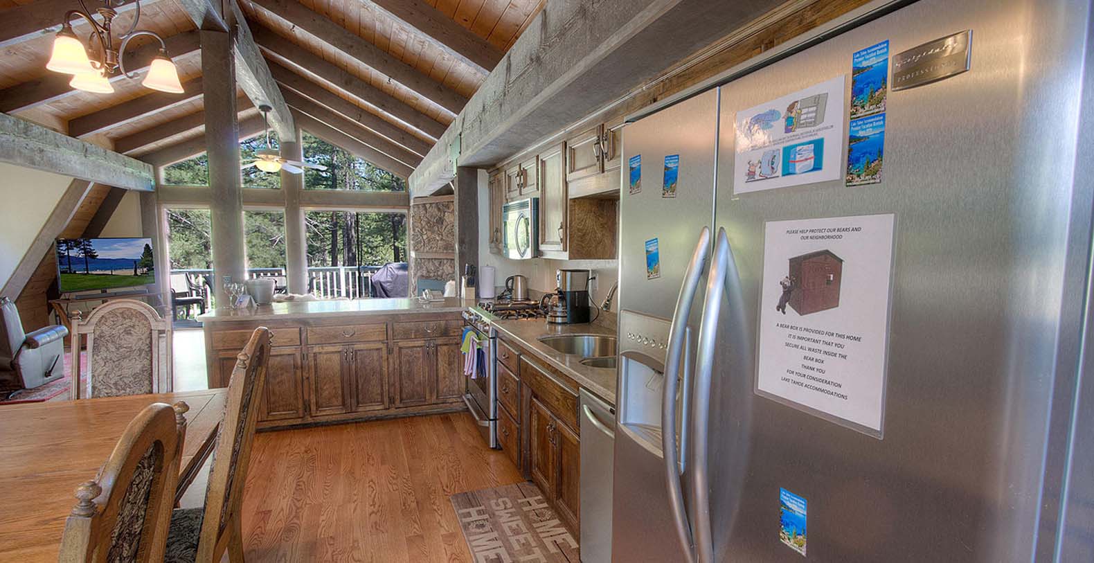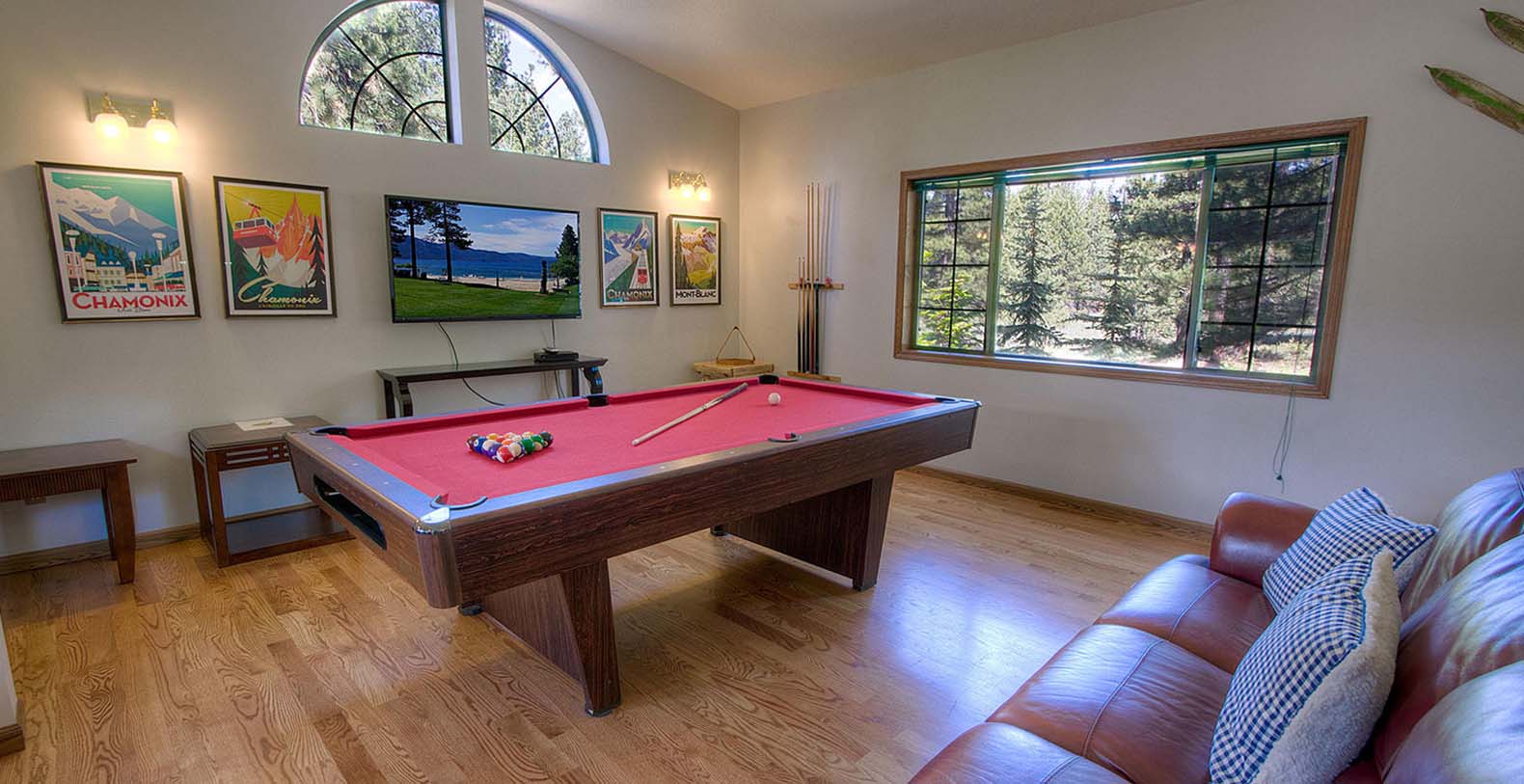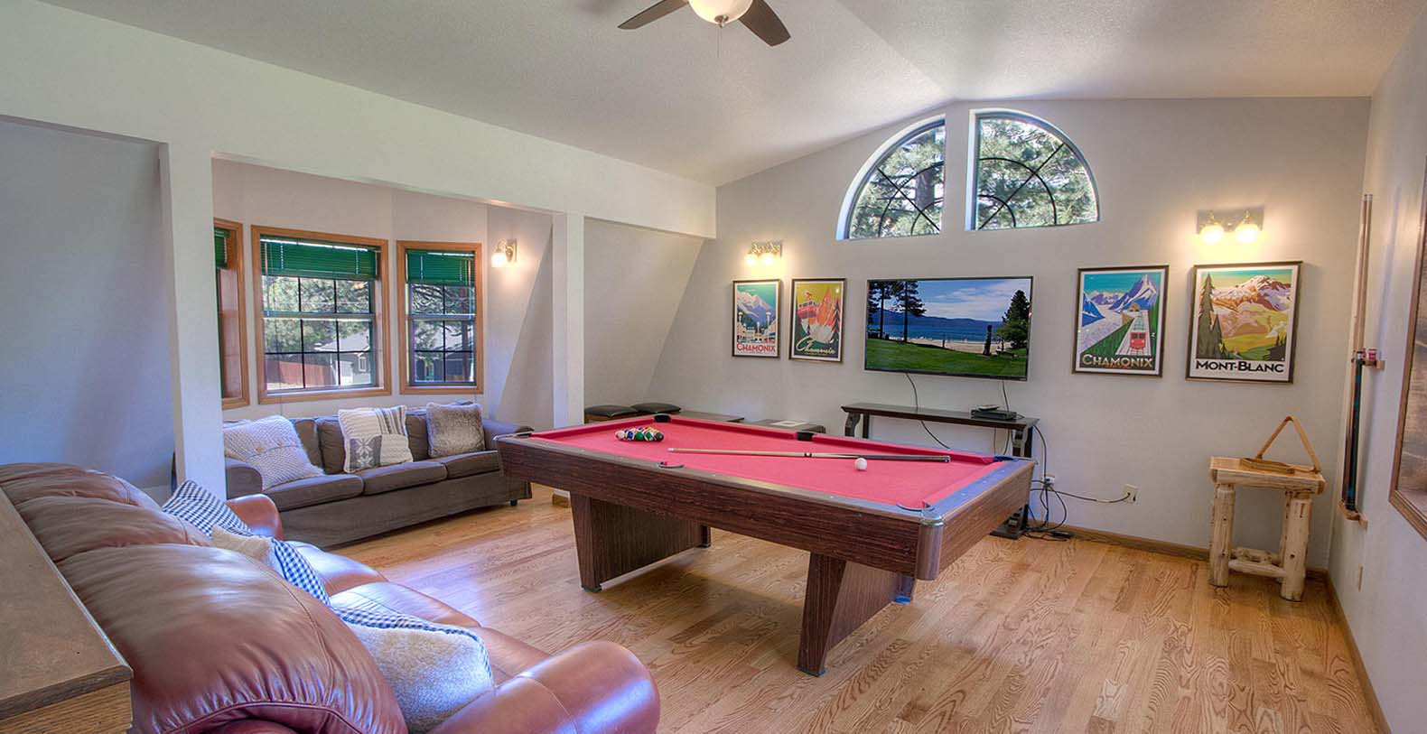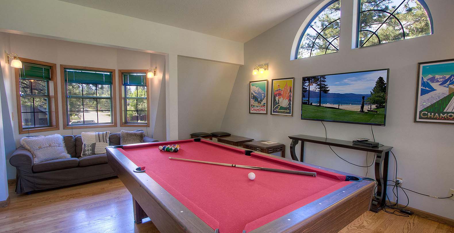 Spectacular remodeled Gambrel style home with all the amenities to be the perfect vacation rental! Not only do have a wonderful game room with a newly felted pool table, the room has plenty of seating and a 55" flat screen TV! The upstairs living room features plenty of seating for your entire party, another 55" TV, a large deck with patio seating, and views of the beautiful trees from all windows! The kitchen has been remodeled with stainless steel appliances and new counter tops. All bedrooms are downstairs and you will find a 40" flat TV in the master, bedroom 3's bunk beds are a single on top and a very comfortable queen size futon on the bottom, access to the fully landscaped yard through bedroom 4 or the foyer where you will find a large patio. This home has got it all, even high speed wireless internet access! Only 10 minutes to everything Lake Tahoe has to offer, plus walking distance to miniature golf! This home is one-of-a-kind and perfect any time of year!