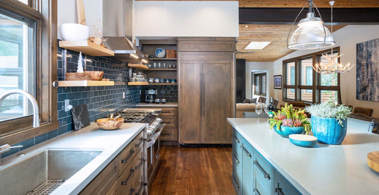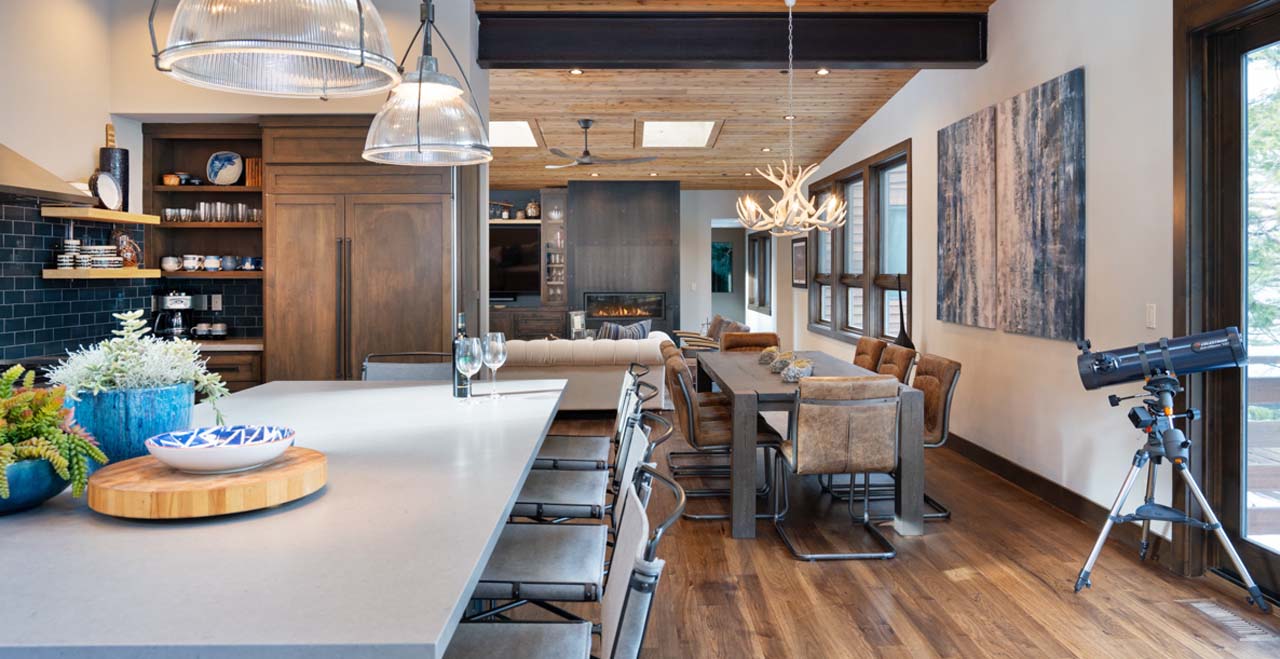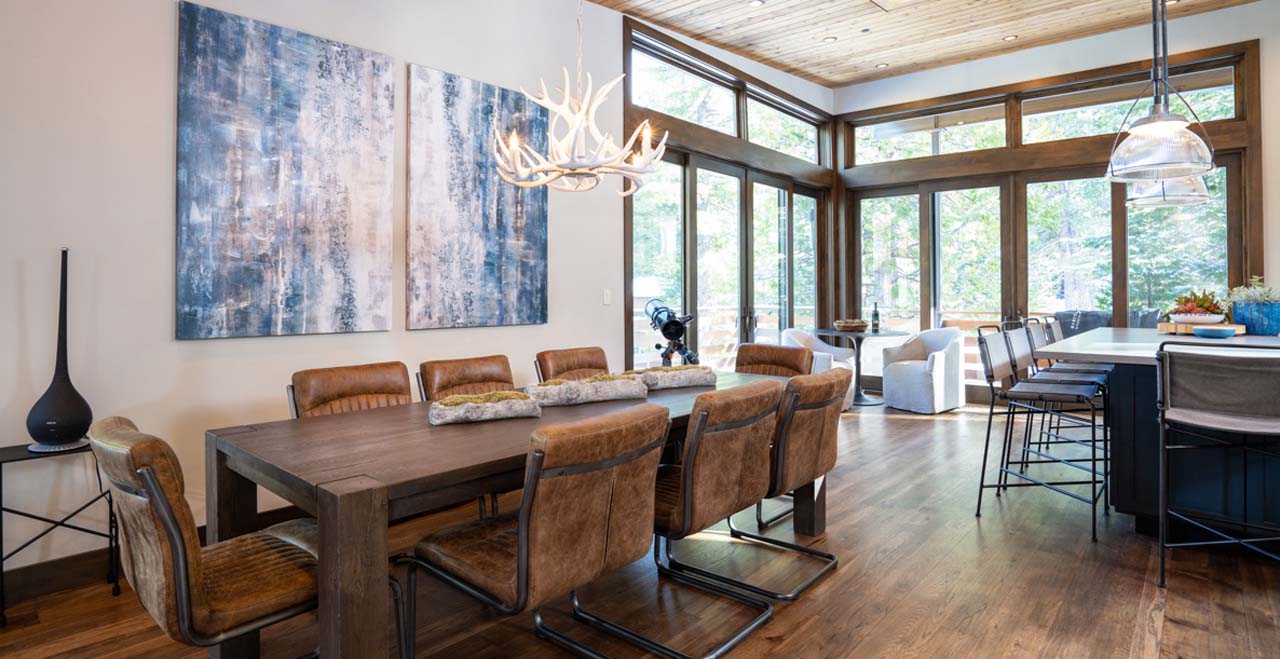 The great room flows seamlessly into the dining area and gourmet kitchen, with an 8-seat formal dining table and 5-seat breakfast bar easily accommodating up to 13 guests for dinner. A separate sitting area offers the perfect spot for morning coffee with a view. Find inspiration for home-cooked meals from the wall of glass overlooking the wrap-around deck, or discover hidden talents at the gourmet gas stove. A gas grill outside offers further inspiration for summer evenings or blue-bird winter days.