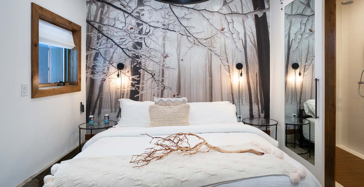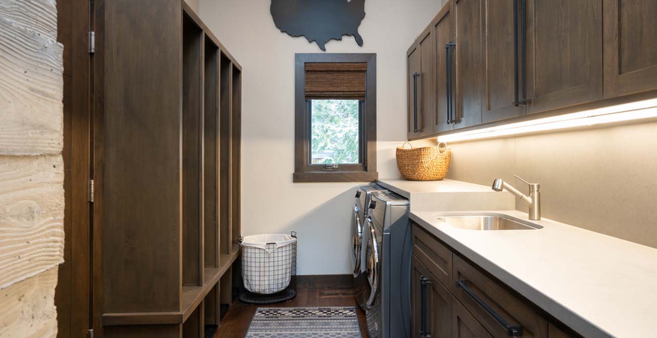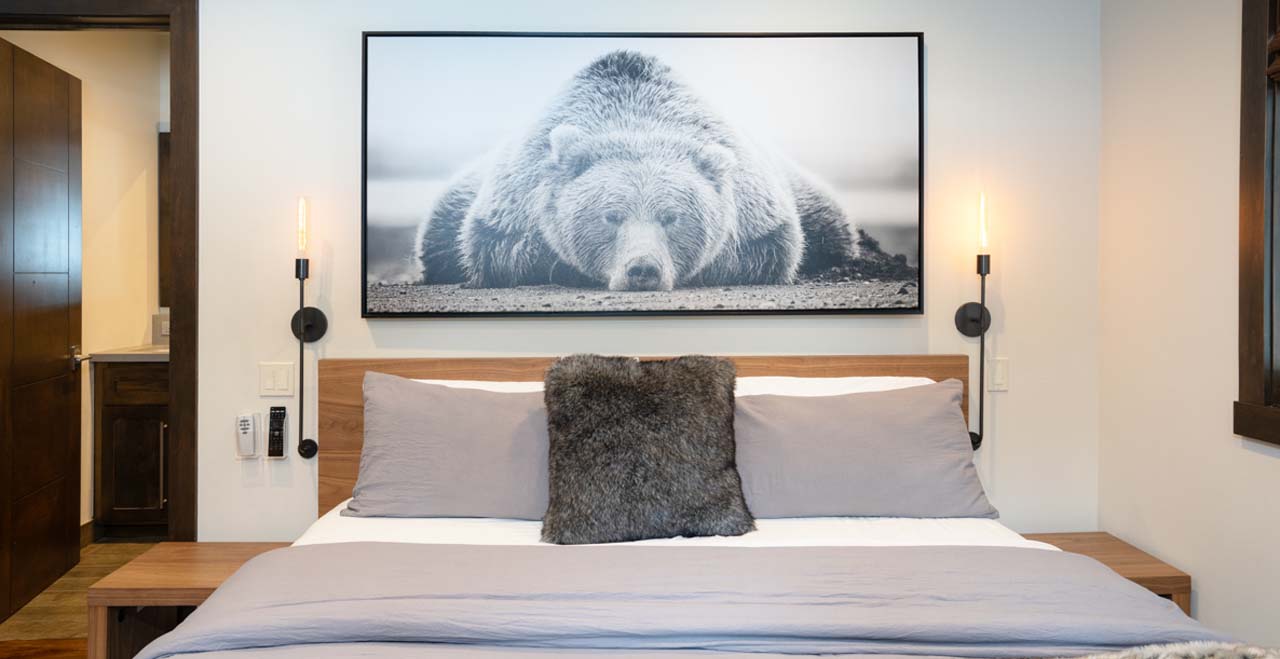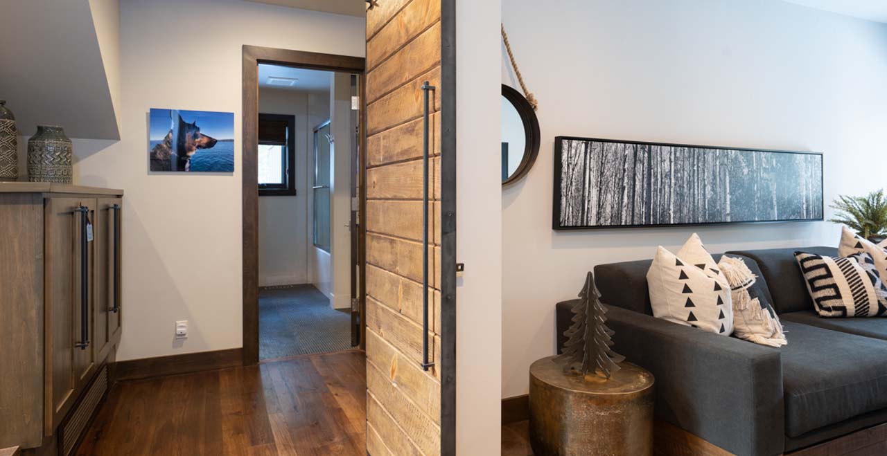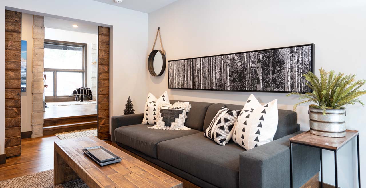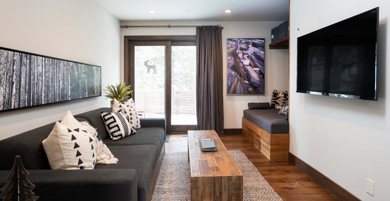 Designed in a style reminiscent of Frank Lloyd Wright, the two-story cabin opens on the upper level with an entertainer’s layout, featuring hardwood floors and airy skylights. A full-length sofa and two modern club chairs face a linear gas fireplace and large-screen SmartTV, flanked by large picture windows revealing a canopy of evergreens outside.