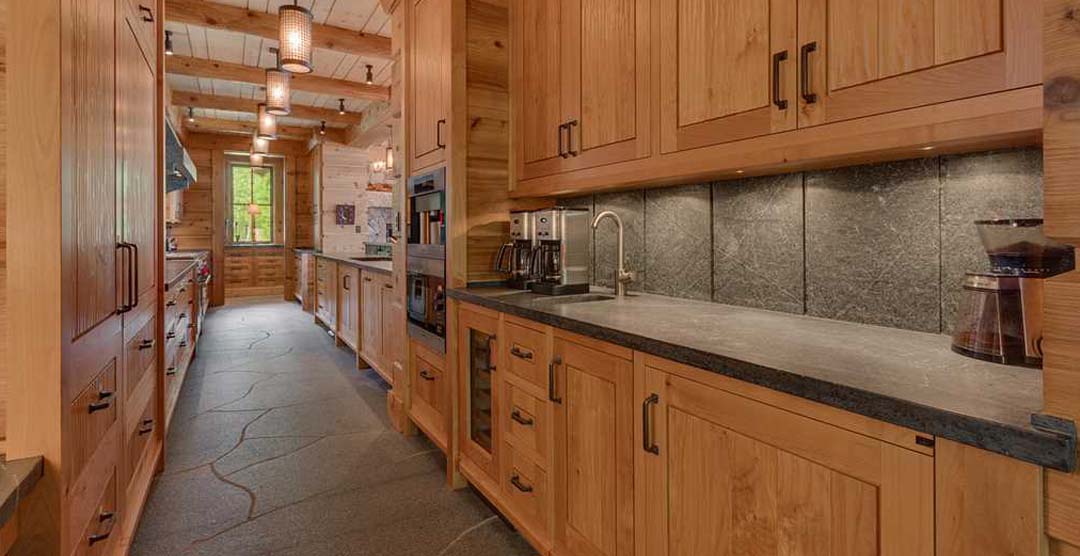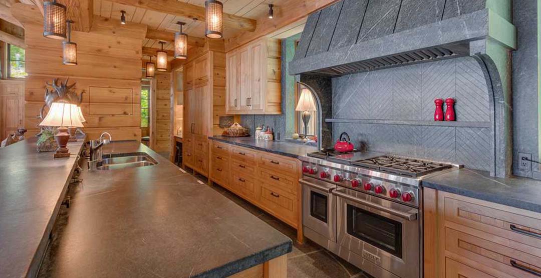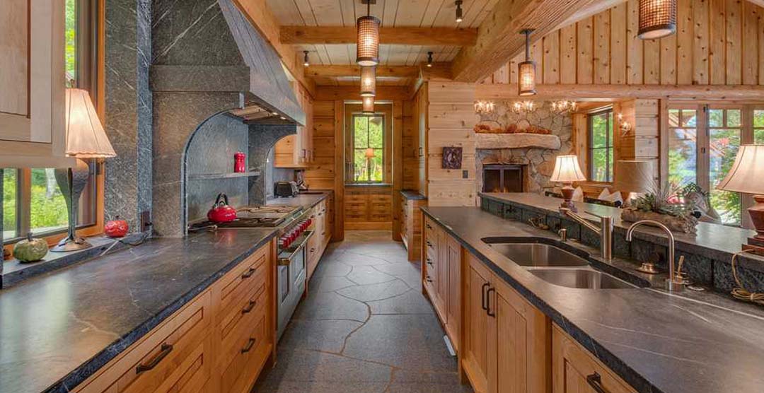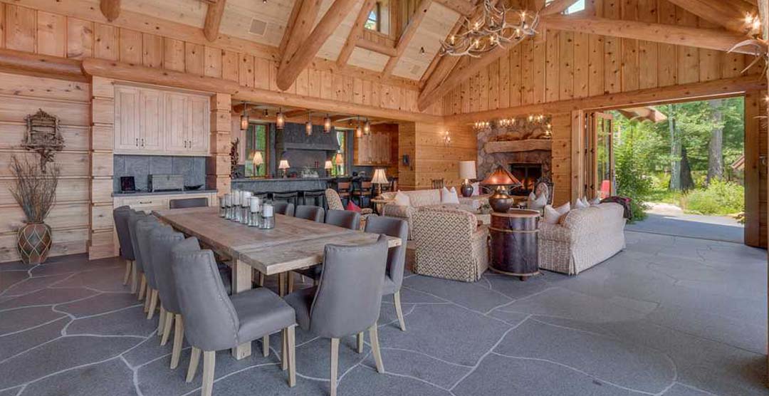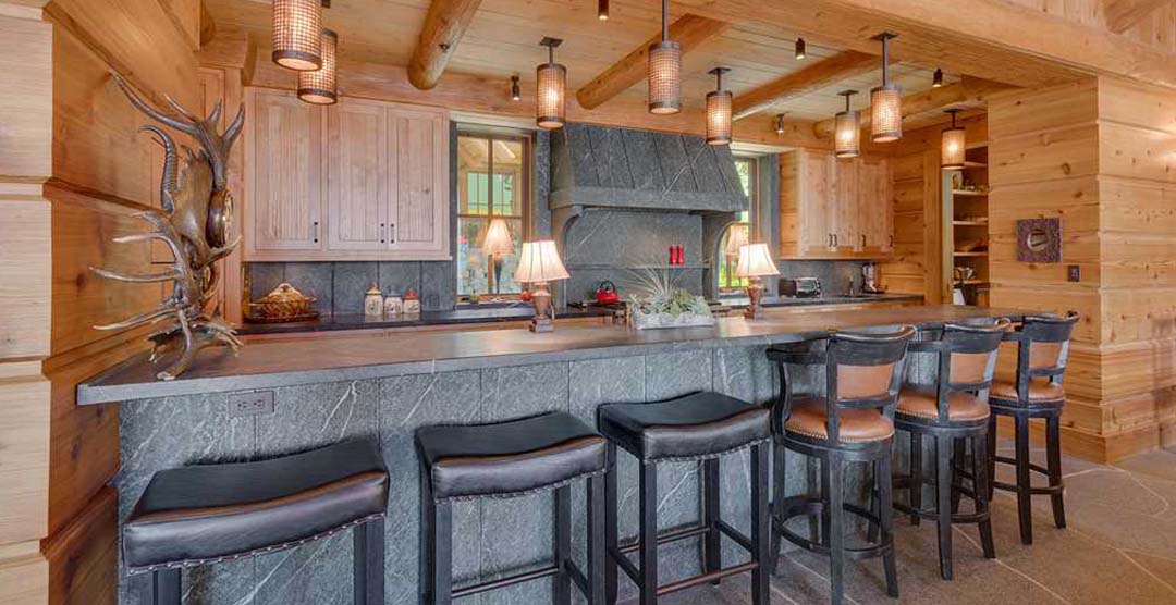 The rustic exterior of this 7,652 square foot, lakefront vacation rental home was achieved by mixing cedar logs, poplar bark shingles, grizzly granite veneer, and copper with a combination asphalt shingle and living roof.
