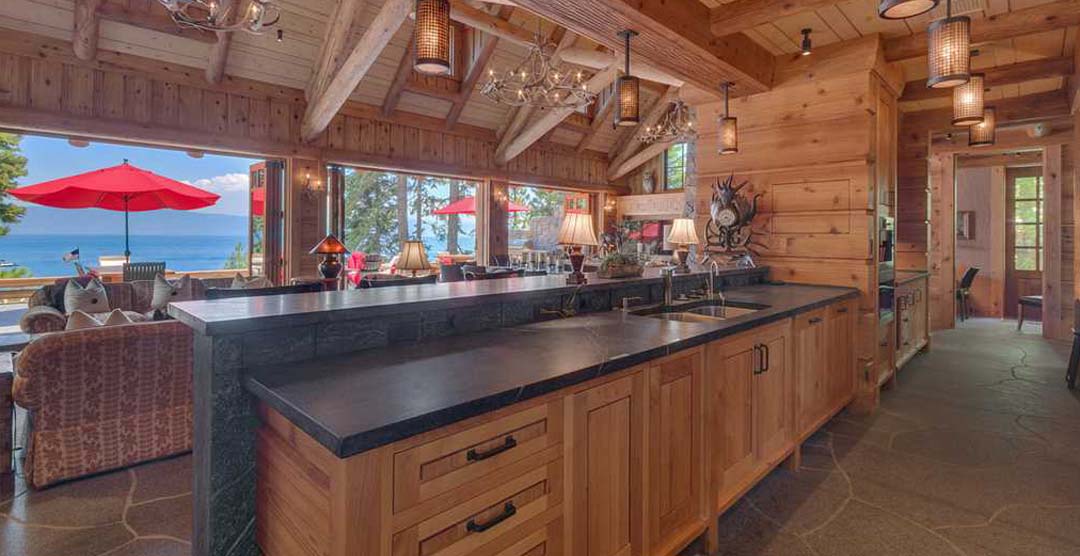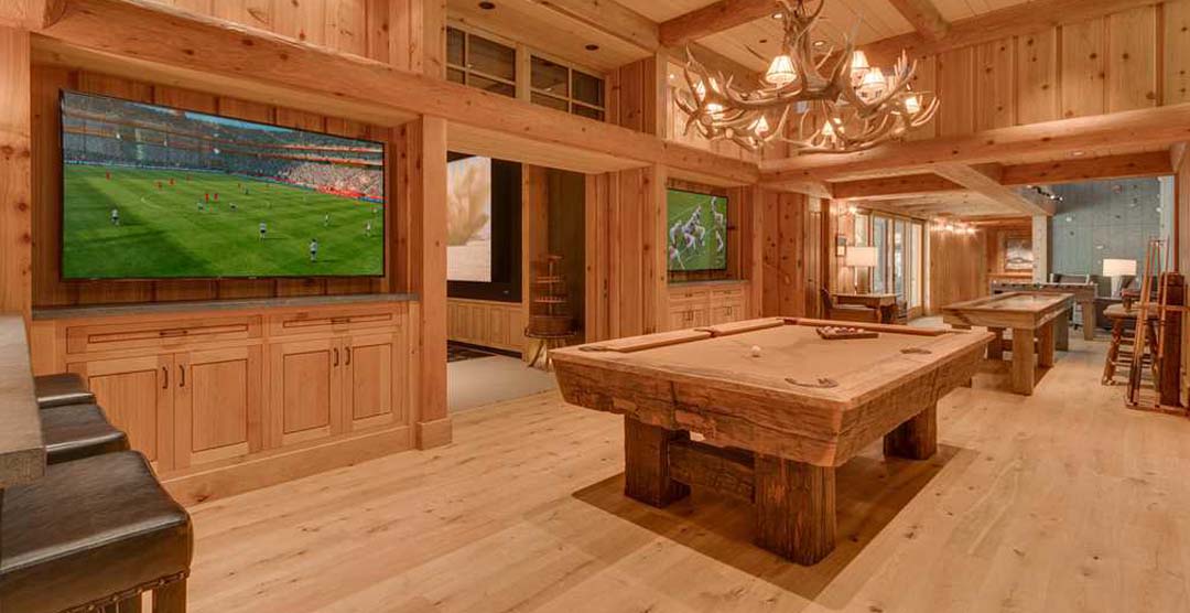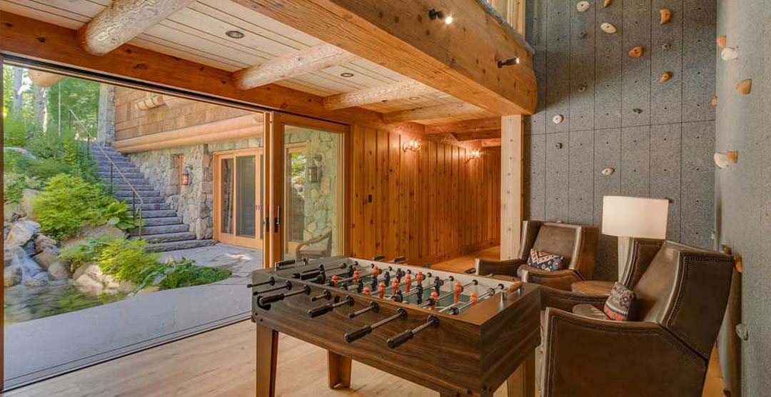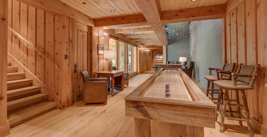 You will find breathtaking views of Lake Tahoe from the great room, kitchen and two bedrooms. Oversized French doors bring the outside in. You'll find endless ways to relax and enjoy your Tahoe getaway. A home theater in the lower level seats 16. An adjacent billiards room is complete with a wet bar, dual large screen televisions, and shuffleboard for entertaining the adults while the kids enjoy the built-in climbing wall and playroom.