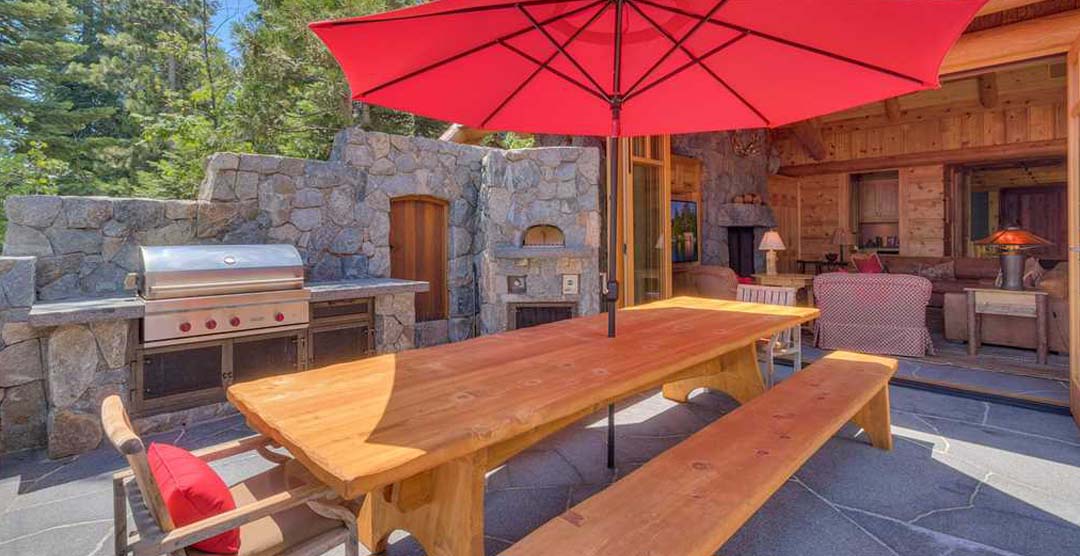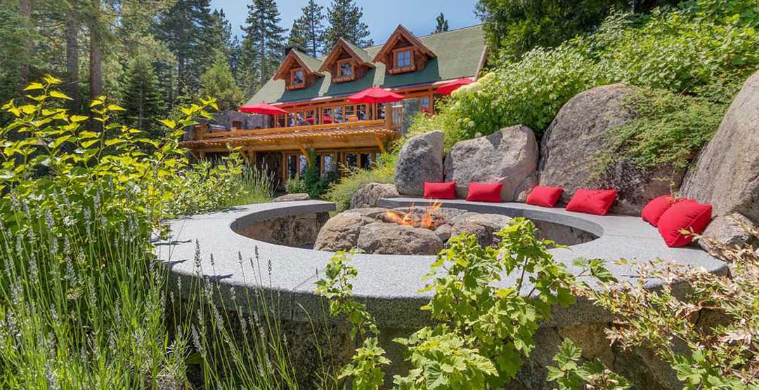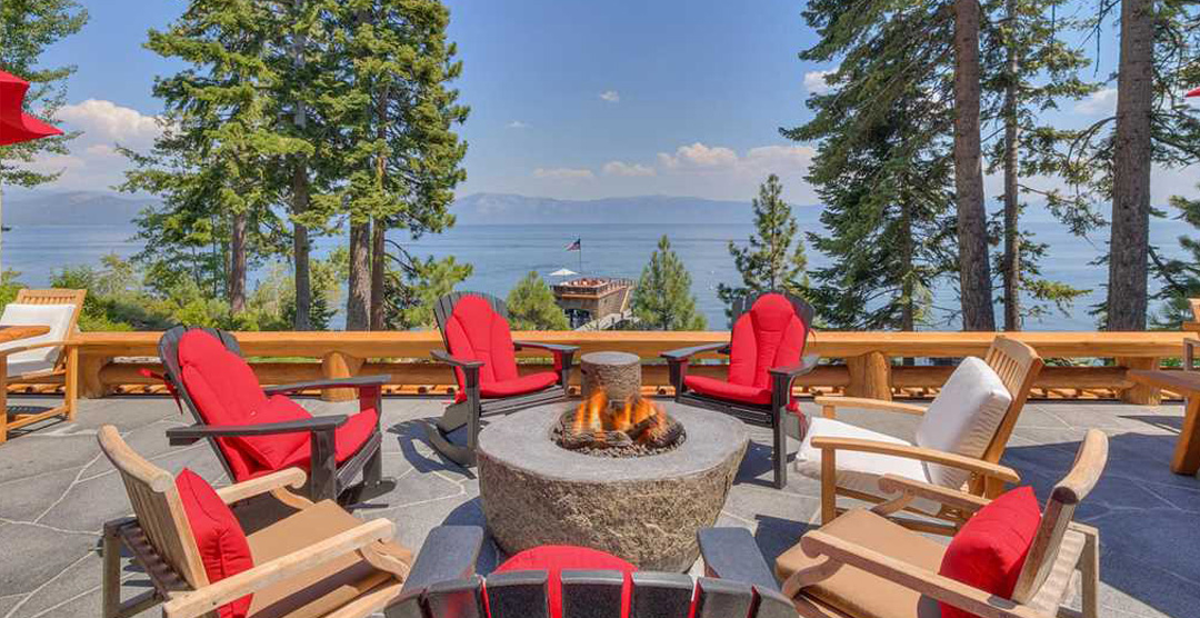 The exterior rear patio features a pizza oven and barbecue. The gas-lit fire pit nestled by a boulder outcrop on the lawn faces Lake Tahoe. This luxury lakefront vacation rental truly has it all!