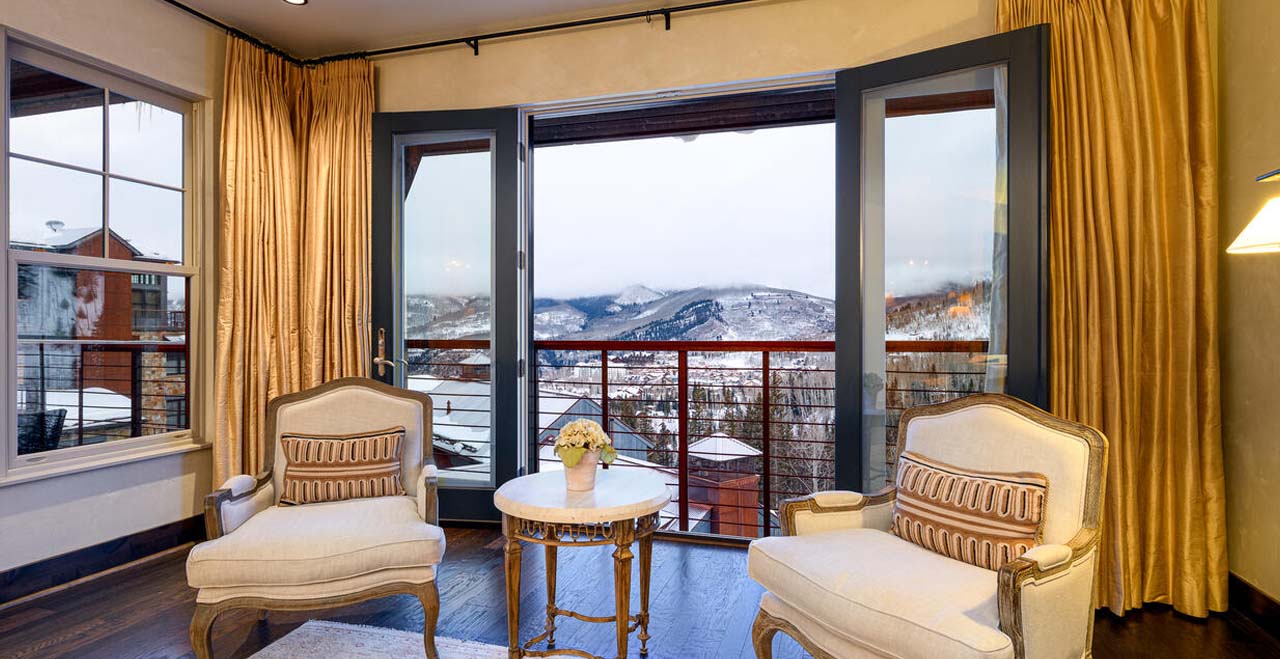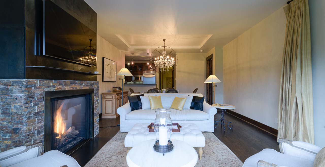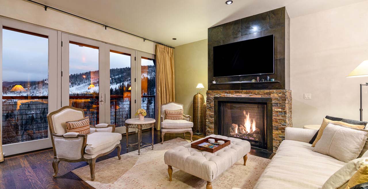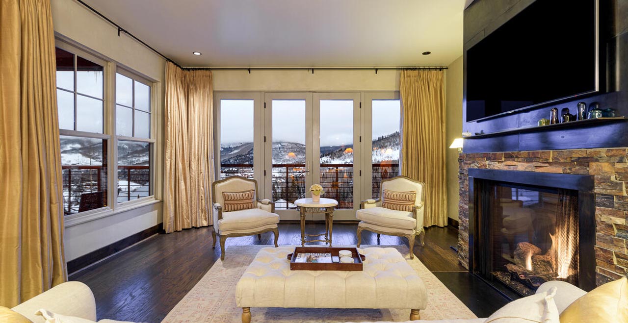 Gorgeous home with luxury design, spacious living areas and easy ski access. The main living area is fit for royalty, with cascading drapes, French country armchairs, and a view of the iconic ridgeline that can’t be beat. In the center of it all there’s gas fireplace, and above it, a large flat screen TV.