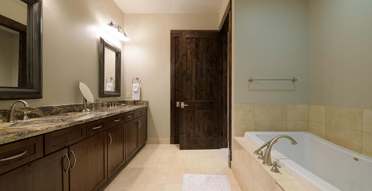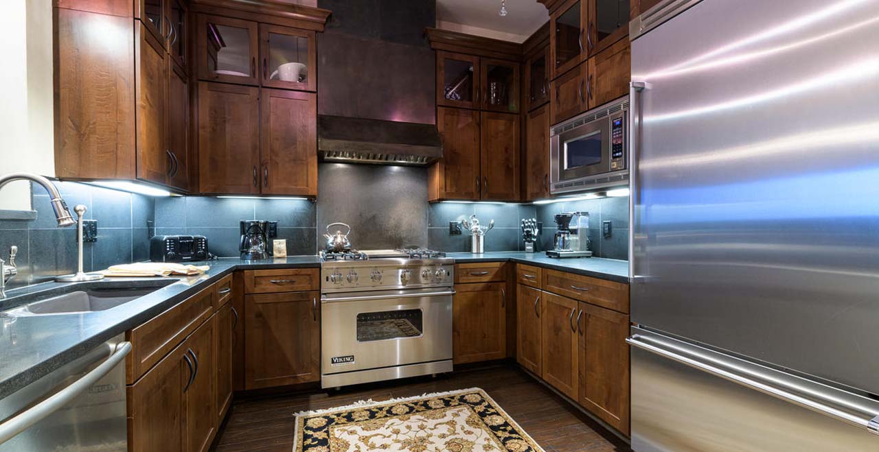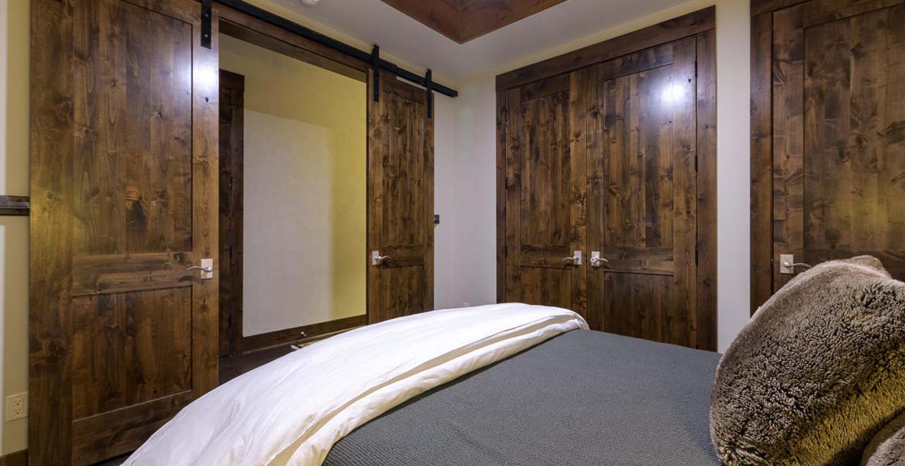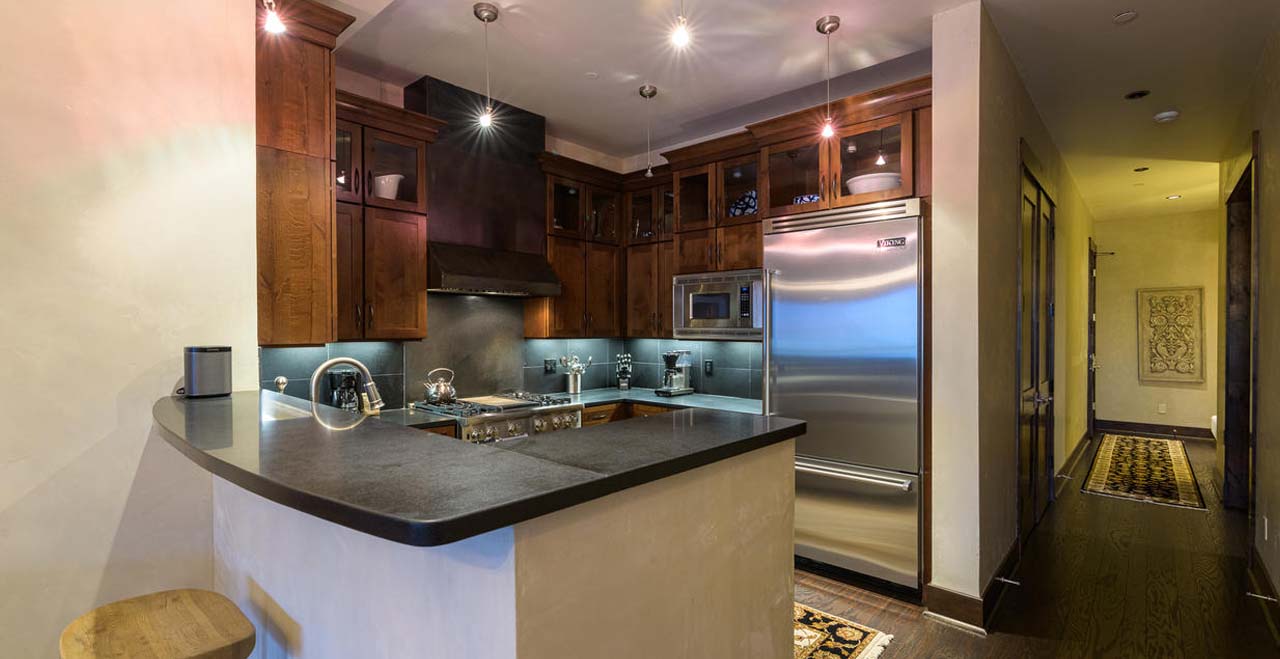 In the kitchen, modern lighting and sleek design complement the traditional wood cabinets, and the stainless steel appliances provide an exceptional environment cooking. The Master Bedroom takes luxury to a new level, with king-size bed complete with a tufted headboard, a gas fireplace, and access to the balcony. In the attached Master Bathroom, there’s a large tub and a walk-in, frameless glass shower for rejuvenating after a day on the mountain. The guest bedroom features unique sliding barn-style doors, and is located near a shared bathroom with single sink and a shower/tub combination.