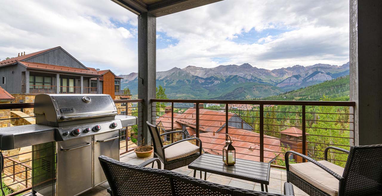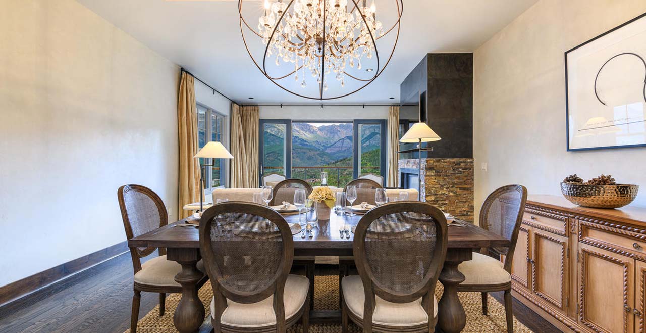 The open-concept space encompasses the dining area as well, which features a table set for six guests beneath a lavish chandelier. From the balcony, you’ll have unobstructed views of the rugged Dallas Divide and down valley below. Here you’ll find a grill and outdoor seating that let you cook and relax while admiring the truly staggering mountain backdrop.
