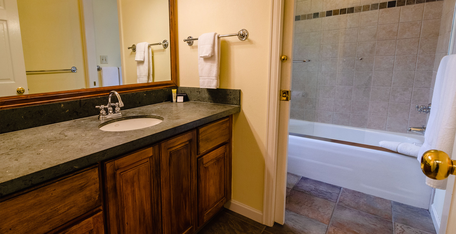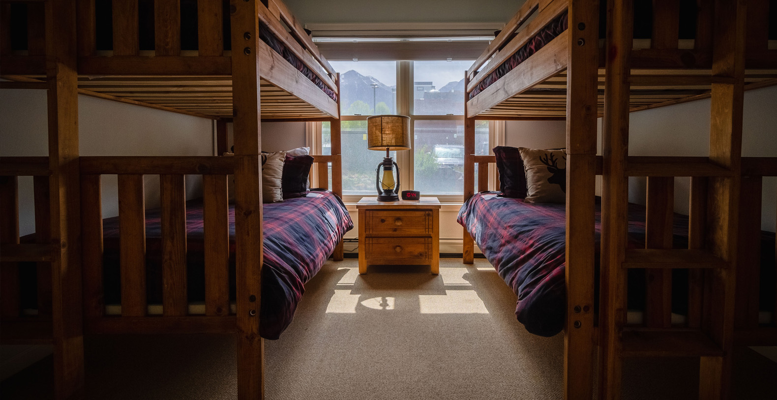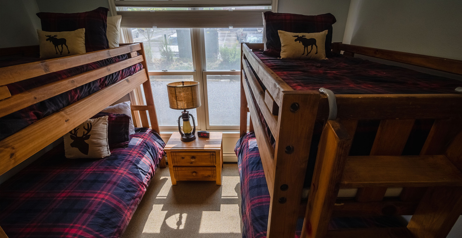 The master suite is on the upper level of the home and has a king bed and a private bathroom. The other three guest bedrooms are on the ground level. The bedroom with two twin beds and the bedroom with two sets of twin bunks share one bath and the third bedroom on this level has a King sized bed and a private bath. Access to the private outdoor hot tub is through this bedroom.