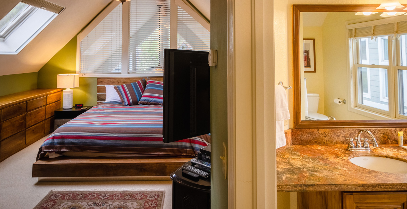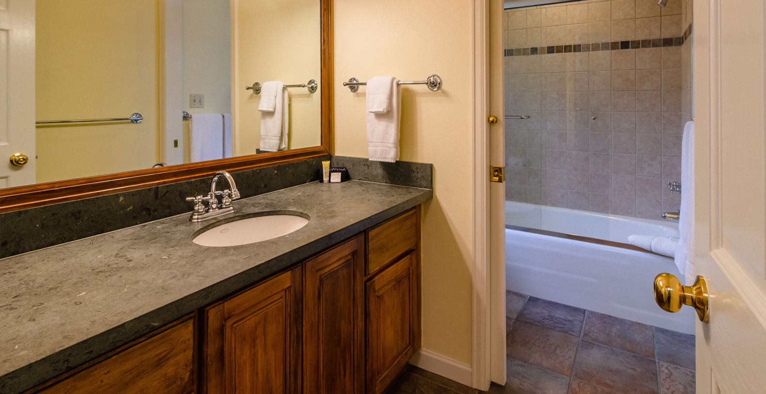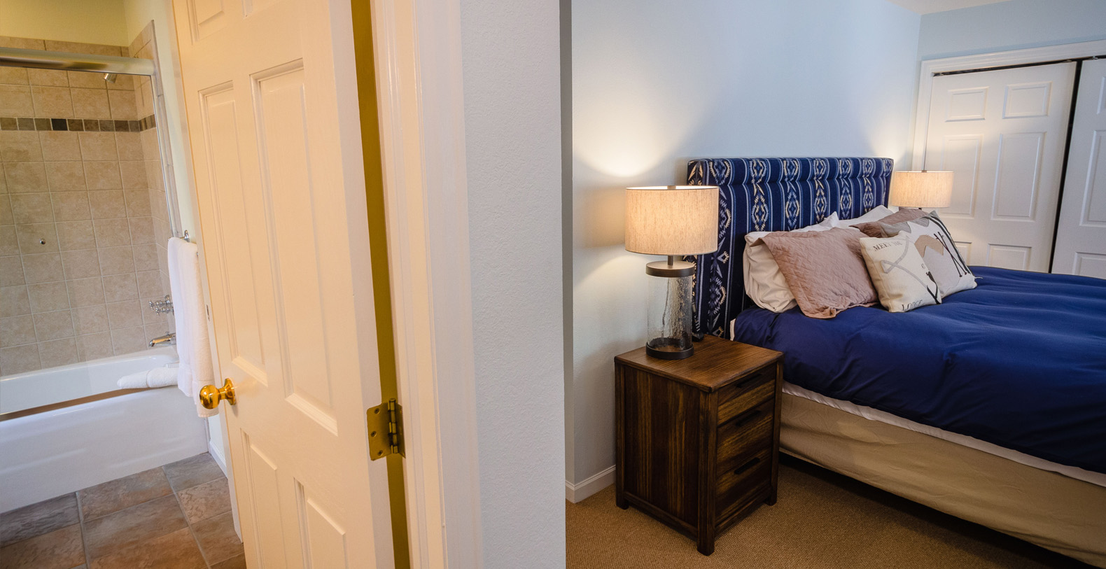 The master suite is on the upper level of the home and has a king bed and a private bathroom. The other three guest bedrooms are on the ground level. The bedroom with two twin beds and the bedroom with two sets of twin bunks share one bath and the third bedroom on this level has a King sized bed and a private bath. Access to the private outdoor hot tub is through this bedroom.