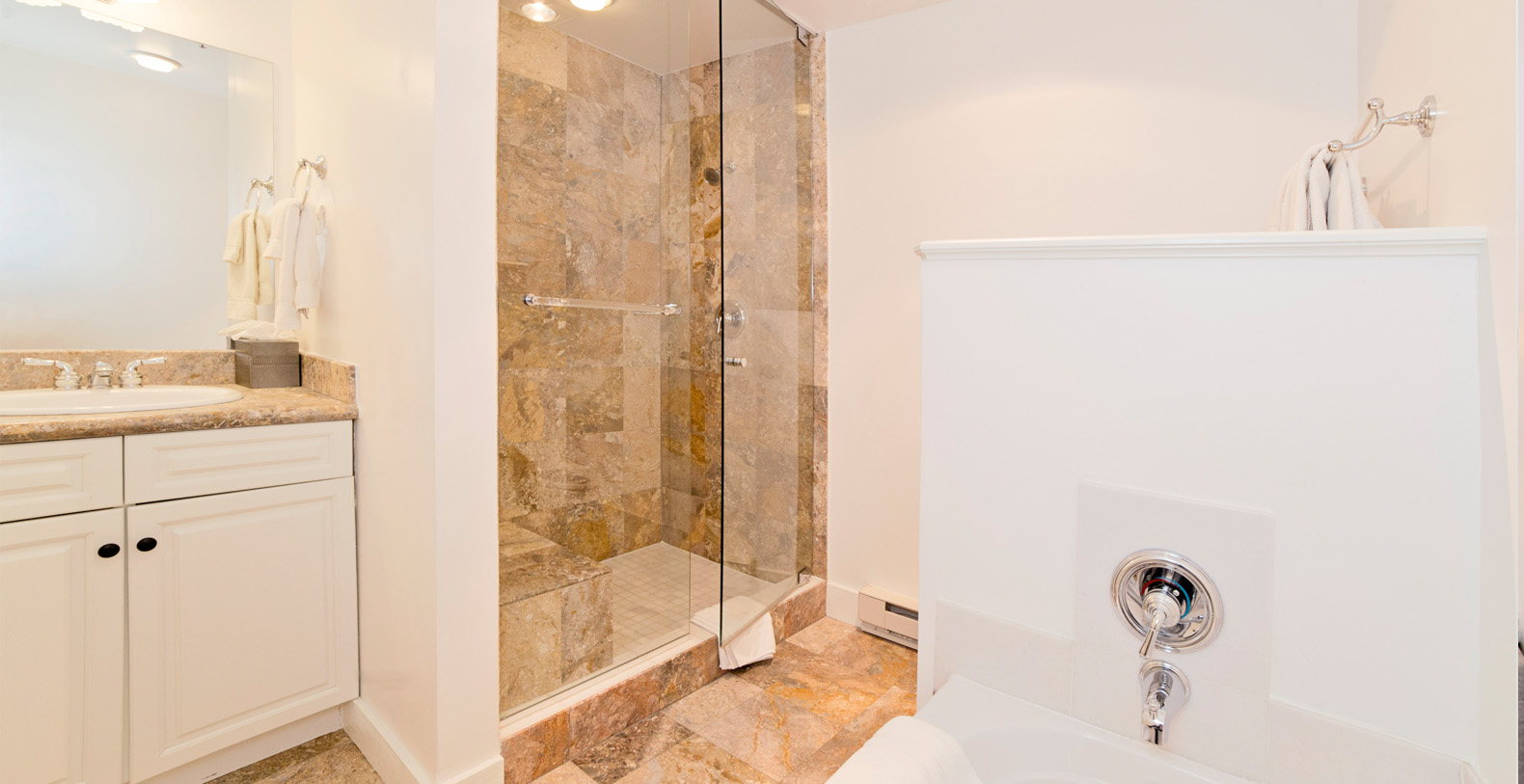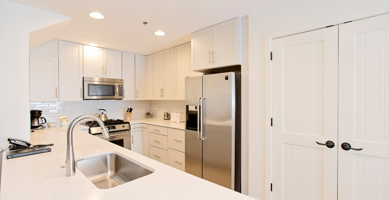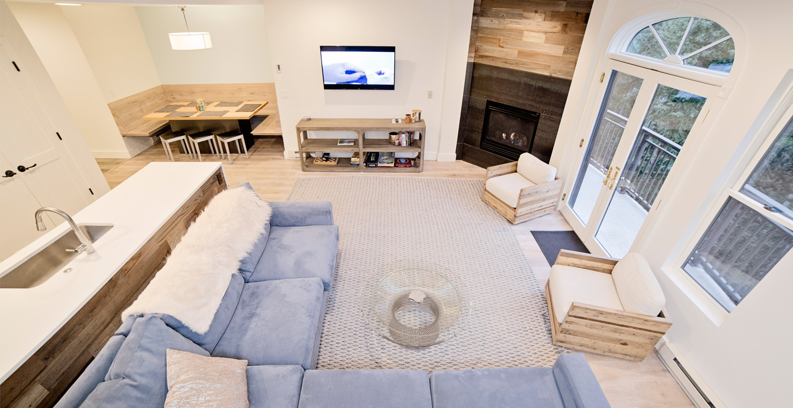 Enter this condo on the 4th floor and walk into the completely modern and open dining area and living room with a gas fireplace, flat screen TV and balcony facing the mountainside (forest view). The living room is open to the kitchen with granite countertops and large, stylish sectional sofa.