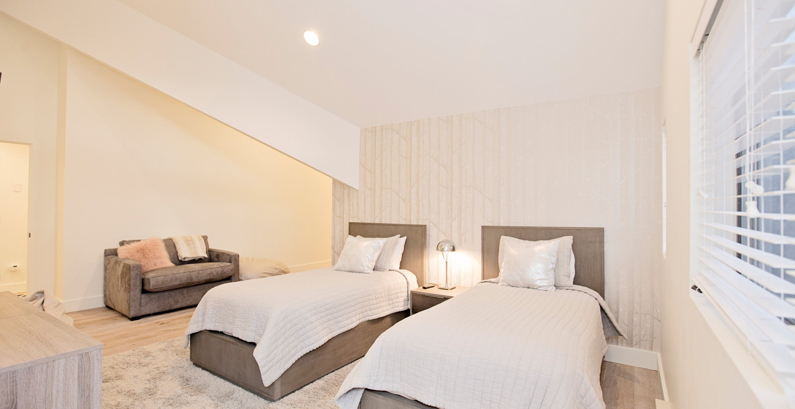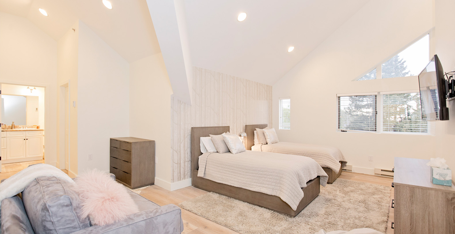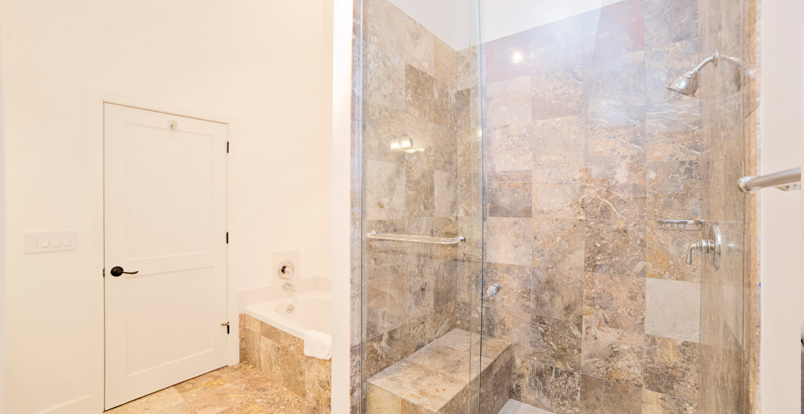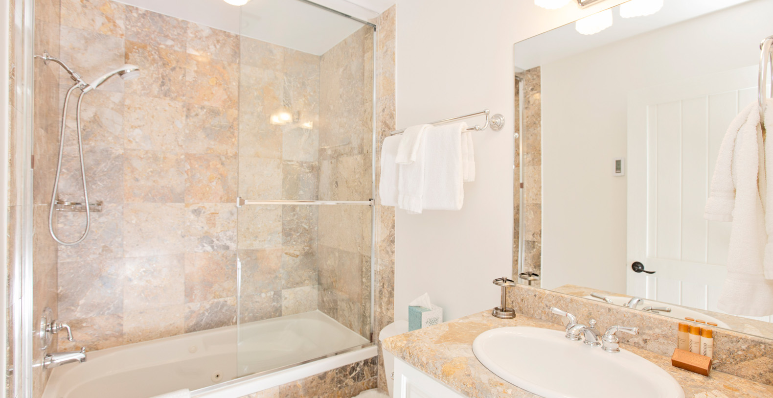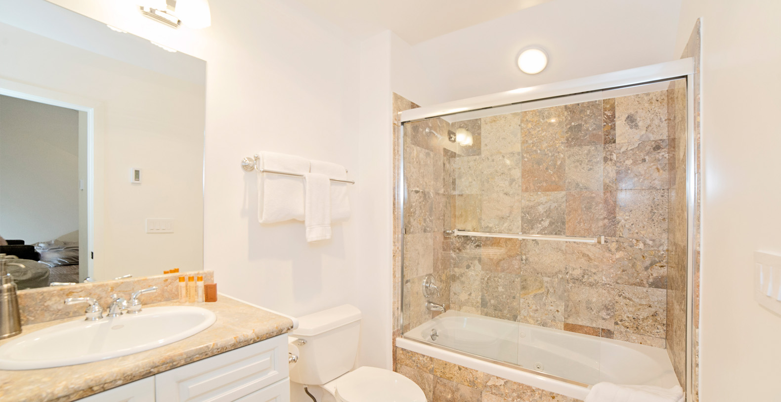On the main level is a bedroom with a king bed, TV and an ensuite bathroom with jetted tub and separate shower. The 2nd bedroom on the main level has a king bed that can be split into two twins, TV, and a bathroom in the hallway with shower/tub combo. Upstairs is the master bedroom with a king bed, TV, walk-in closet and ensuite bathroom with double sinks, jetted tub and separate shower. There is also a safe in the master bedroom. On this floor is another bedroom with king bed that can be split into two twins, a queen sleeper sofa, TV, walk-in closet and ensuite bath with jetted tub and separate shower.