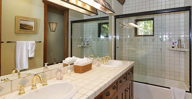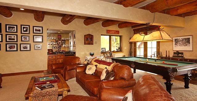 C Forever Lodge is a classic western ski lodge with direct ski in/ski out access on to the Galloping Goose ski run. This 5 bedroom home can sleep 10 guests over 3 spacious level. The main level of the home features a huge great room with cathedral widows. These windows have stunning, sun filled views to the west. There is a stone fireplace surrounded by a comfortable lounge area, another seating area and access out on to a large deck. There is a full gourmet kitchen as well as a dining table for 12 guests. On this level, there is also a half bathroom. There is a king guest suite off to the side of the great room, with it's own private bathroom. There is also a ski room, through which guests can access a second outdoor deck with a hot tub and direct slope access. The upper level of the home has 3 guest suites – the king master suite, and 2 queen guest suites. Each suite has it's own private bathroom and a flat screen TV. Above the master is a loft area with some exercise equipment. There is a 5th guest suite on the lower level of the home with a king sized bed and private bathroom. Downstairs on the lower level is a games room with a pool table, mini bar and a flat screen TV. In summer months, the games room has french doors opening onto a wonderful grass area.